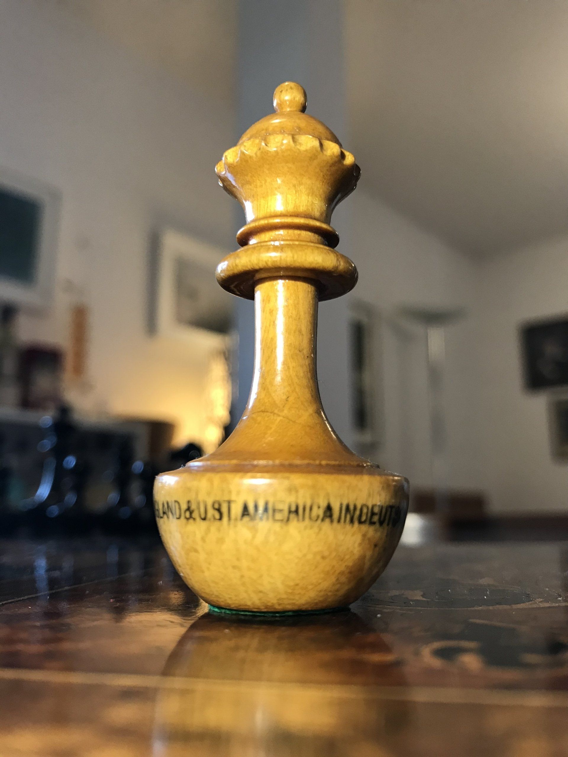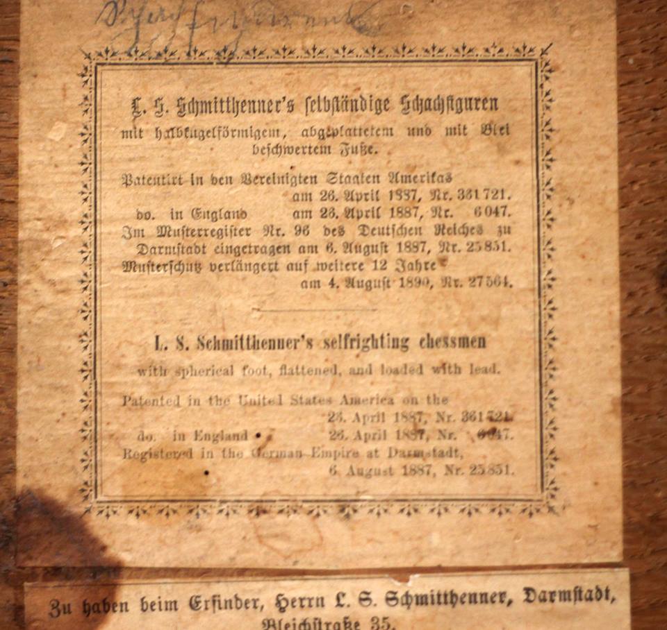 The Queen bears the inscription "L.S.Schmitthenner's Patent in England & U.St. America in Deutschland Mustersch.". This is referring to the patents granted for this particular design. A copy of the original US patent including several drawings and a written specification is shown in the pictures. The application for the US patent was filed on 9 December 1886 and the patent was licensed under no. 361,721 on 26 April 1887 and on the same day in England under no. 6047. The particulars of the German patent ("Musterschutz") are a bit unclear. According to a photo of an original label which I found on the internet, the patent was licensed on 6 August 1887 and registered under no. 25851 in the German Empire's patent register no. 36 in Darmstadt. According to a second label, which must be of a lter date, as it already refers to a prolongation of the German patent for an additional 12 years licensed on 4 August 1890, a photo of which was provided to me courtesy of Frank Camaratta, the original patent was granted already on 6 August 1887.