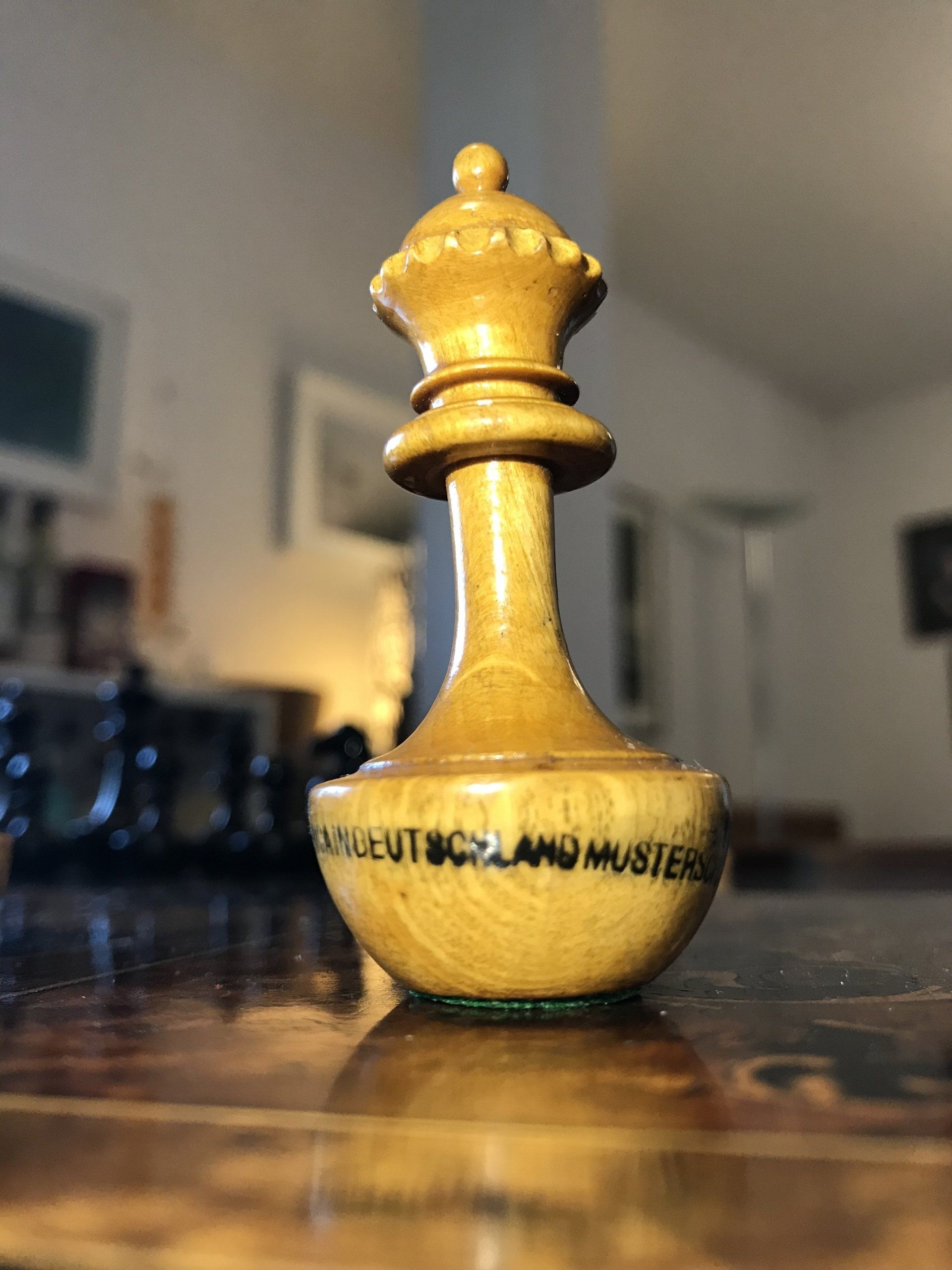 There are more issues not entirely clear and I hope to find out more about the sets in the future. The patent shows a different non-Staunton design of the King. This is supposedly the earliest form under which this set was distributed. In their catalogue of the exhibition "Schachpartie durch Zeiten und Welten", which was held from 5 May to 28 August 2005 in the Museum für Kunst und Gewerbe in Hamburg/Germany, Professors Barbara & Hans Holländer show a Schmitthenner set with Kings in the Staunton design similar to the set shown here, but with a different Knight with an elongated neck. In addition, in their corresponding notes, they make reference to a sales prospectus of Schmitthenner, according to which the set was available in three sizes, i.e. with a King size of 6.5 cm, 7.5 cm and 9 cm. Further, the afore mentioned label shows a hand written number which suggests that a limited number of only 250 sets was produced of these sets. It is unclear, however, if this refers only to the non-Staunton type or if this includes already the other sizes / types of the set.