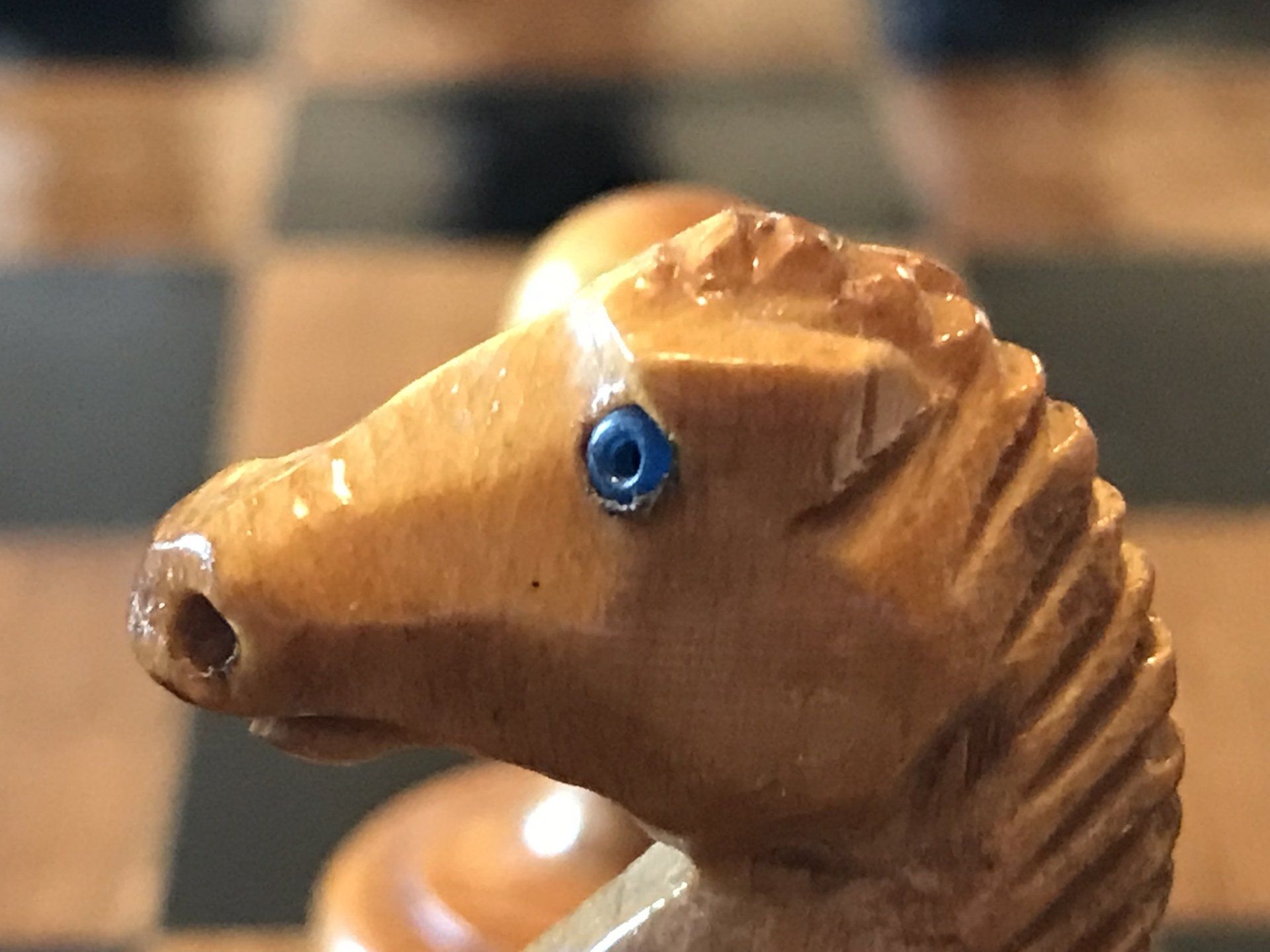 A rather special German set by Schmitthenner with a King size of approximately 75 mm (i.e. a tad short of 3"). They are made of boxwood, one side natural, the other side stained black. The chess pieces are designed in the Staunton pattern. The Knights have eyes in the form of a small inlaid ring of some unknown material, probably a small metal ring. The bases of the pieces are ovoid shaped but with a flat bottom covered by felt. The bases are filled with lead, which provides for the pieces to retain an upright position, even if moved or accidentally knocked over, hence their description as "self-righting" chessmen. They were particularly popular in the UK and the US, where they were referred to as "roly-poly-sets". Sets like this have also been sold under the description "ship's chess sets", as it is assumed that they were, inter alia, used on ships as they provided some basic stability even when waves rolled the ships.