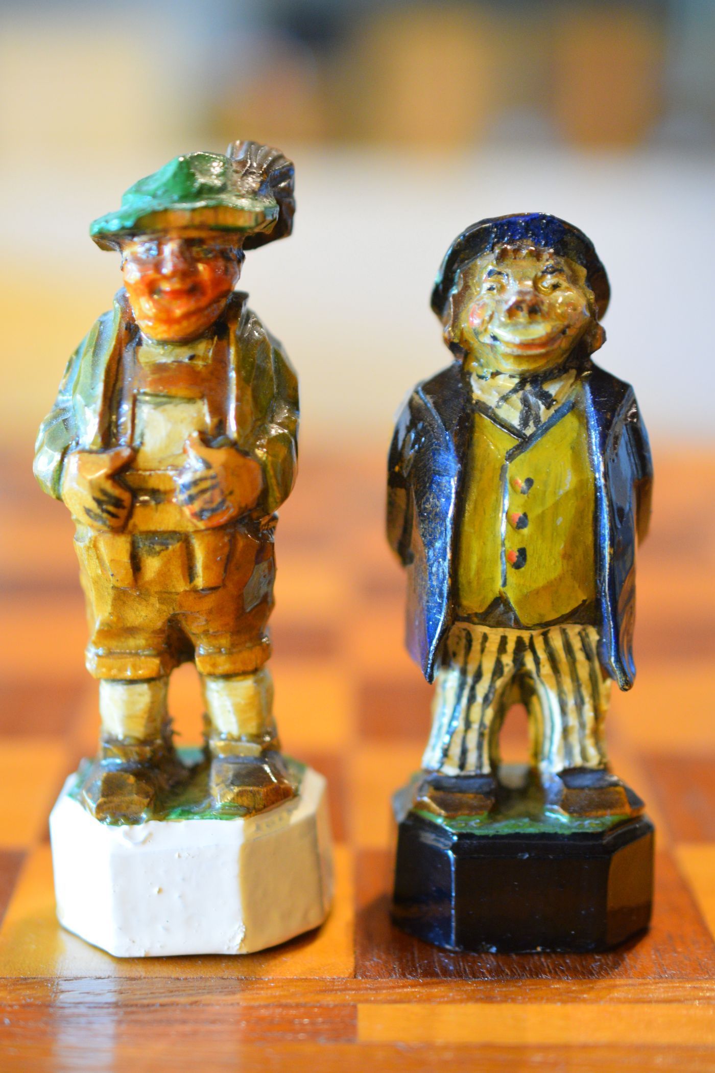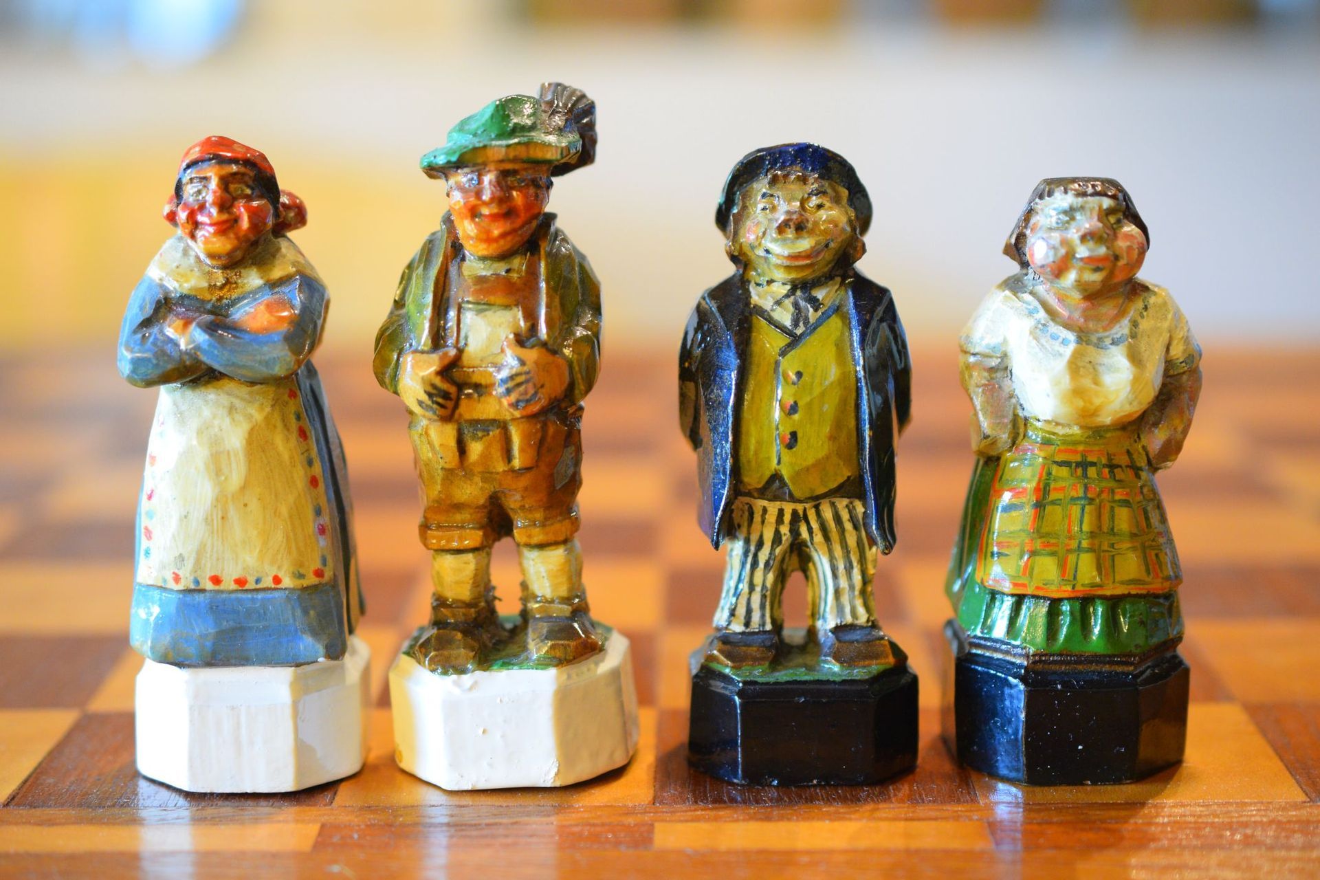 A special hand-carved chess set from Bavaria, which bears the signature of the Upper Bavarian carvers from Oberammergau and is particularly similar to the style of Edo Lang, who often made caricature-like figures in traditional costumes.