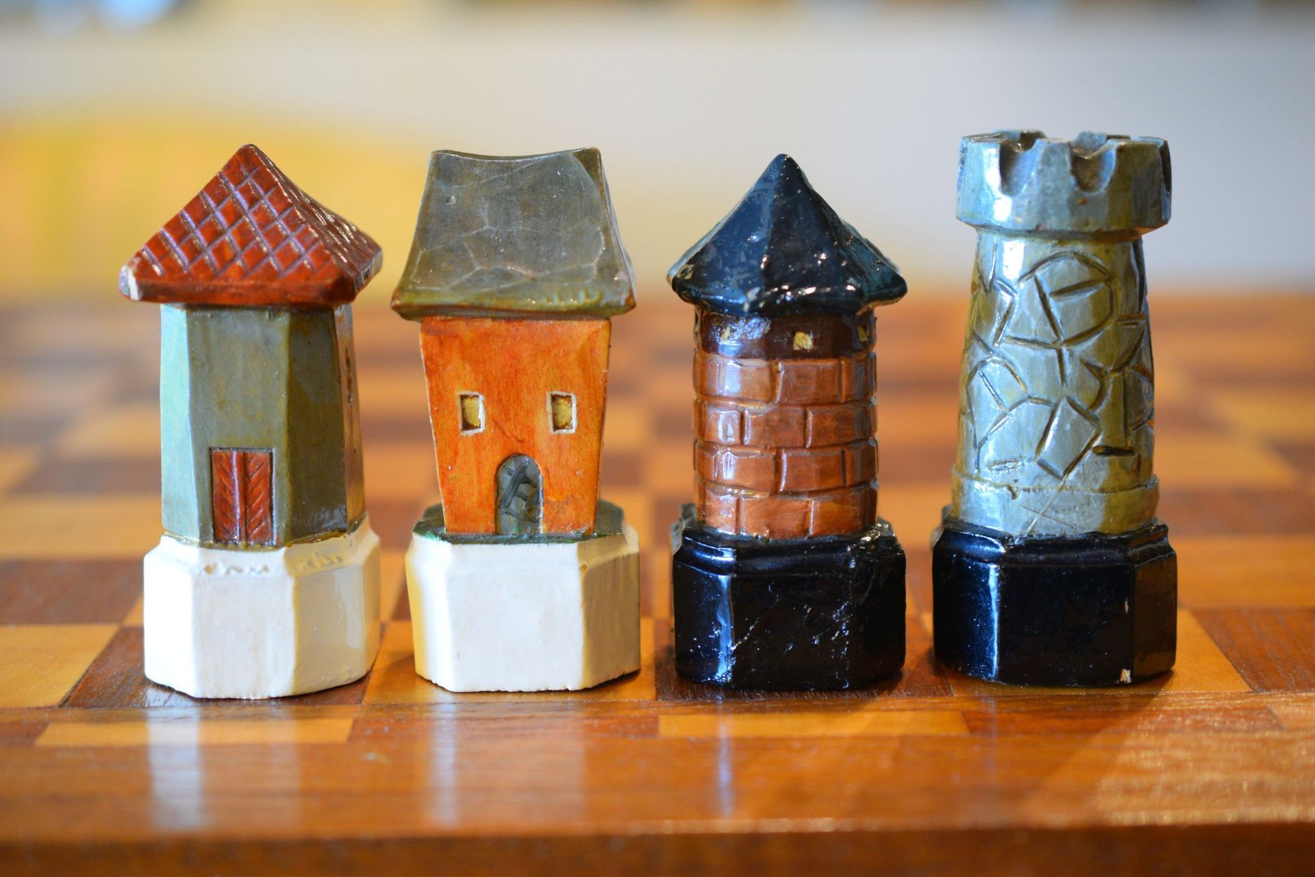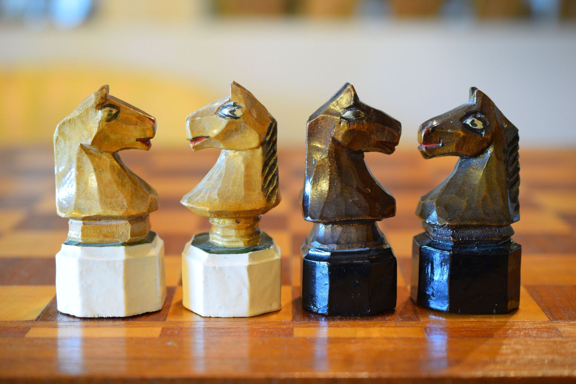 The pieces are carved from wood. The height of the king is 10 cm. In most chess sets, the knights are the most spectacular pieces. Here it is the other way round. With the exception of the knights, all the pieces are individual and different, only the knights are all carved in the same style.