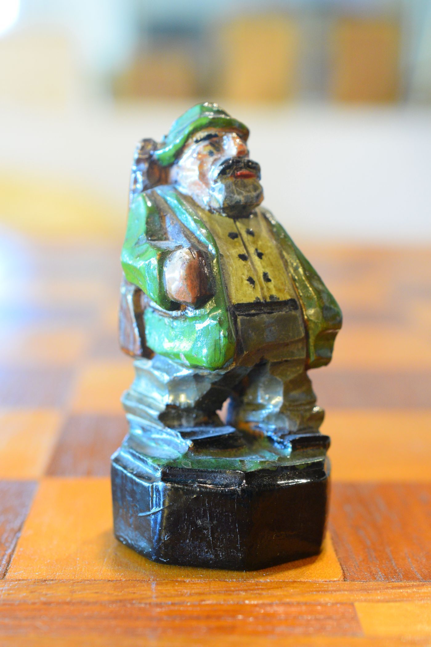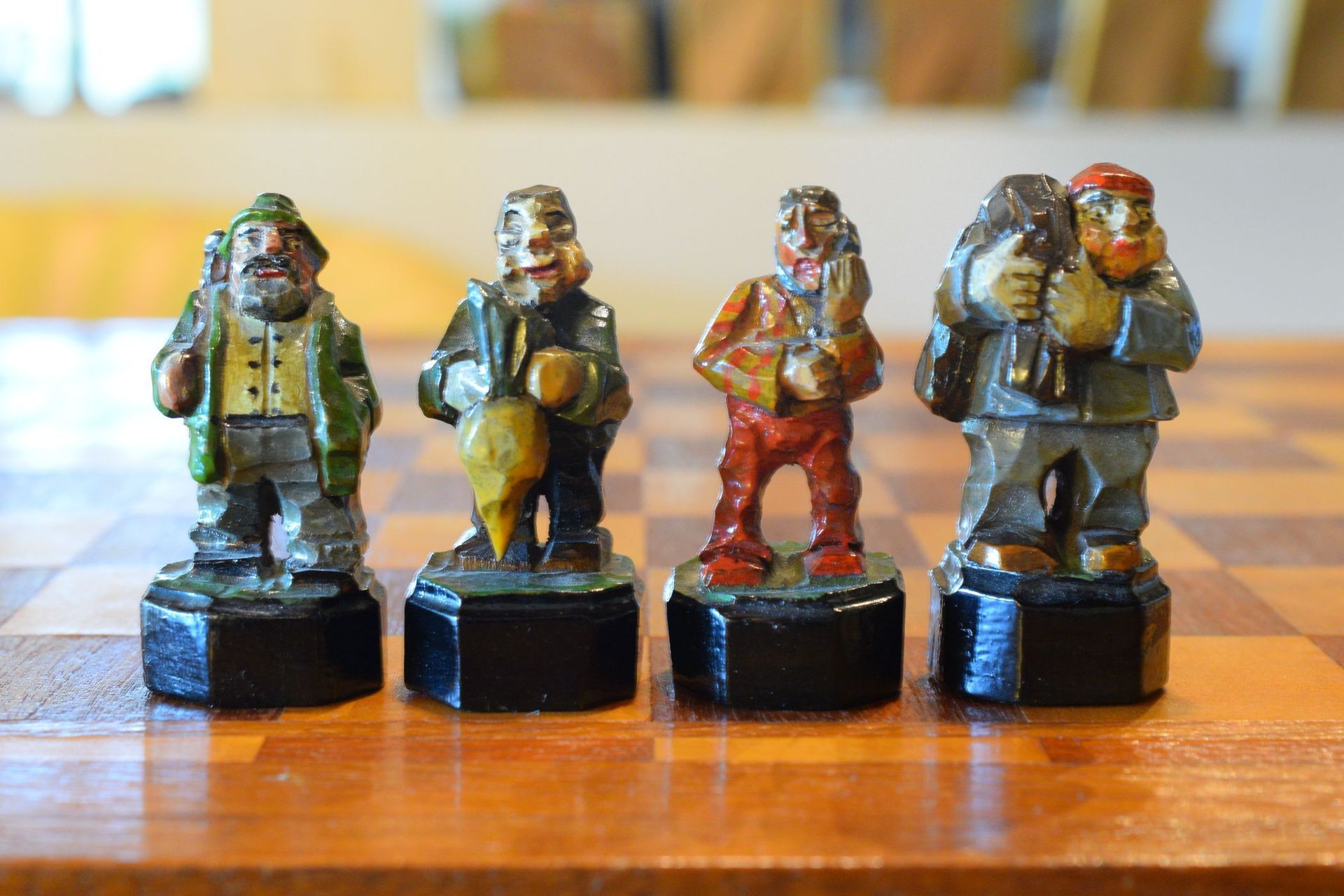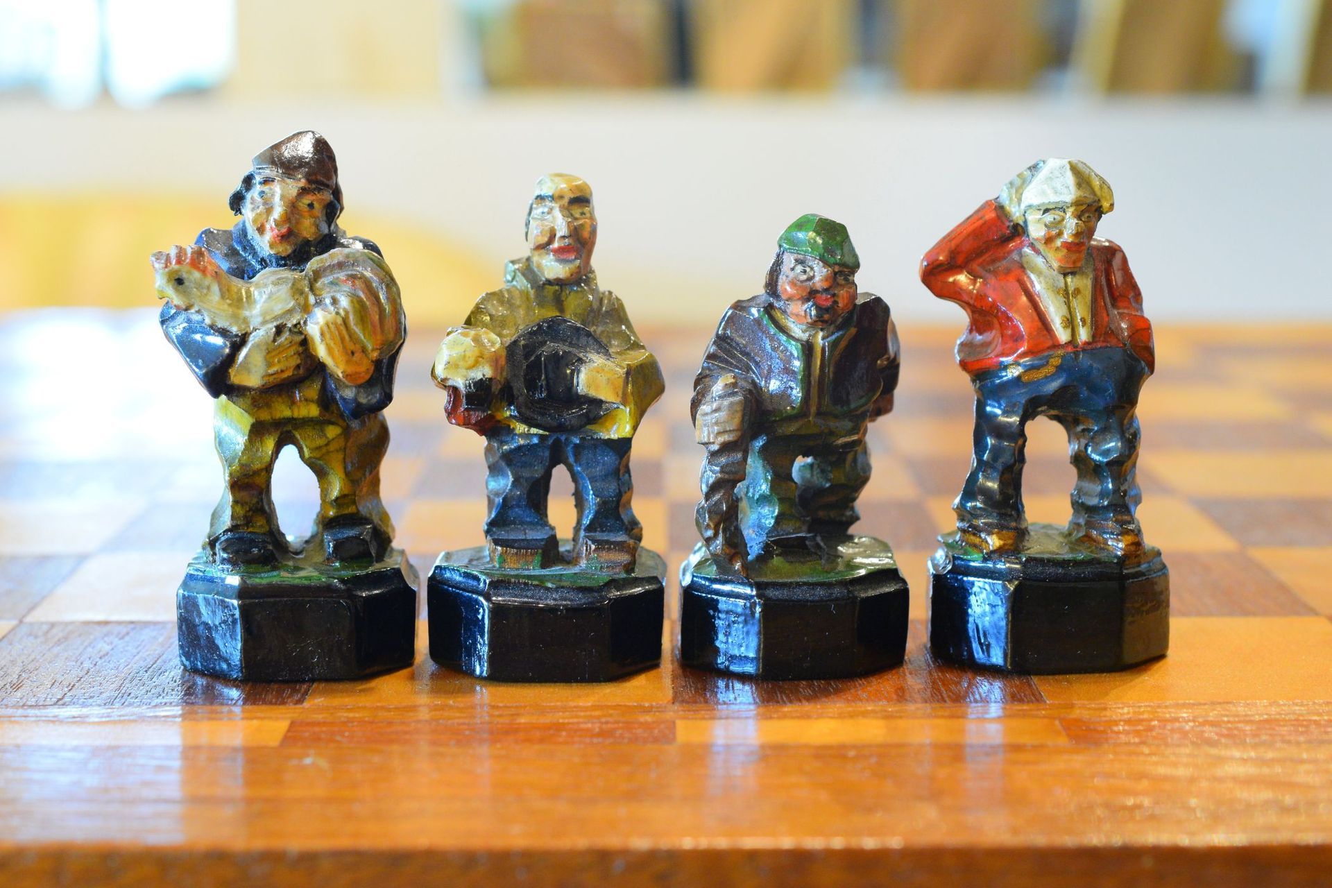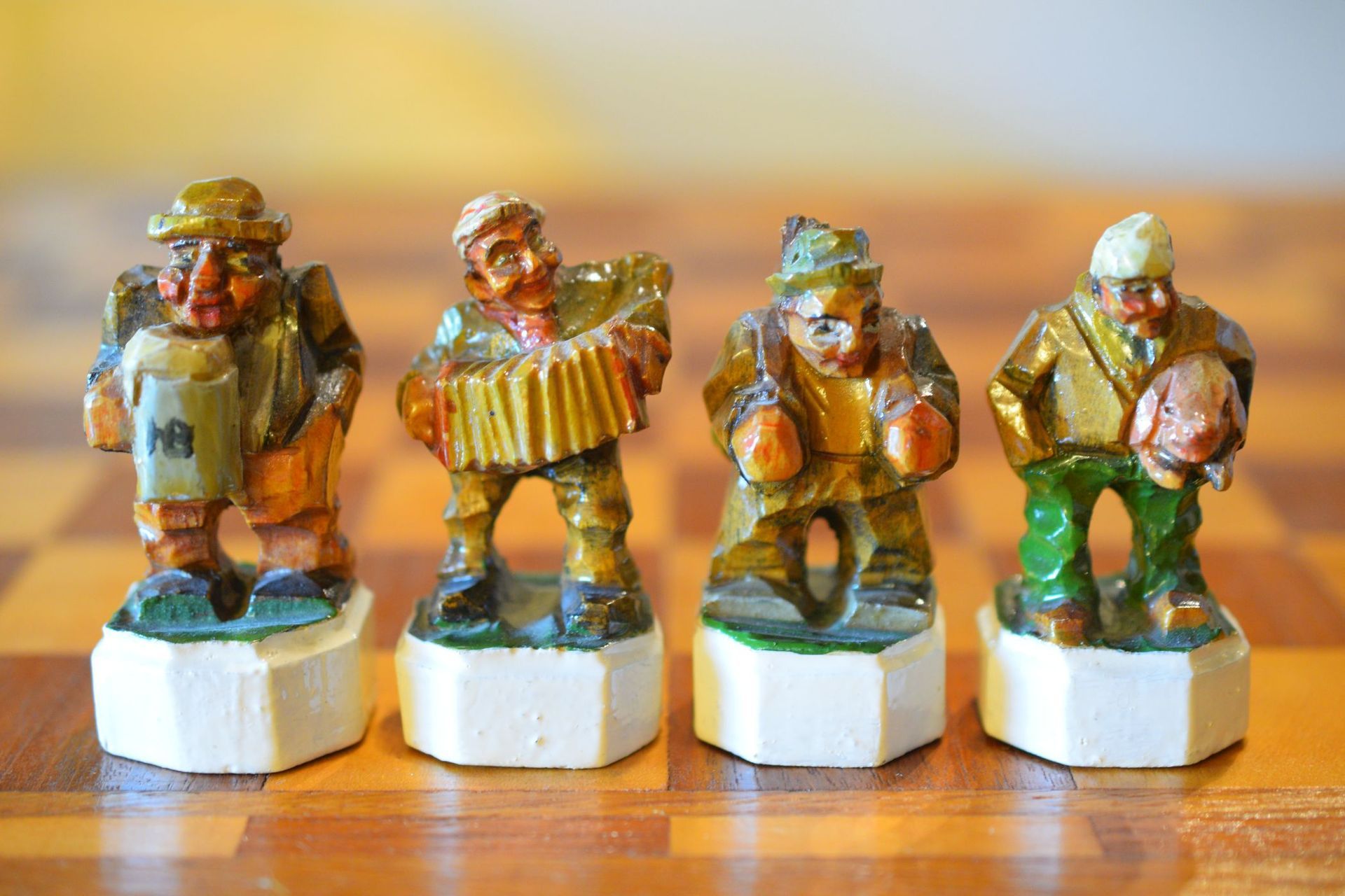 The white king and queen wear traditional Bavarian costumes typical of the rural population. The black king with his fine frock coat and striped trousers looks more urban and bourgeois. The white rooks are square with pointed roofs, the black rooks are round. The bishops on the white side consist of a policeman with a club and a night watchman with a bell, both in matching uniforms. The black bishops are a postman with an envelope in his hand and a guard soldier with a drawn sabre in his right hand. The pawns on both sides are so marvellous and individual that I photographed them separately. On the white side, there is a man with a pipe, a traveller with a suitcase, a hiker with a rucksack on his back, a farmer with a pig under his arm, a musician with an accordion and - in keeping with the Oktoberfest - a man in traditional costume with a beer mug in his hand, which is adorned with the ‘HB’ for the Munich Hofbräuhaus. On the black side, there is a farmer carrying a chicken, a hunter with a shouldered rifle, a farmer with a large turnip in his hand and a man with a toothache, recognisable by the cloth wrapped around his cheek. One of the most beautiful hand-carved sets I have ever seen from southern Germany.