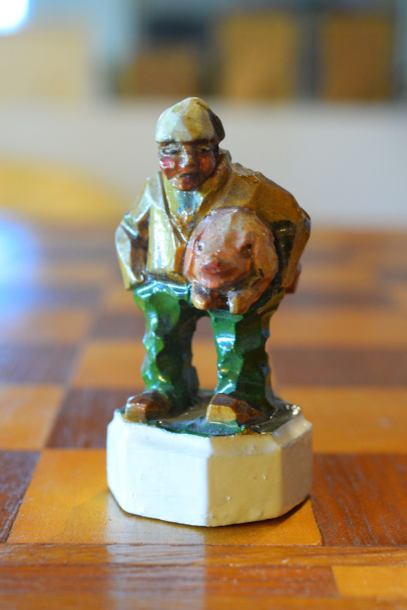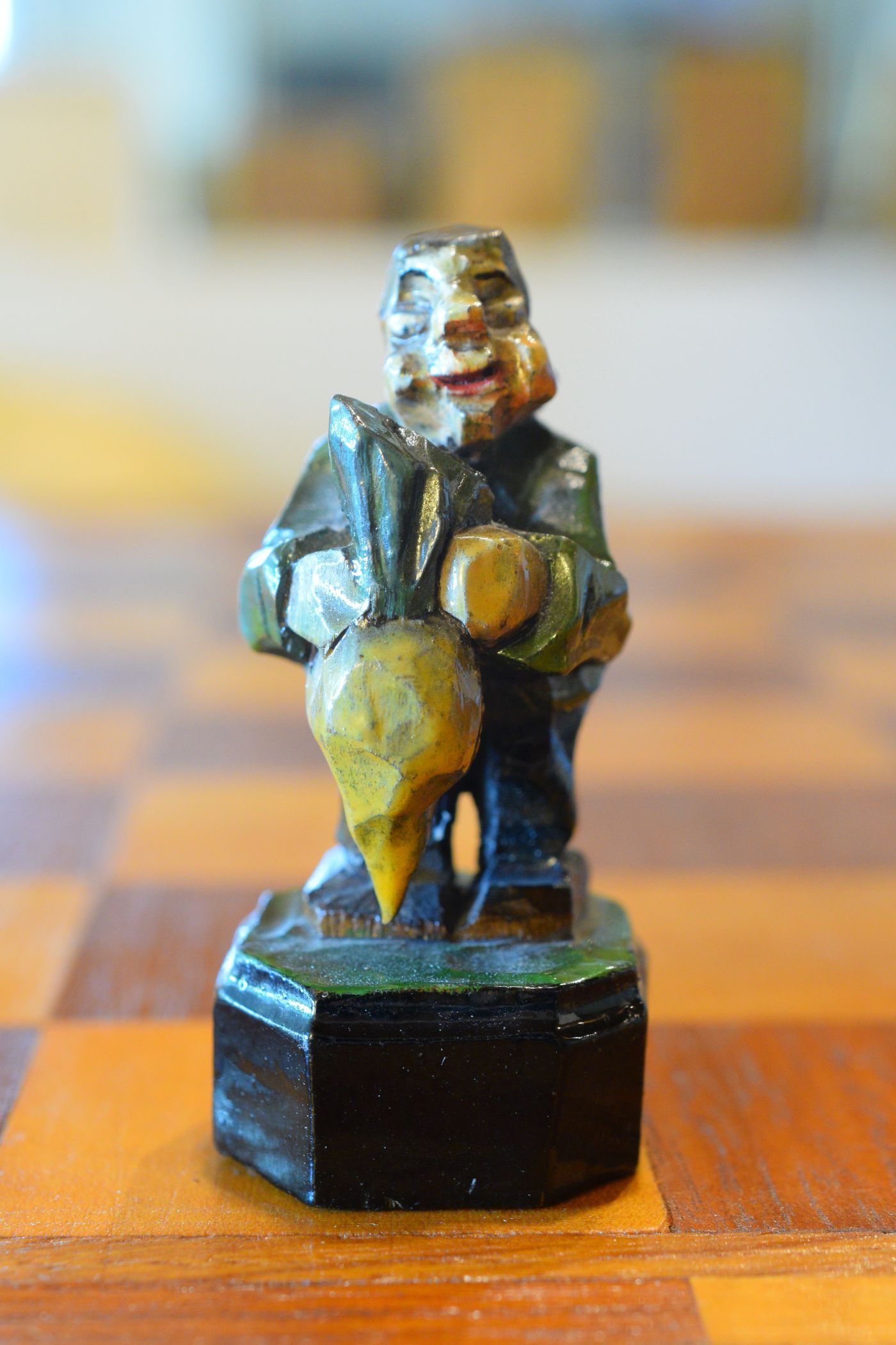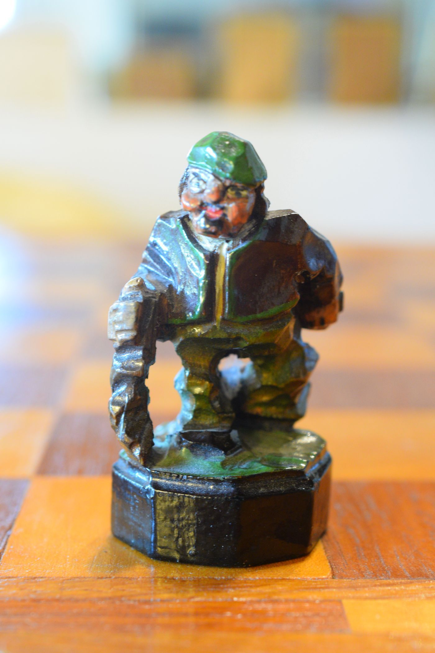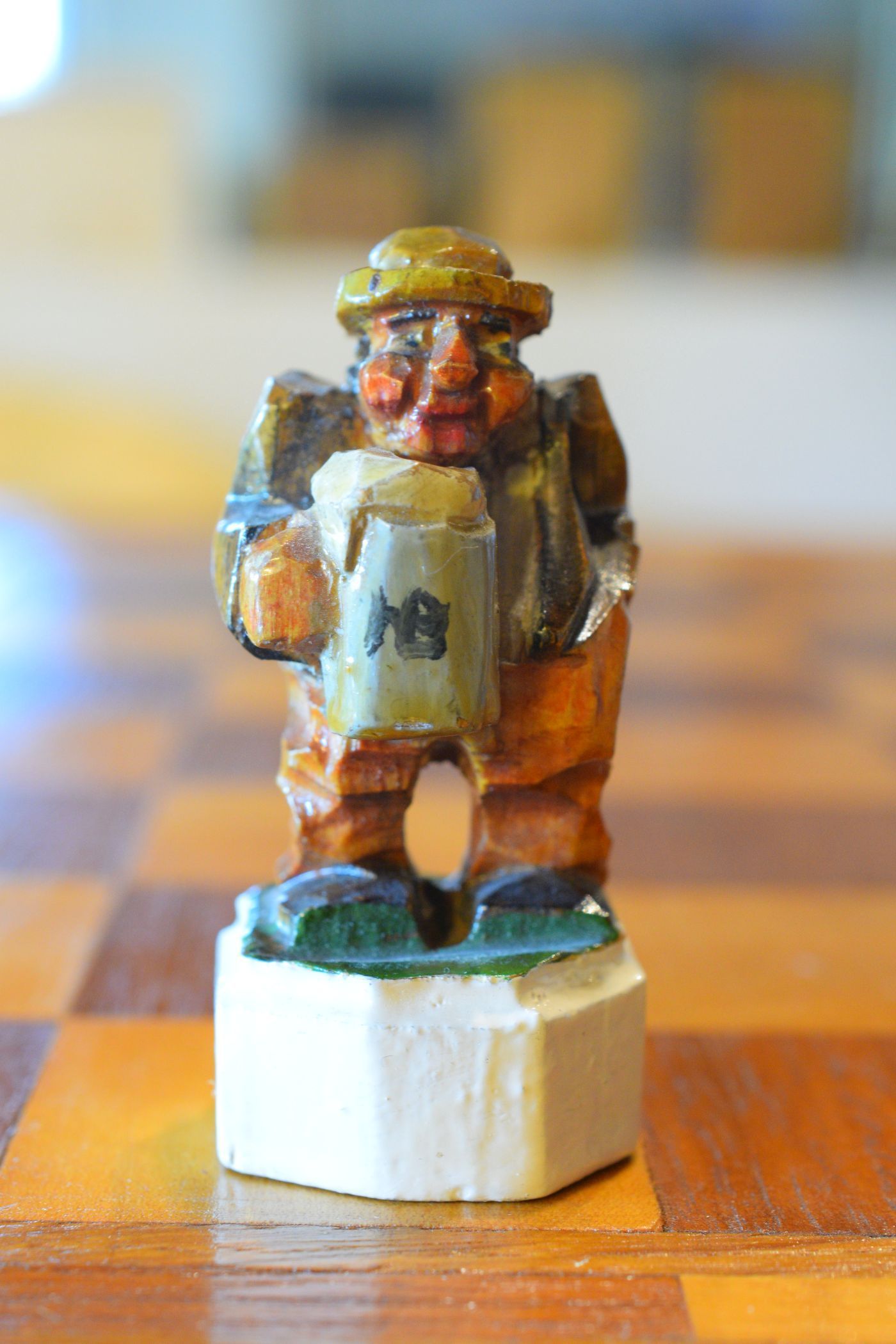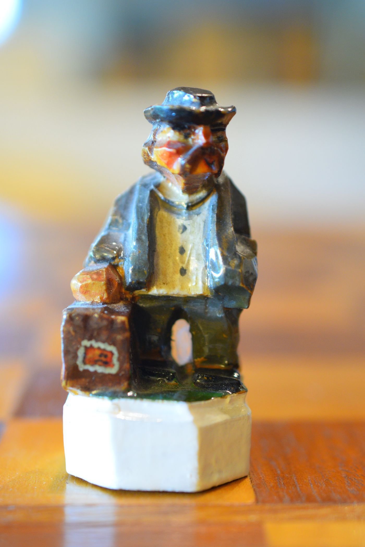 The white king and queen wear traditional Bavarian costumes typical of the rural population. The black king with his fine frock coat and striped trousers looks more urban and bourgeois. The white rooks are square with pointed roofs, the black rooks are round. The bishops on the white side consist of a policeman with a club and a night watchman with a bell, both in matching uniforms. The black bishops are a postman with an envelope in his hand and a guard soldier with a drawn sabre in his right hand. The pawns on both sides are so marvellous and individual that I photographed them separately. On the white side, there is a man with a pipe, a traveller with a suitcase, a hiker with a rucksack on his back, a farmer with a pig under his arm, a musician with an accordion and - in keeping with the Oktoberfest - a man in traditional costume with a beer mug in his hand, which is adorned with the ‘HB’ for the Munich Hofbräuhaus. On the black side, there is a farmer carrying a chicken, a hunter with a shouldered rifle, a farmer with a large turnip in his hand and a man with a toothache, recognisable by the cloth wrapped around his cheek. One of the most beautiful hand-carved sets I have ever seen from southern Germany.