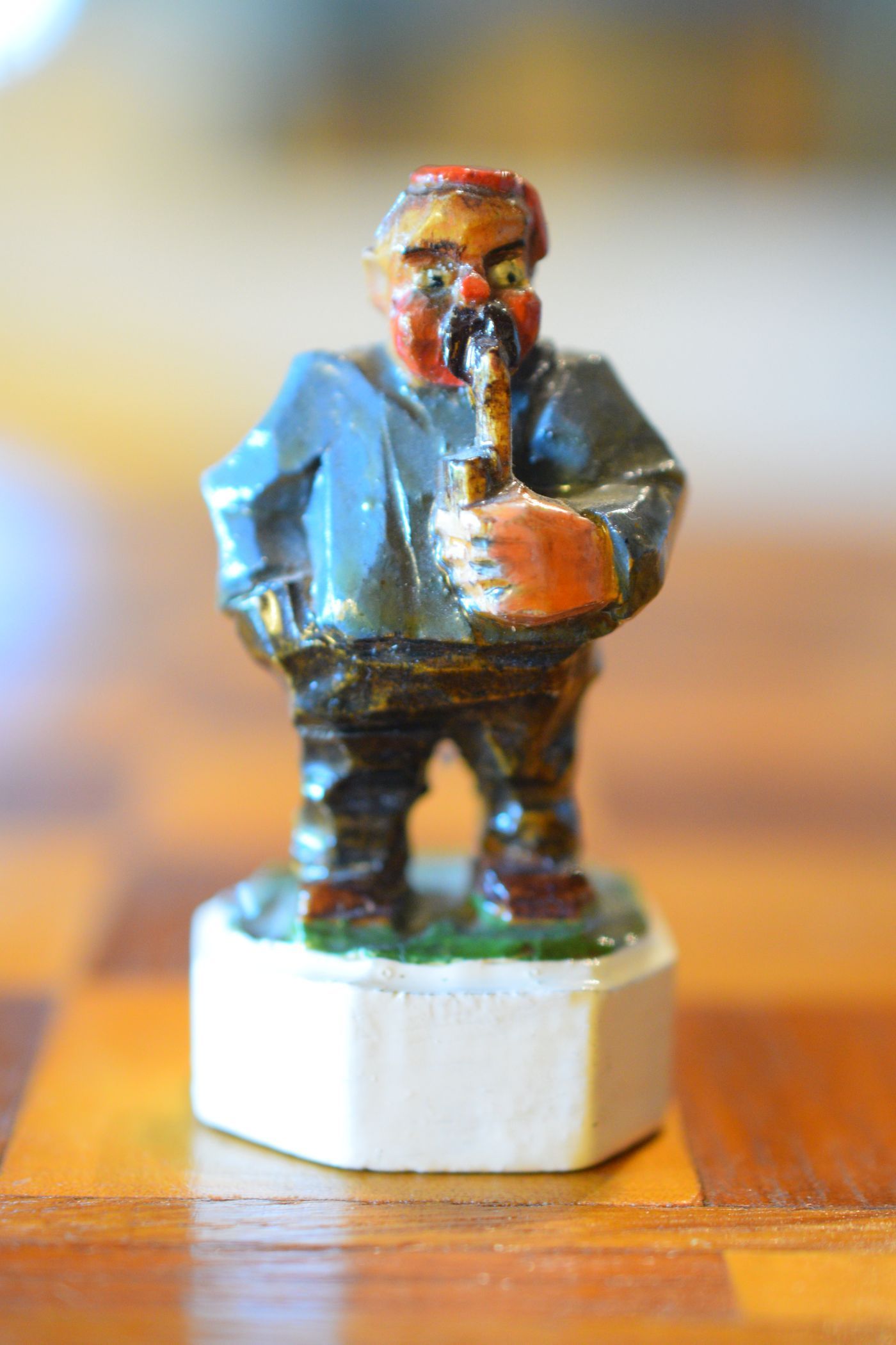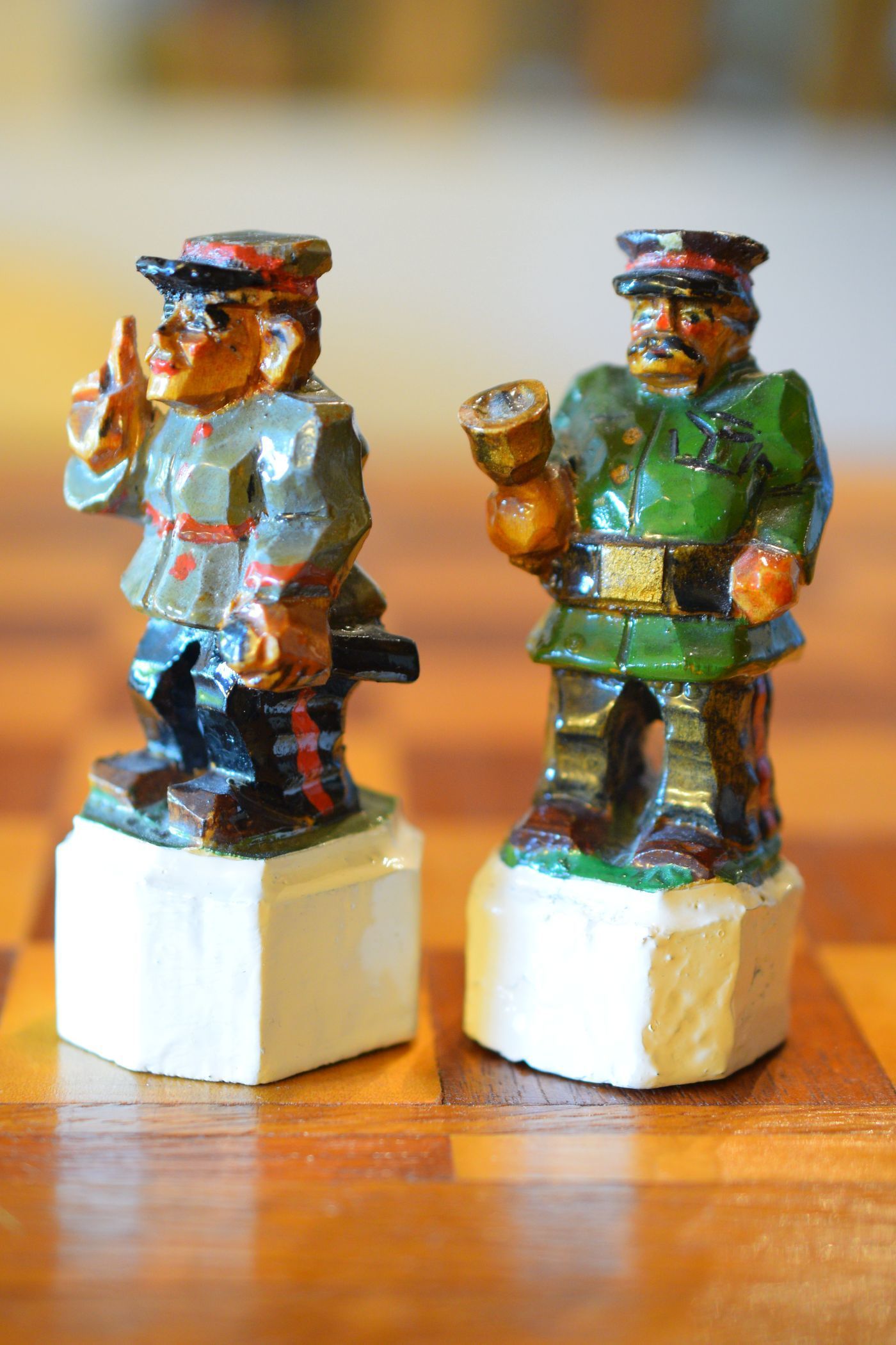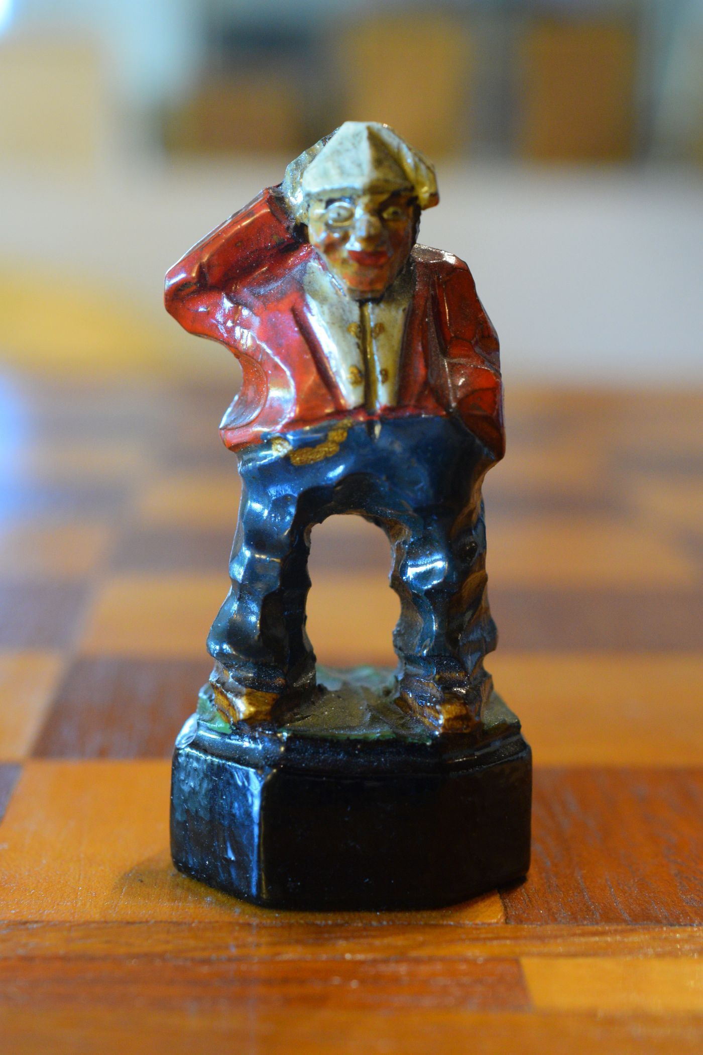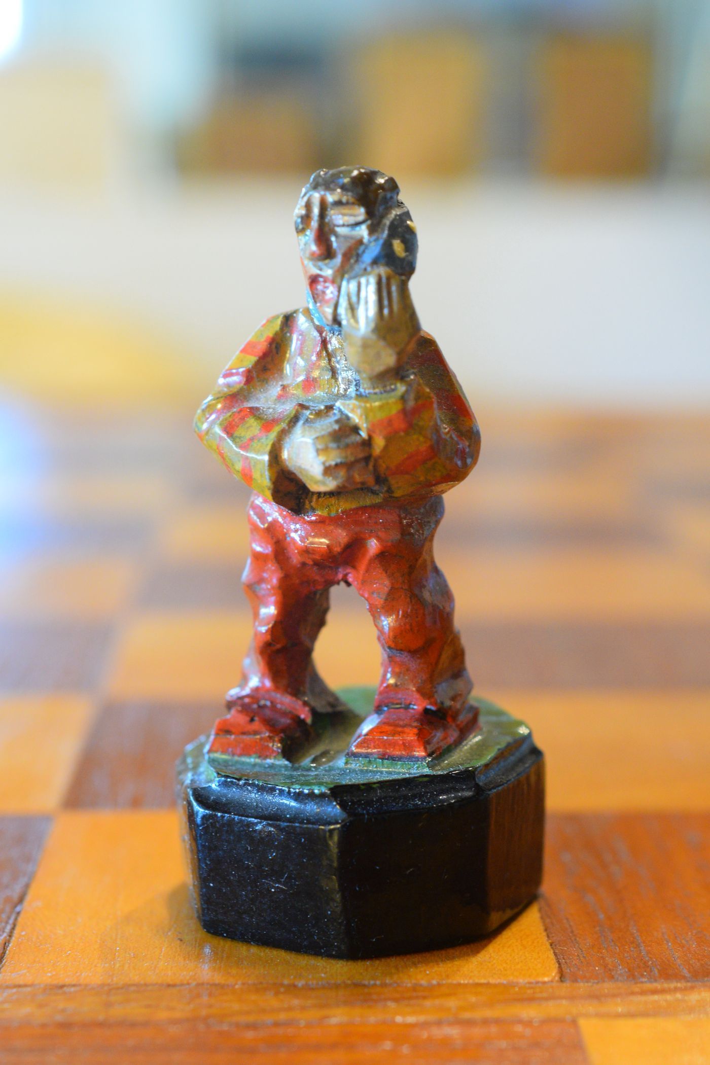 The white king and queen wear traditional Bavarian costumes typical of the rural population. The black king with his fine frock coat and striped trousers looks more urban and bourgeois. The white rooks are square with pointed roofs, the black rooks are round. The bishops on the white side consist of a policeman with a club and a night watchman with a bell, both in matching uniforms. The black bishops are a postman with an envelope in his hand and a guard soldier with a drawn sabre in his right hand. The pawns on both sides are so marvellous and individual that I photographed them separately. On the white side, there is a man with a pipe, a traveller with a suitcase, a hiker with a rucksack on his back, a farmer with a pig under his arm, a musician with an accordion and - in keeping with the Oktoberfest - a man in traditional costume with a beer mug in his hand, which is adorned with the ‘HB’ for the Munich Hofbräuhaus. On the black side, there is a farmer carrying a chicken, a hunter with a shouldered rifle, a farmer with a large turnip in his hand and a man with a toothache, recognisable by the cloth wrapped around his cheek. One of the most beautiful hand-carved sets I have ever seen from southern Germany.