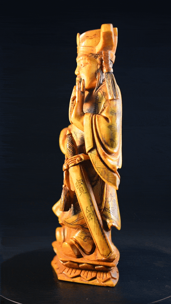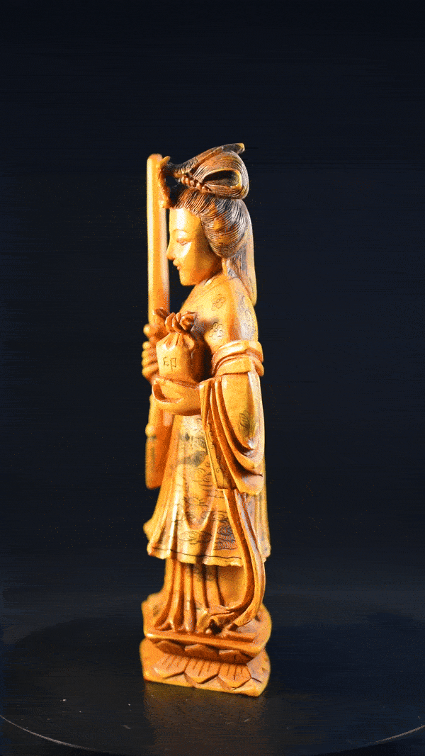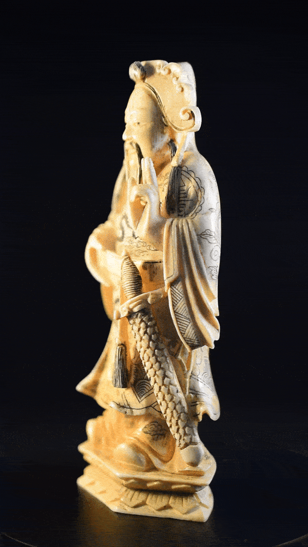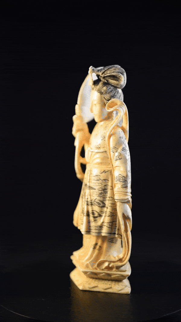 Here is a very special chess set of Chinese origin. The pieces were carved from ivory, one side natural, the other side tea stained, the kings, queens and bishops with additional black ink highlights. Particularly impressive are the kings and queens, which are massive pieces carved from single blocks of ivory. The kings have an impressive size of 16 cm and a weight of 350 grams. The white king is shown as a Chinese aristocrat or official carrying a sword on his belt. His left hand is raised in the so called “sword gesture” (剑指). He is wearing a headdress resembling a Chixiao mao (鴟鴞帽), a so-called owl hat, which is surprising as this type of headdress is mainly known for children. The white queen is a female dressed in a gown holding up a fan in her right hand. The black king is depicted as an aristocrat or official also carrying a sword on his belt and raising the fingers of his left hand in the so-called Tao gesture (道指). He is wearing a headdress reminiscent of a Zhanjiao Putou (展角幞頭), lit. "spread-horn head cover", which was the headwear of Song dynasty officials. The black queen is a woman dressed in a gown carrying a raised sword in her right hand and a small bag in her left hand. The bishops are shown as Chinese counsellors, the knights as mounted horses with riders wielding a lance and the rooks as war elephants carrying a flagged turret with cannon and rider.