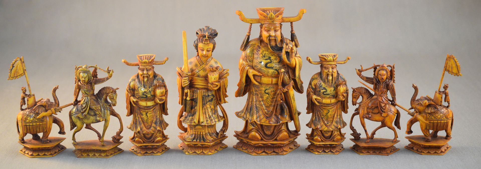 The real highlight of the set, however, are the pawns, which are depictions of the Eight Immortals, a group of legendary characters in Chinese mythology. Starting from the left, the first immortal is Zhongli Quan (鍾離權). He is usually depicted with his chest and belly bare and holding a fan made of feathers, which – in legend – can resurrect the dead and transform stones into silver and gold. The second from the left is Li Tieguai (李鐵拐), who is considered to be mentally disturbed and associated with medicine and easing the suffering of the sick and needy. He can be identified by his iron crutch and Calabash bottle, in which he is carrying his medicine. The third one from the left is Cao Guojiu (曹國舅), who is believed to be a descendant of Cao Bin, a general of the early Song dynasty, and a younger brother of Empress Cao, the wife of Emperor Renzong of the Song dynasty. Being regarded as the patron deity of acting and theatre, he is often depicted dressed in official robes and holding a paiban, a clapper made from several flat pieces of hardwood or bamboo, which is used in many different forms of Chinese music. The next one from the left I believe to be Zhang Guo, better known as Zhang Guolao (張果老). The epithet “Lao” added at the end of his name means “old”, which is symbolised here by his leaning on a staff. His emblem is a fish drum, a tube-shaped bamboo drum, which he is in this case carrying on his back. Pawn number five from the left is He Xiangu (何仙姑), who is easy to identify, as she is the only female in the group. She is shown carrying a lotus flower, which she is using to improve mental and physical health. The sixth pawn from the left is Lan Caihe (藍采和), who is the only one of the Eight Immortals whose gender is ambiguous. He is considered the patron deity of florists and gardeners, and hence can usually be recognised by carrying a basket of fruit or flowers. The second to last pawn from the left is Lü Dongbin (呂洞賓), a scholar and poet, who is said to have lived during the Tang Dynasty. He is considered to be the leader of the Eight Immortals and is often depicted dressed as a scholar carrying a sword to dispel evil spirits. The last pawn is Han Xiangzi (韓湘子). He is very easy to identify, as he is often depicted carrying a dizi (a Chinese flute), since he is also regarded as the patron deity of flutists. The former owner of the set acquired it in an auction by Sotheby’s in 1984, but even with the help of Sotheby’s archive, I was unfortunately not able to find out more details on the set’s provenance.