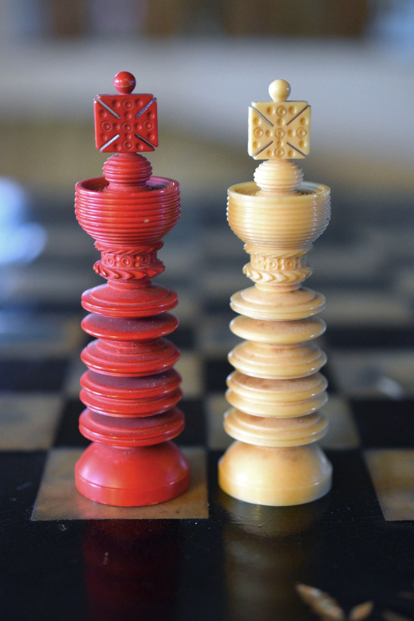 Ivory chess set with a king size of 9.5 cm from the workshop of William Lund in London, as is evident from the original stamp underneath the white king, which reads "William Lund, Maker, 24 Fleet Street". White pieces in natural ivory, the other side stained in red. The Kings with a cross pattée, the Queens with a fleur de lys finial. Knights carved in a manner typical for the Lund workshop.