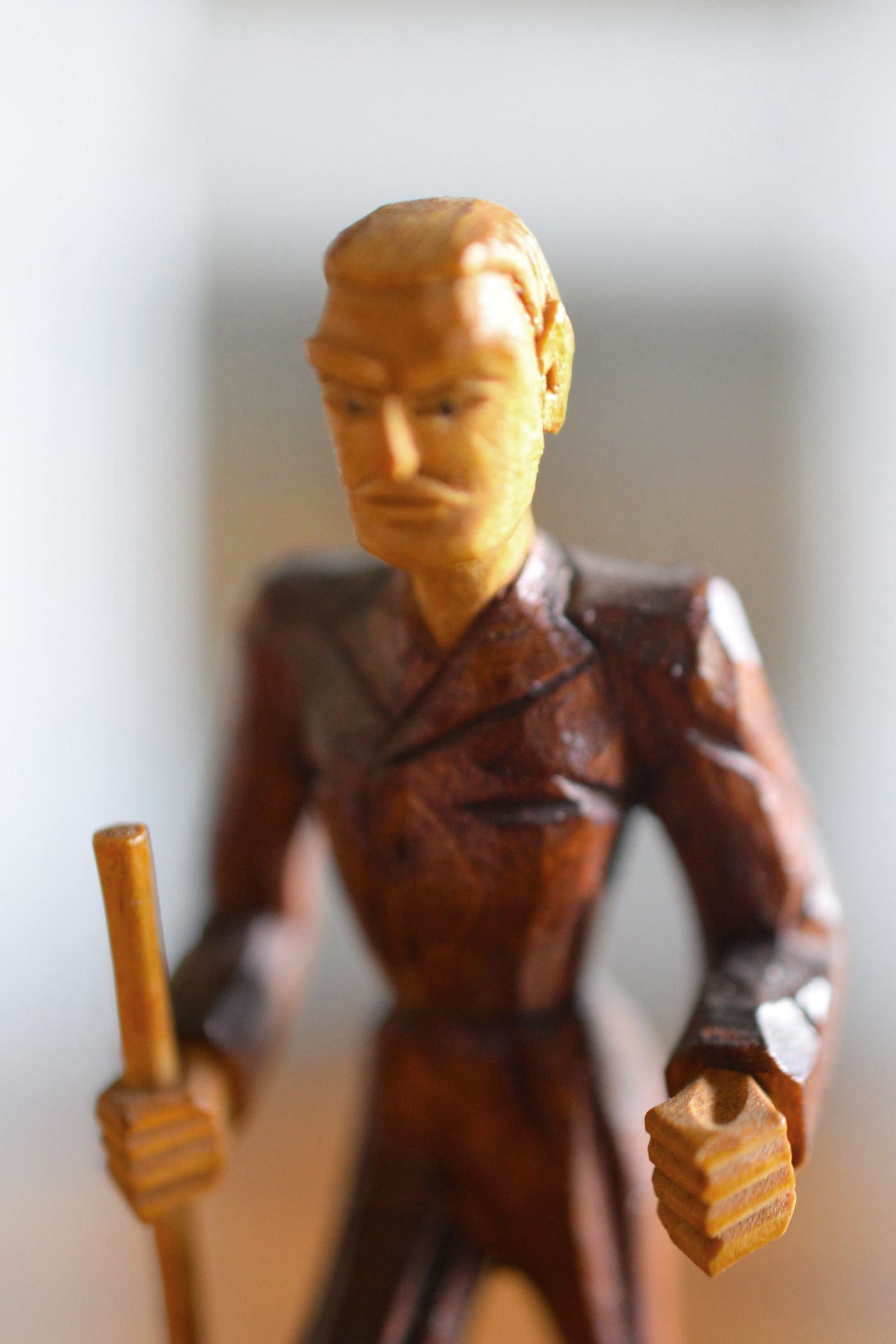 A figural chess set made in the Erzgebirge (Ore Mountain) region in South-East Germany in the second half of the 20th century. The pieces with a king size of 13.4 cm were carved with a lot of attention to detail in the traditional folk art style typical for this region from a rather light and soft wood, probably some type of pine. One side with a light yellowish lacquer, the other side predominantly lacquered in brown. The kings with an upright crown and large crosses in the Borstendorf style, wearing a robe and holding a long sword to the ground. The queens with a gown and wavy hair. The bishops as messengers holding a parchment (which indicates their connection to the German chess tradition in which the bishop is called "Läufer", which in this case means messenger). The knights as rearing horses. The rooks as multi tiered towers with windows and brickwork ornaments. The highlight are the pawns, which are shown as heavily bearded and grim looking armed peasants, each of which is made in a different style and carrying some kind of weapon, including axes, daggers, maces and scythes.