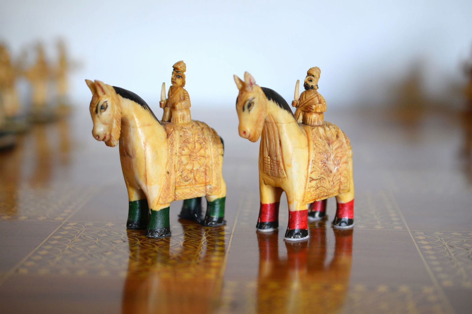 A figural chess set from Rajasthan, India. The pieces are carved from camel bone. The King size is 15 cm. The pieces are typical for traditional Indian chess sets with mounted elephants as kings and queens (vezirs), camels for bishops, horses for knights, smaller elephants for rooks and foot soldiers as pawns. Also traditional, in particular for chess sets from Rajasthan, is the colouring. One side is red, indicated by red bases and feet, the other side green with green bases and feet. The topic roughly follows the "Hindu vs Sikh" topic often seen in Indian sets, as the riders and foot soldiers of the red side are all bearded, which is often used to highlight the Sikh side of the chess sets. As can be seen on the pictures, the pieces are rather massive, especially the kings and queens carved as large mounted elephants with howdah. In order to produce such carvings, it was necessary to join a large number of camel bone plates together to form a solid block, from which the individual sculptures were then made. In view of the high density of camel bones, these pieces therefore have a considerable weight. Sets of this type are very rare and have occasionally been dated to the 19th century, but I think that sets of this type rather date to the first half of the 20th century.