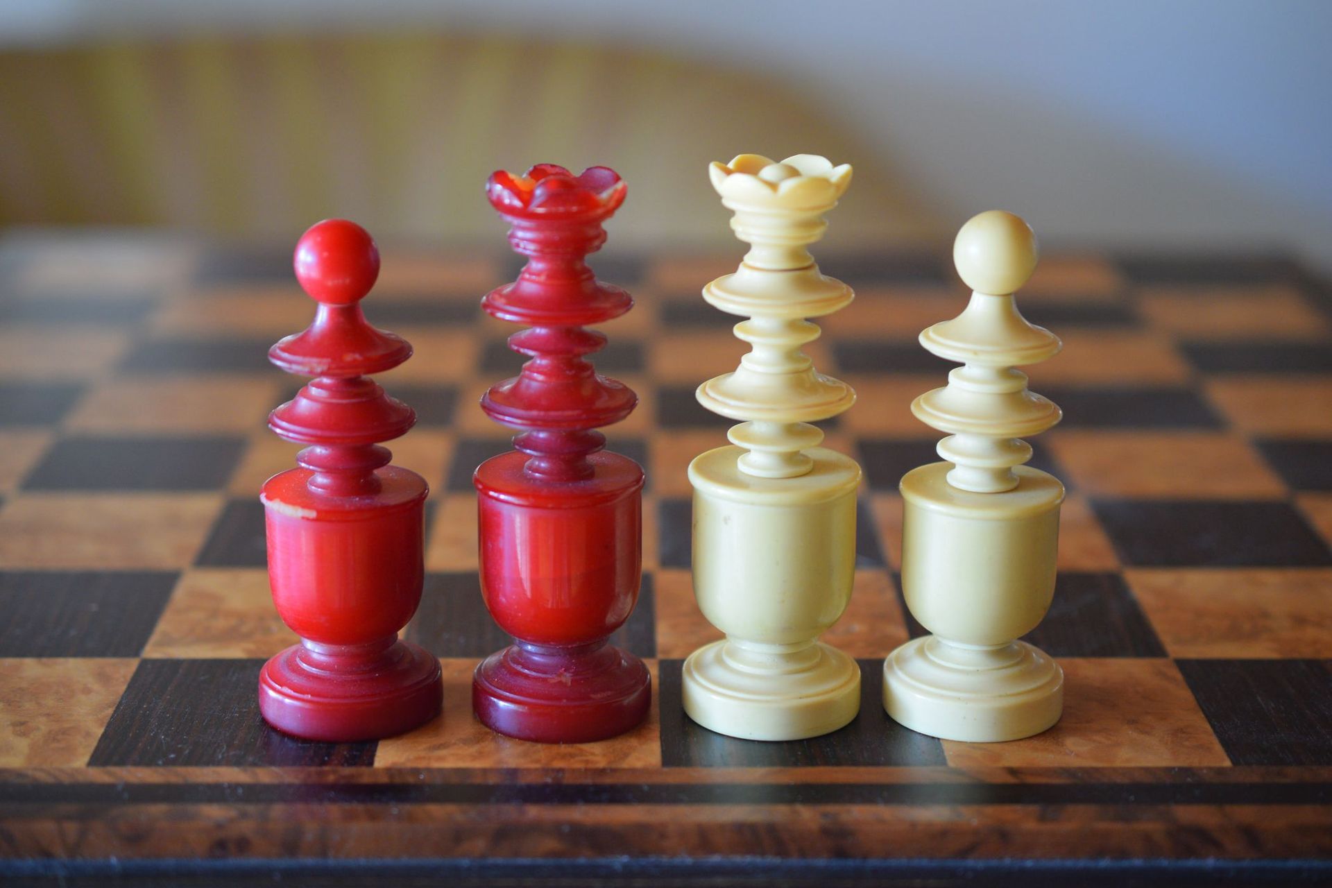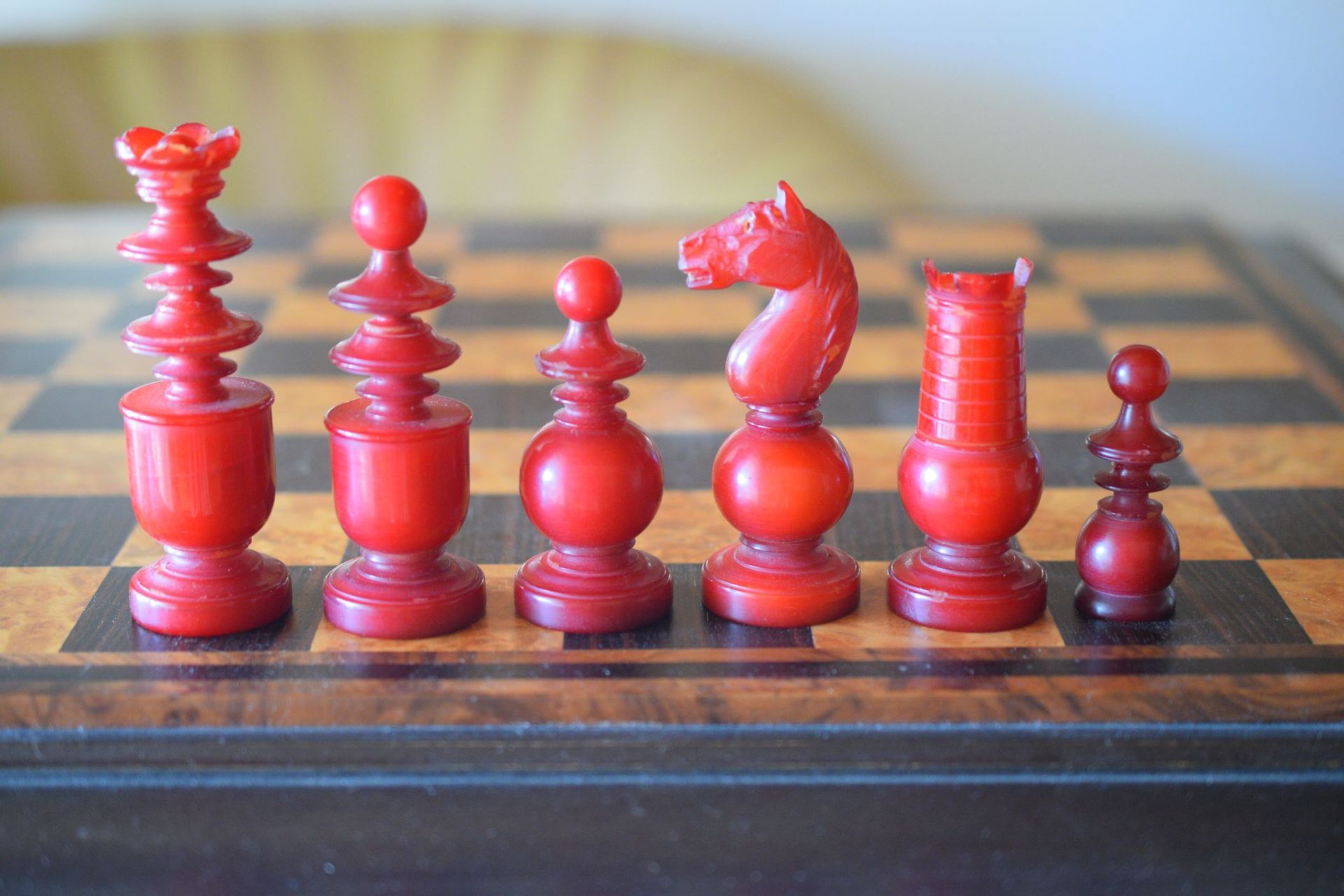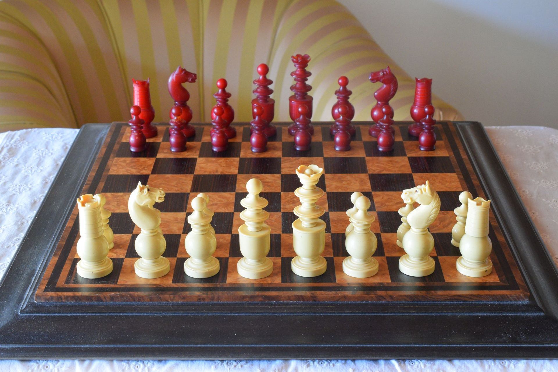 A chess set with a king size of 9 cm in the French Régence style made of some type of early plastic, probably catalin or celluloid. One side ivory coloured, the other side in a rich and slightly opaque burgundy red. The pieces are quite large and heavy, which is partly due to the fact that the large pieces are made of several individual sections which are held together by a rather large and heavy metal screw. The knights with glass eyes are particularly beautiful. Unfortunately, there are some damages to the crenellations of three rooks.