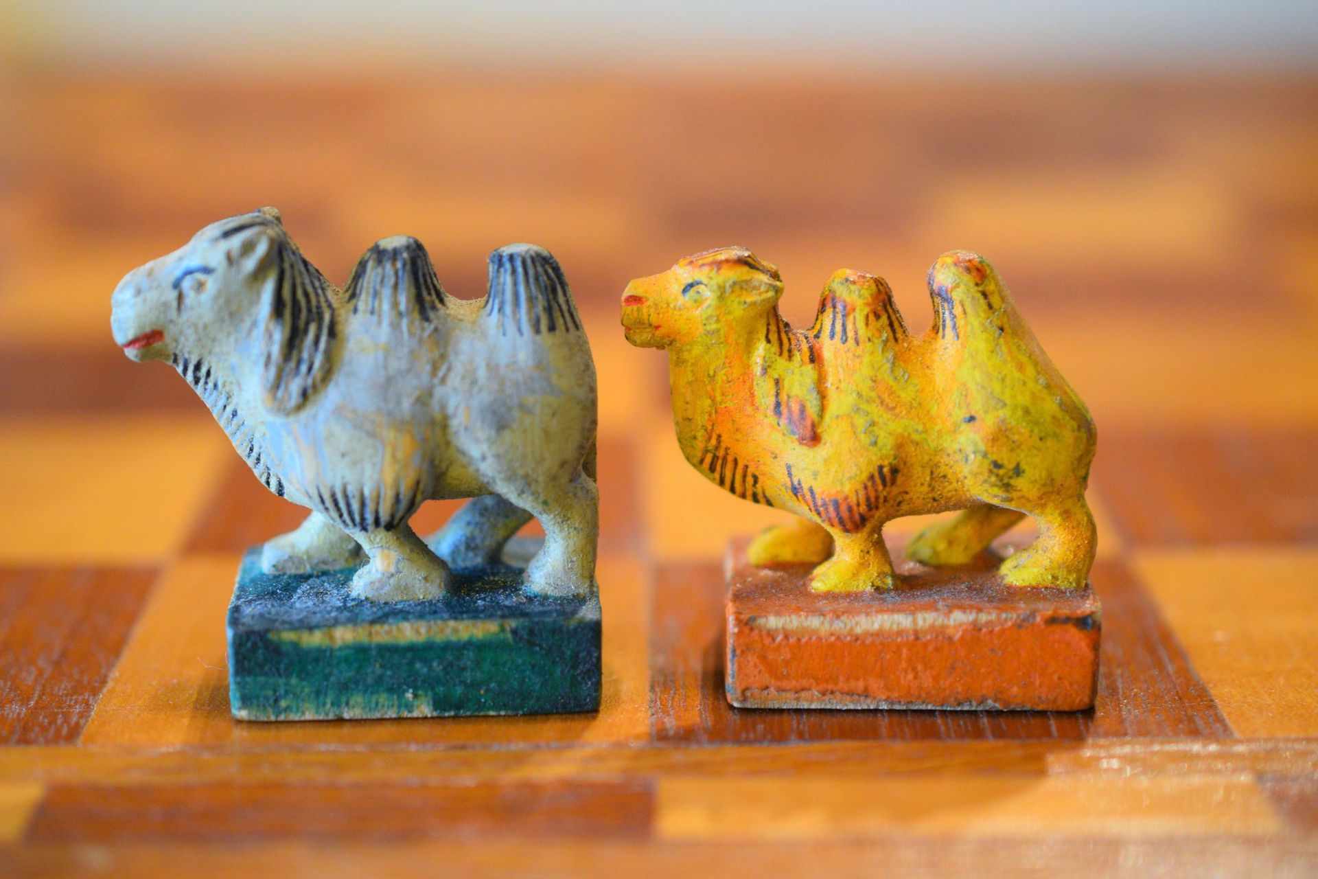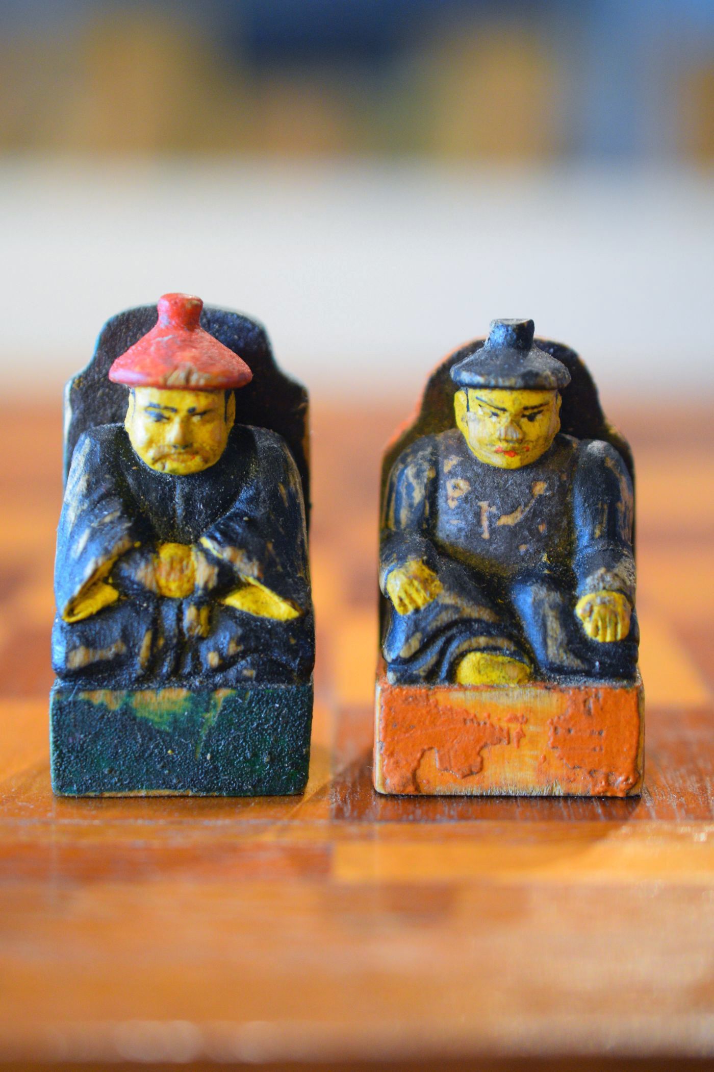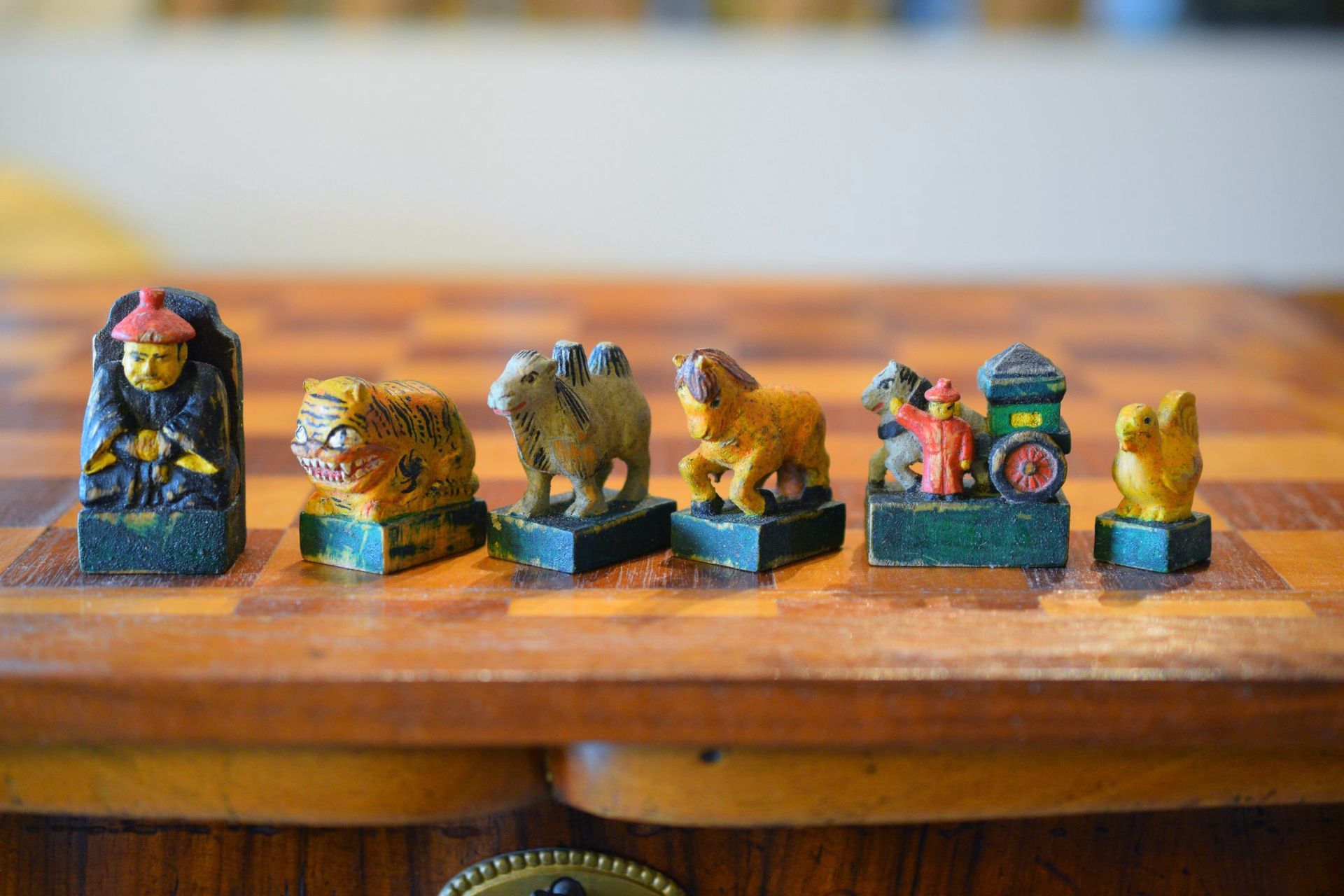 A small figural shatar set, which was made in Mongolia in the early 20th century. These sets are traditionally very small with a king size of just a few centimeters, but are often decorated in lively colours and sought after by collectors due to their rarity. Mongolian shatar sets come in a variety of forms, many of which have been researched and described in more detail by fellow collector Rodolfo Pozzi. With his