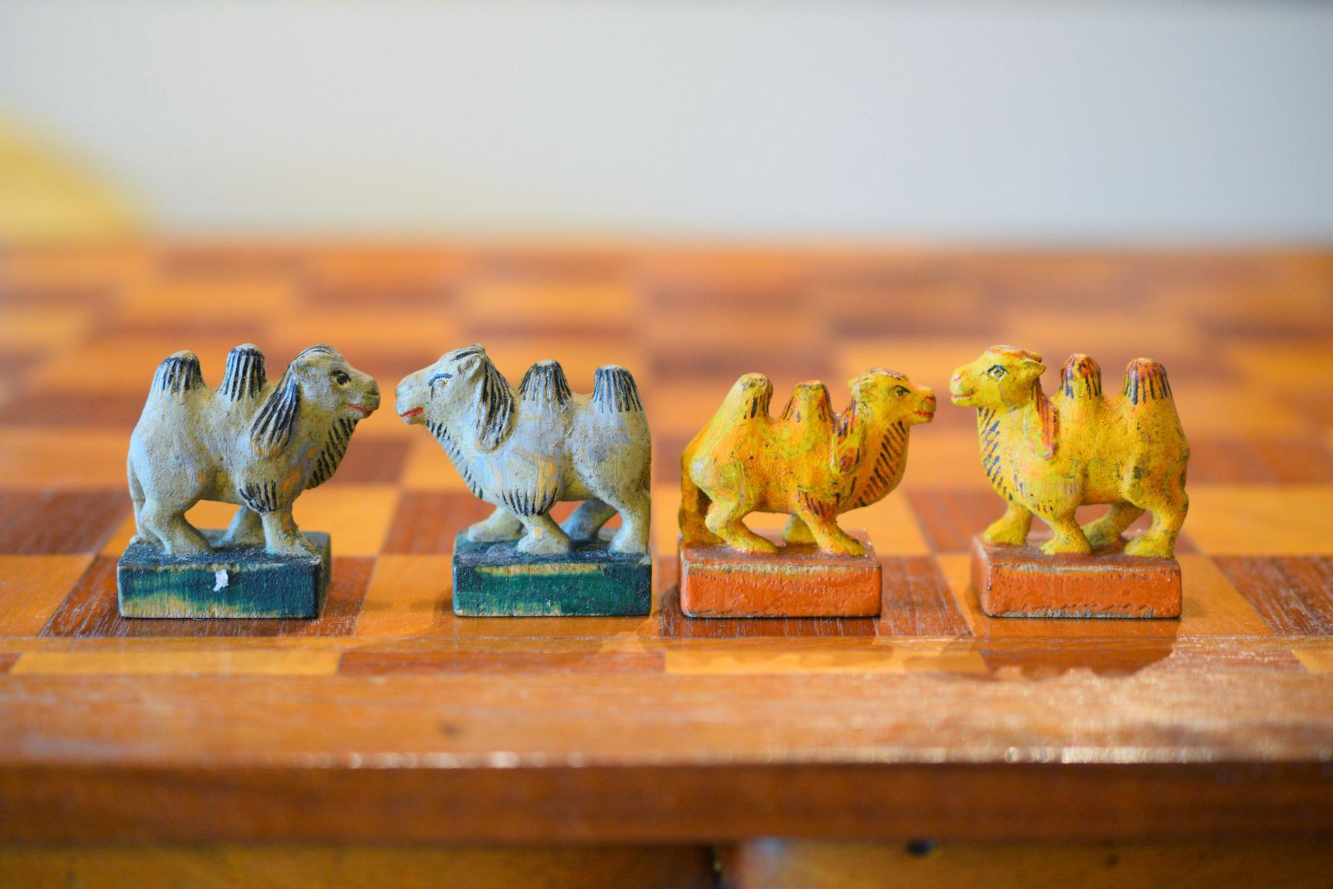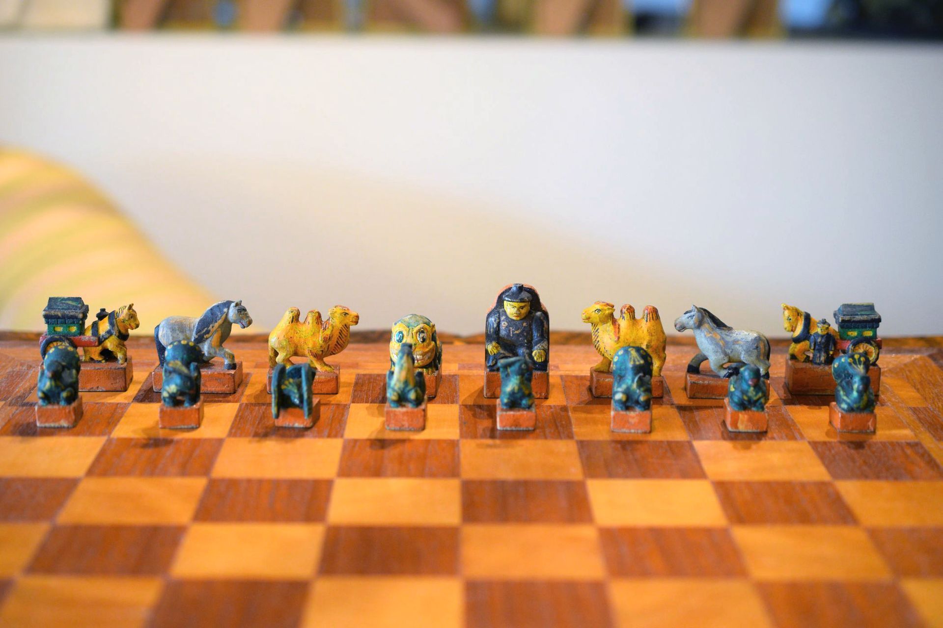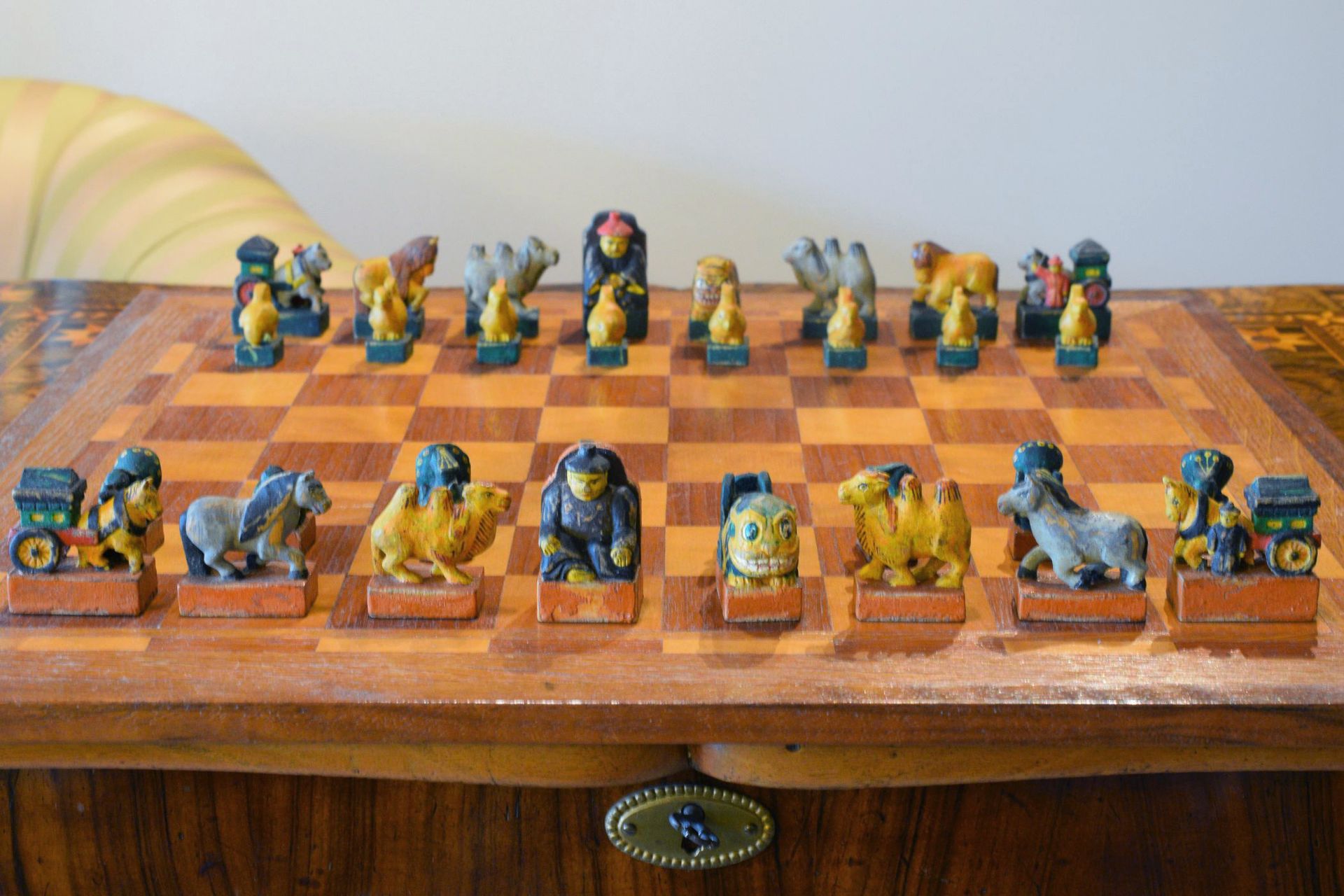 A small figural shatar set, which was made in Mongolia in the early 20th century. These sets are traditionally very small with a king size of just a few centimeters, but are often decorated in lively colours and sought after by collectors due to their rarity. Mongolian shatar sets come in a variety of forms, many of which have been researched and described in more detail by fellow collector Rodolfo Pozzi. With his