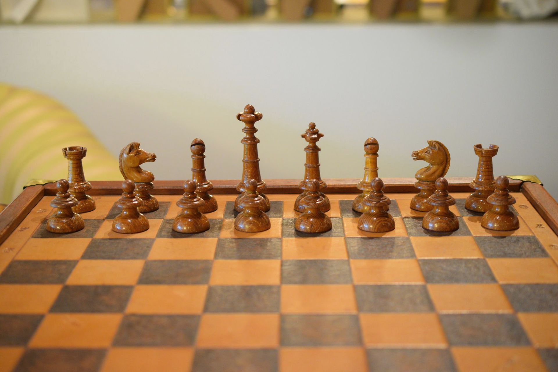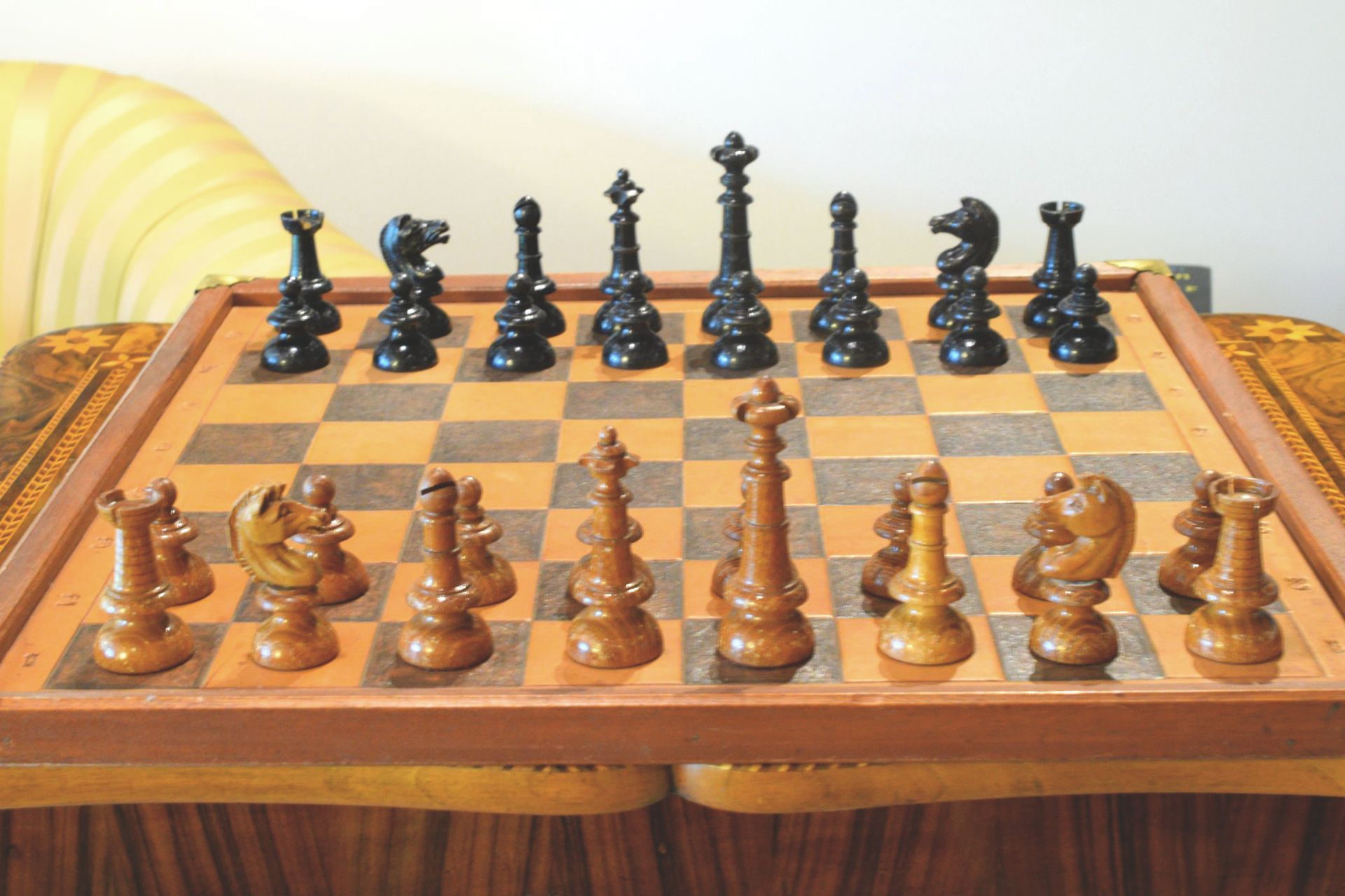 This is a chess set made by E. H. Schütze presumably in the late 19th century. The pieces with a king size of 10.2 cm are made of wood, one side lacquered in brown, the other side in black. The design reminds slightly of the Austrian Coffee House style. The peculiar design of the knights, but also the slender shape of the rooks is noteworthy. The set came in the original carton box with stamps of E. H. Schütze on the inside of the lid and the bottom of the box.