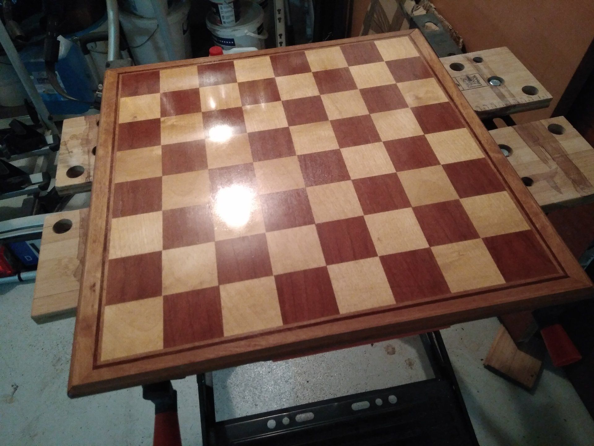 I acquired it from something in between an antiques dealer and a junk shop. The board was full of scratches and stains and all in all rather dull looking. After buying it, I gave it a proper sanding to remove the scratches and stains and the polished it to a high gloss finish with a ruby french polish to bring the colour back to the wood. Some "before" and "after" pictures are shown below, as well as the result of my work.