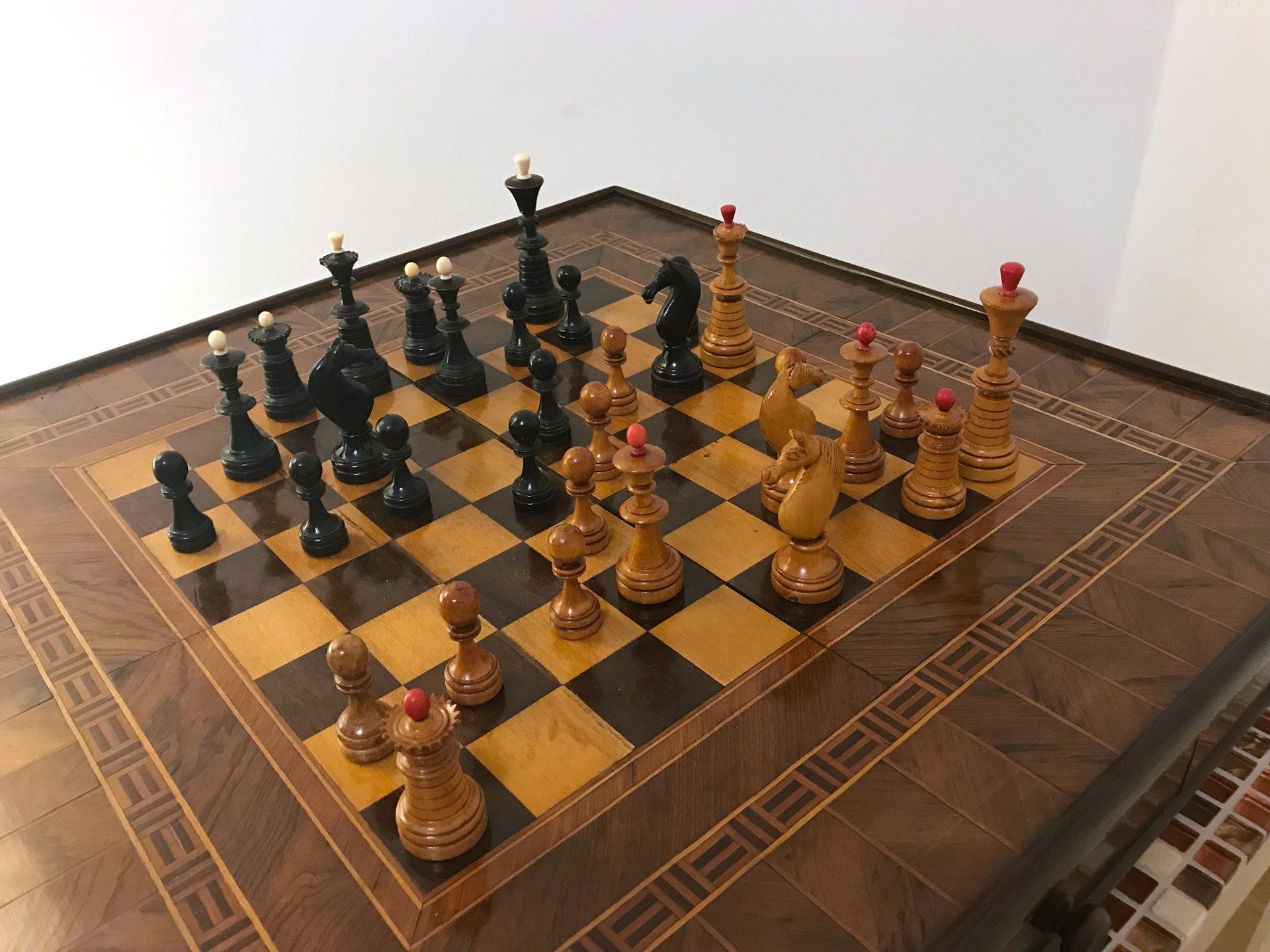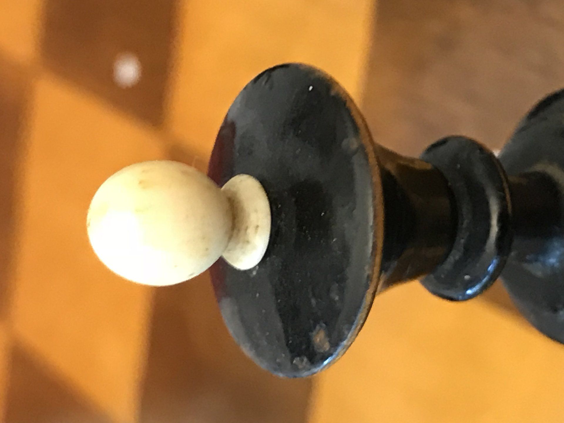 Some time ago, I acquired some nice, but really worn pieces that once formed a glorious Polish late 19th century tournament set in order to restore them. King size is 9 cm. All pieces are weighted. However, many of the pieces had chips, an immense amount of grease and dirt on them and many spots in which the colour was peeling off. Half of the pieces had bone finials, the rest of the finials was missing. The finials of the black pieces were of natural colour that had in some places turned to a dirty grey. The finials on the white side were stained in red, but were rather faded. Further, one of the Rook finials had been misplaced on a Bishop. One pawn is a replacement.