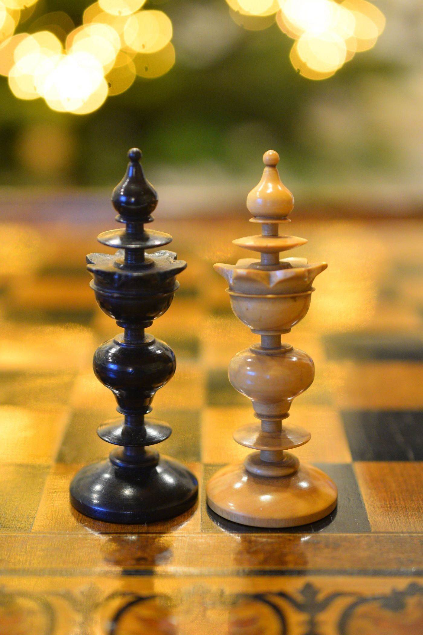 Chessmen like these, made in the Biedermeier period (ca. 1815-1848), were the standard playing sets in Austrian coffeehouses for at least half a century, before the more robust "Old Vienna" style came into fashion.