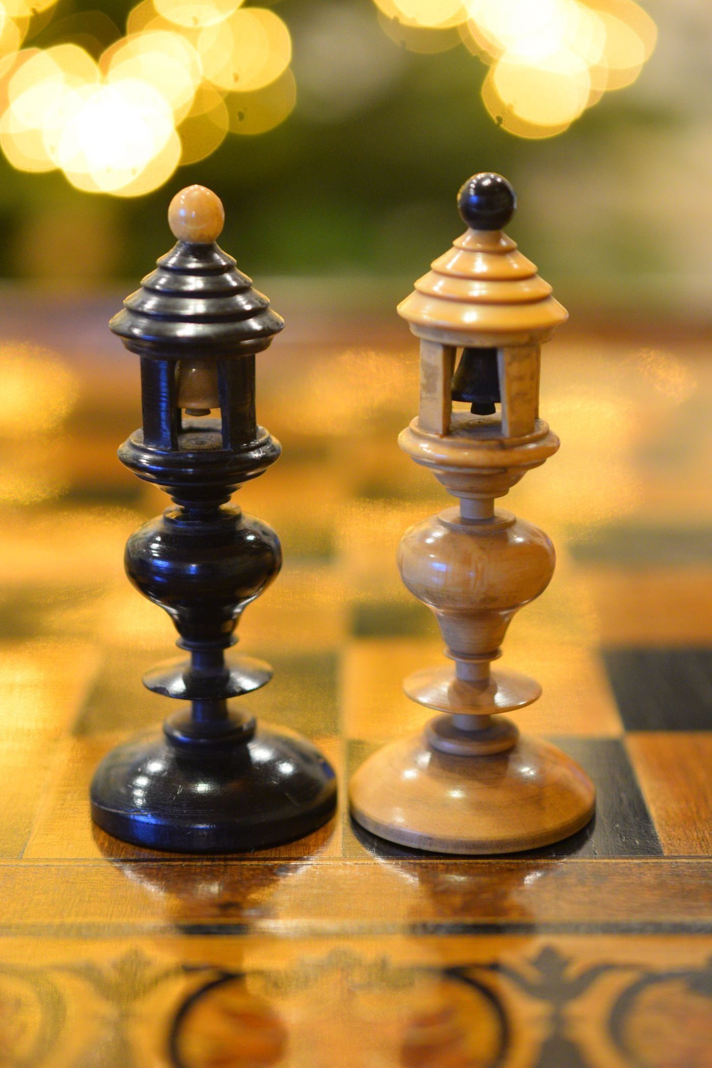 Austrian Coffeehouse Chess Set in the Biedermeier style, made from boxwood and ebony. Sets like these came up in the early 19th century, still showing some typical 18th century features, but already including elements of the emerging Biedermeier style, thus beautifully showing the transition from the 18th to the 19th century. King size is 10.25 cm (4"). The kings come with double galleries, still reminiscent of the "crows nest" typical of the 18th century Selenus style, but not as pronounced as before. Queens with single galleries. Knights as horses' heads. Noteworthy are on the one hand the rooks, which are designed as bell towers with a ball finial and bells in the opposite colour, and on the other hand the bishops with a finial in the other colour protruding from what seems to be something in between a lyre shaped hat and a tricorn.