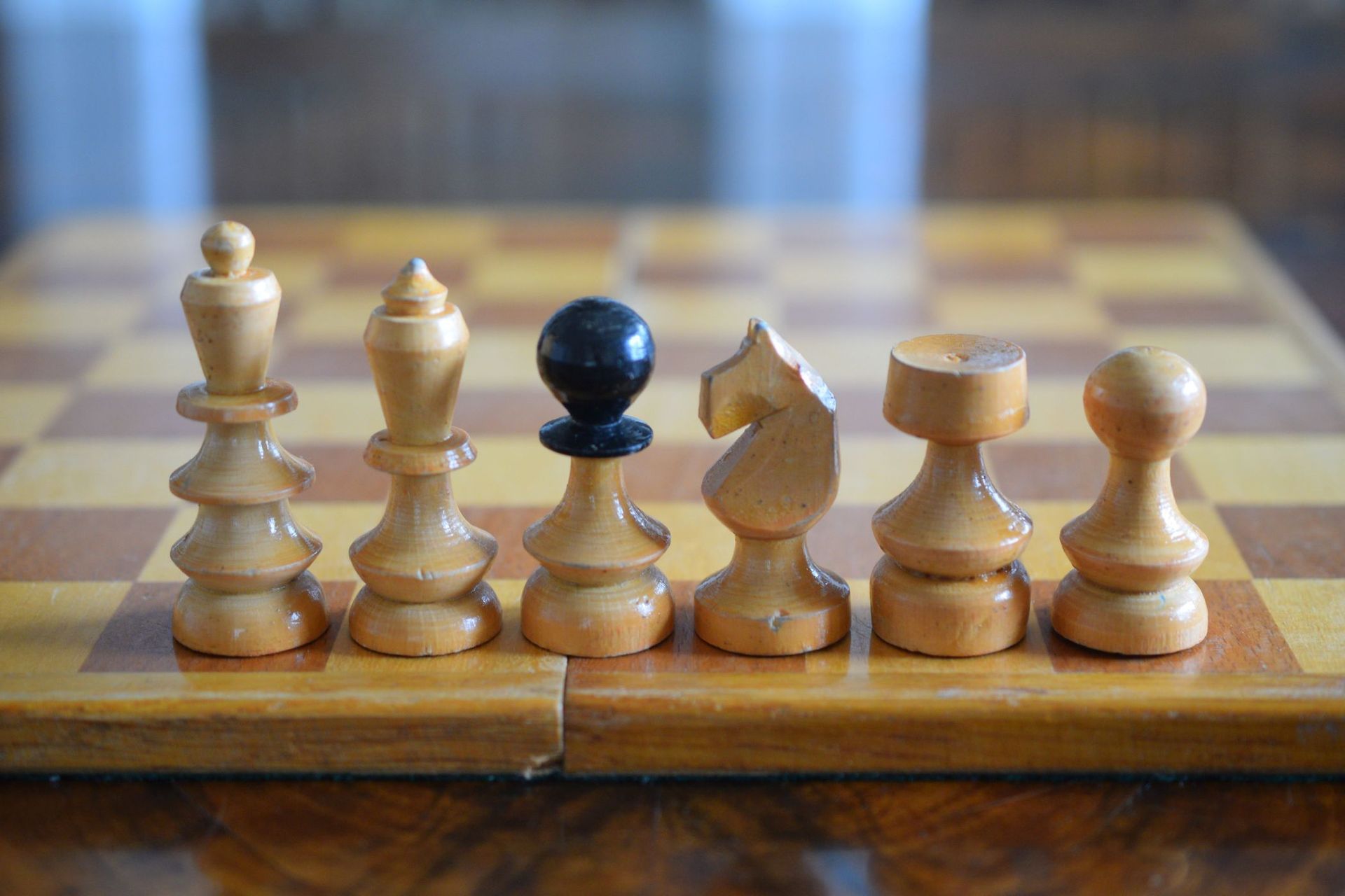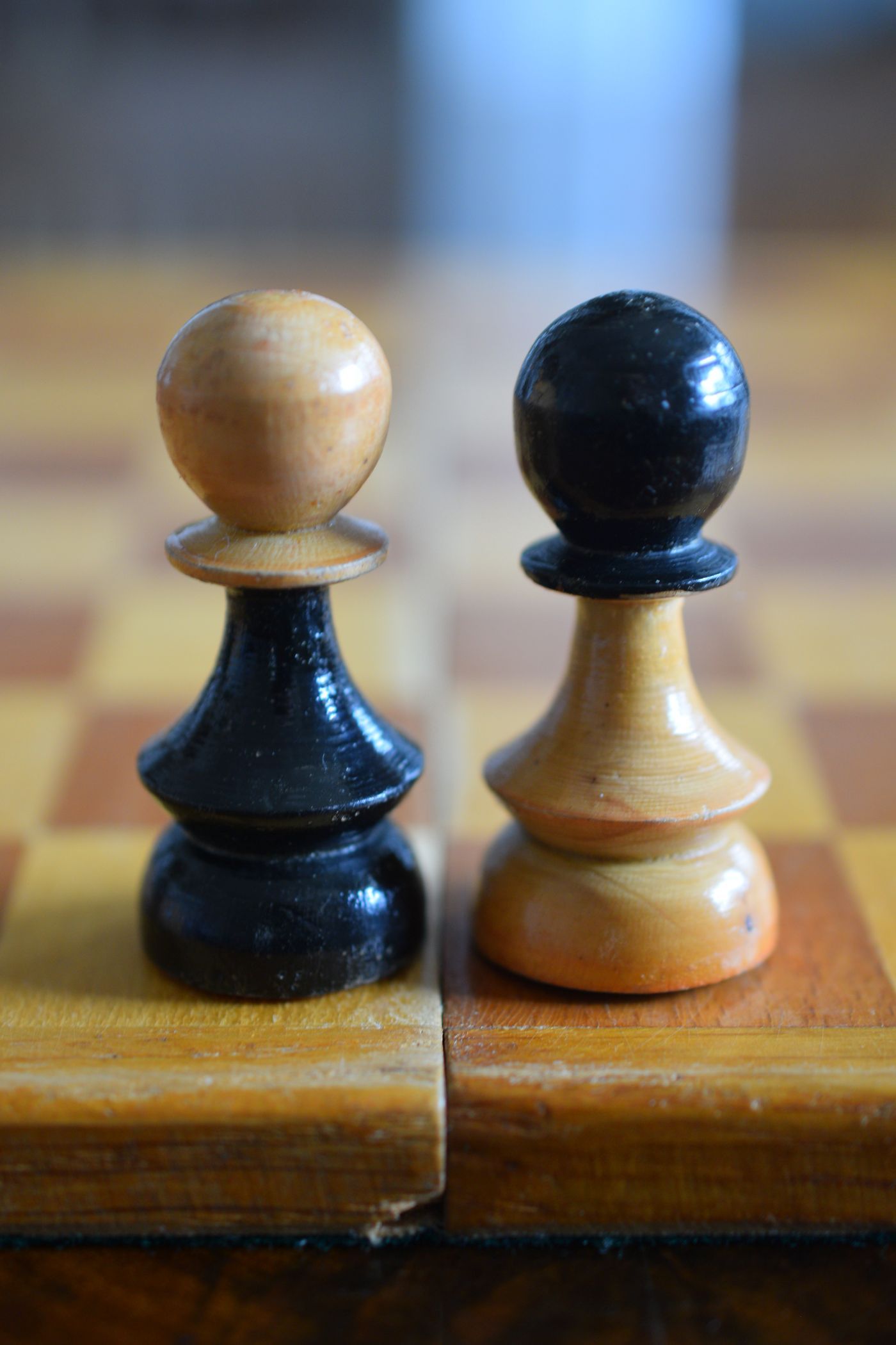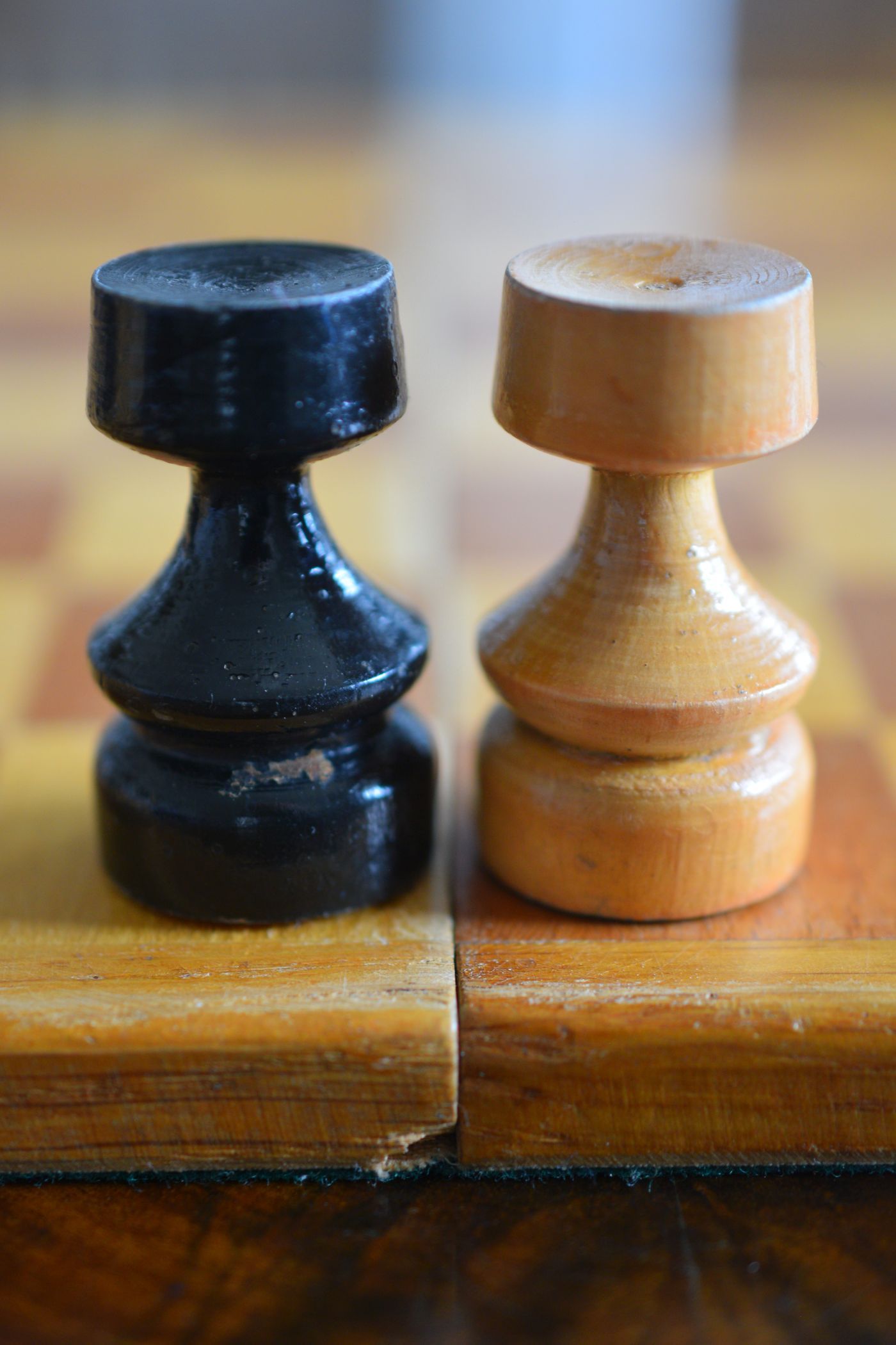 The kings with a ball finial instead of crosses, the queens with a small spike finial. Rooks as tapering towers in a manner very typical for Romanian sets. Knights as simple carved horse heads. What is unusual about this set are the bishops. They have - very typically - their heads in the opposite colour, as is known also from Austrian coffee house sets or other Romanian sets. However, usually only the head is in the opposite colour, while in this set not only the spherical heads, but also the collars below are coloured.