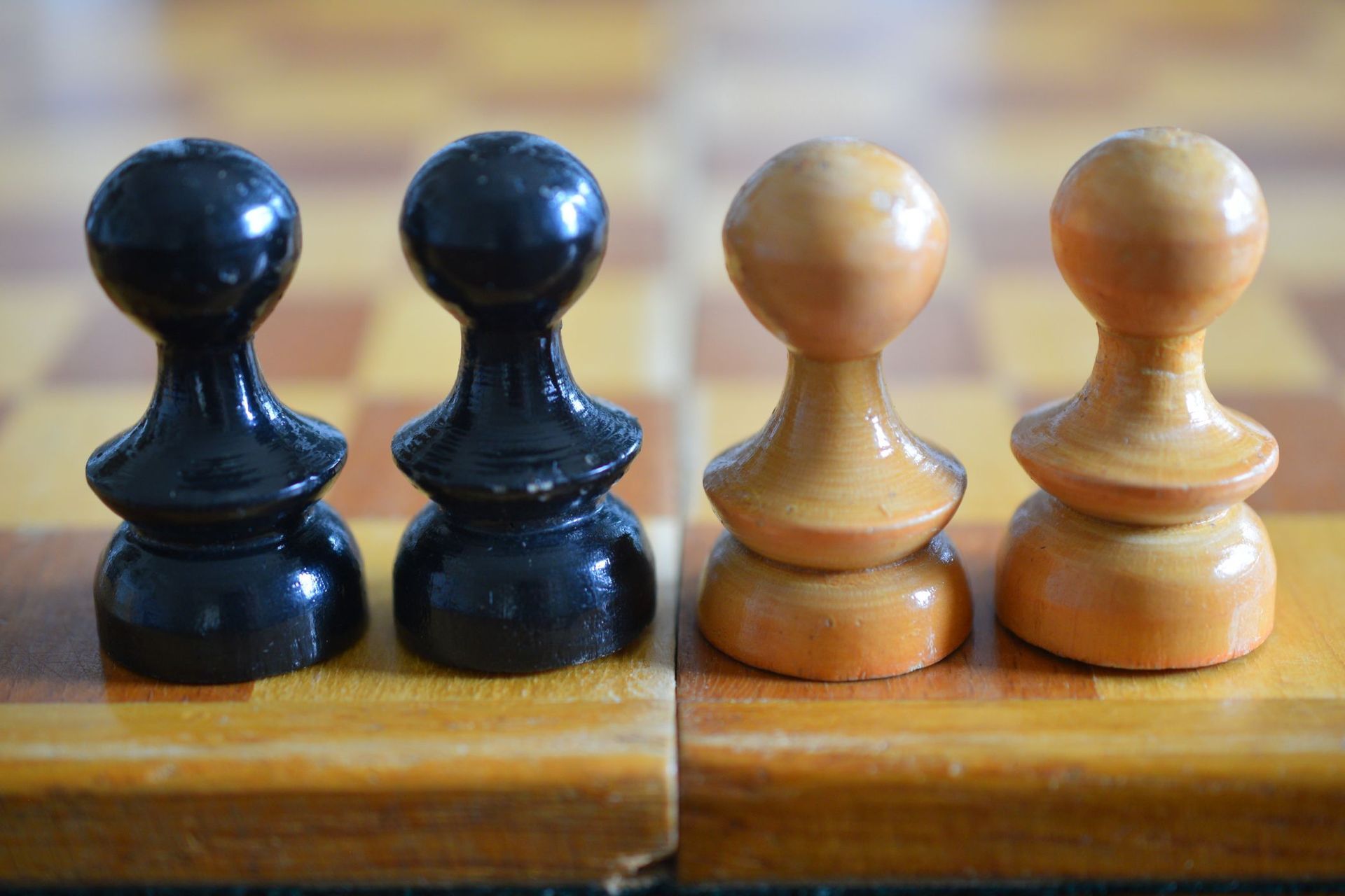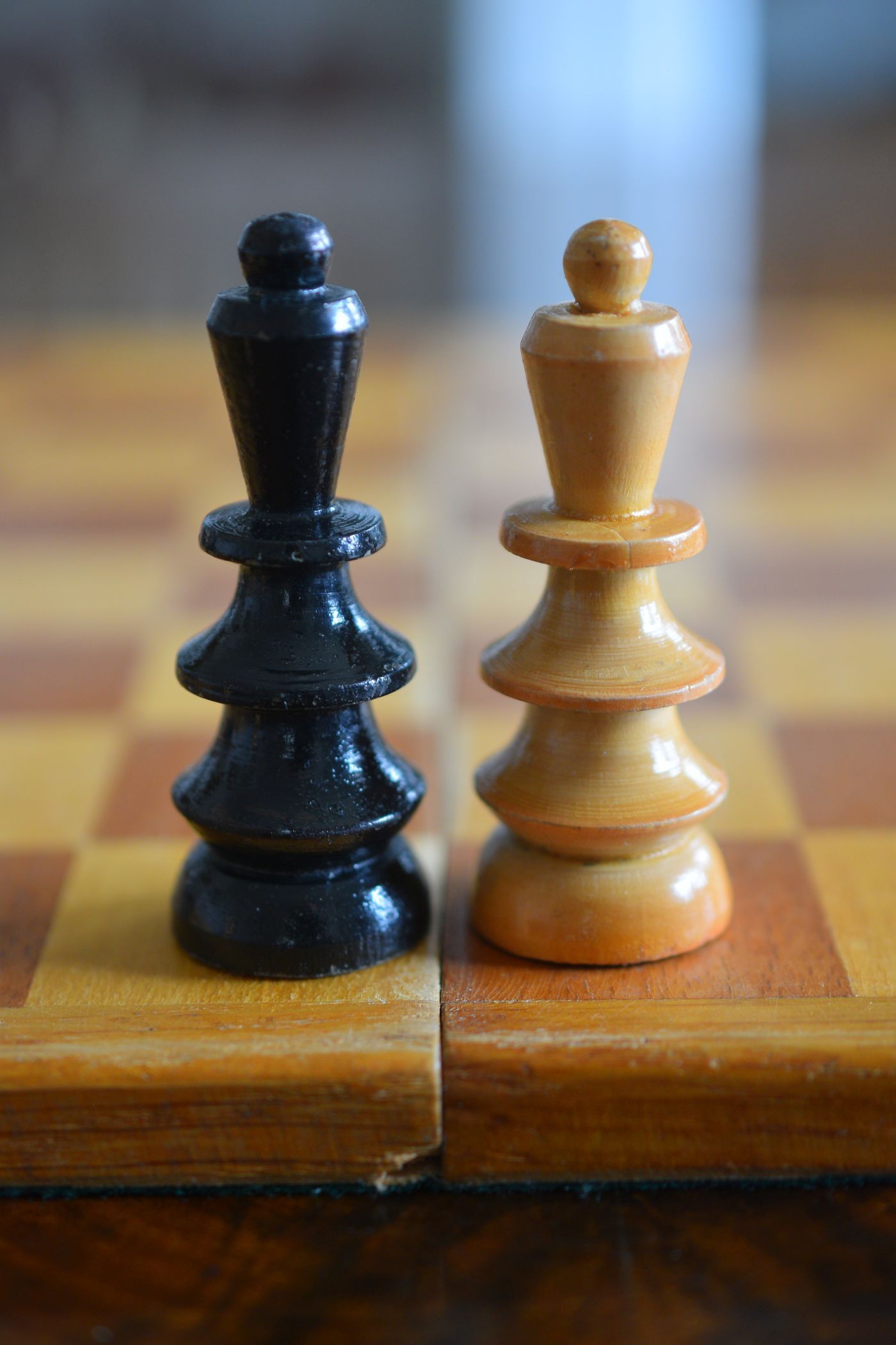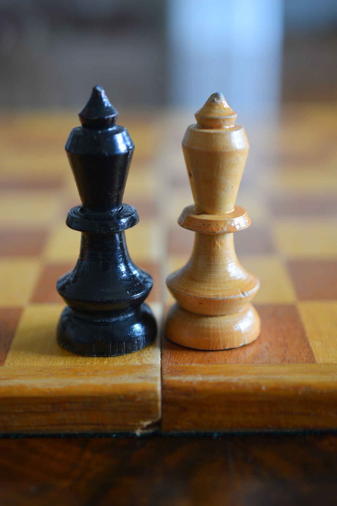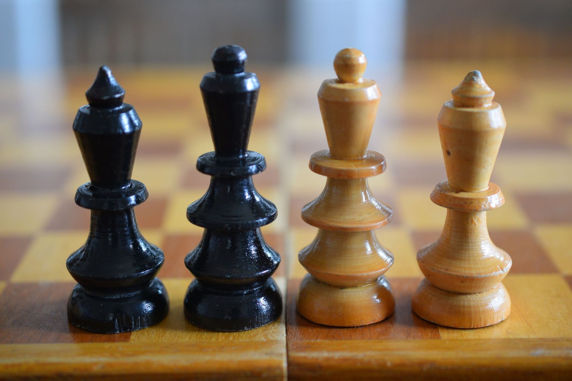The kings with a ball finial instead of crosses, the queens with a small spike finial. Rooks as tapering towers in a manner very typical for Romanian sets. Knights as simple carved horse heads. What is unusual about this set are the bishops. They have - very typically - their heads in the opposite colour, as is known also from Austrian coffee house sets or other Romanian sets. However, usually only the head is in the opposite colour, while in this set not only the spherical heads, but also the collars below are coloured.