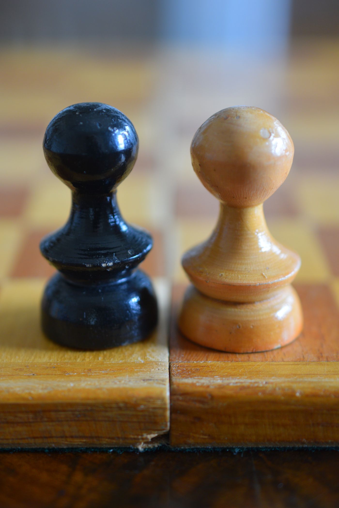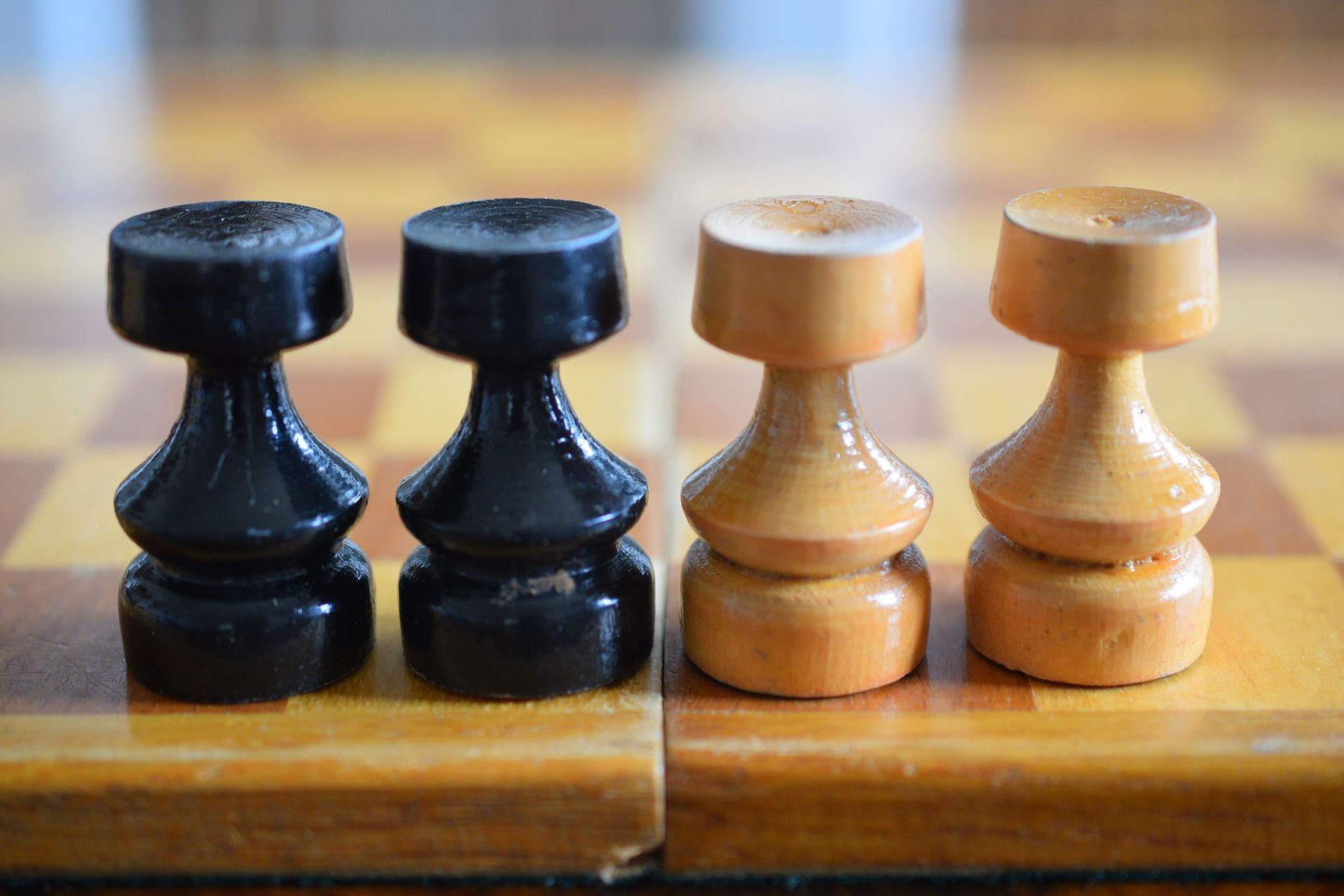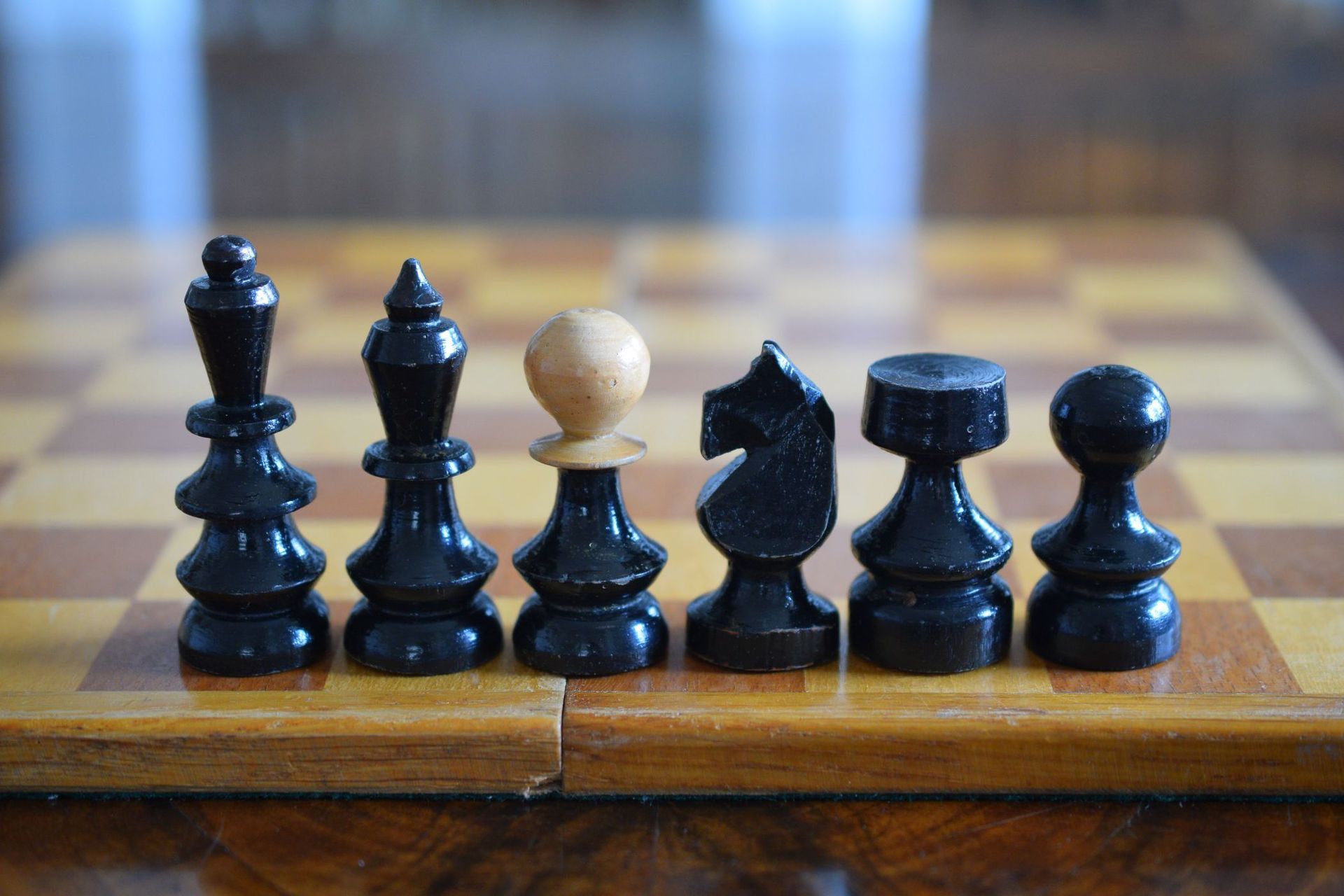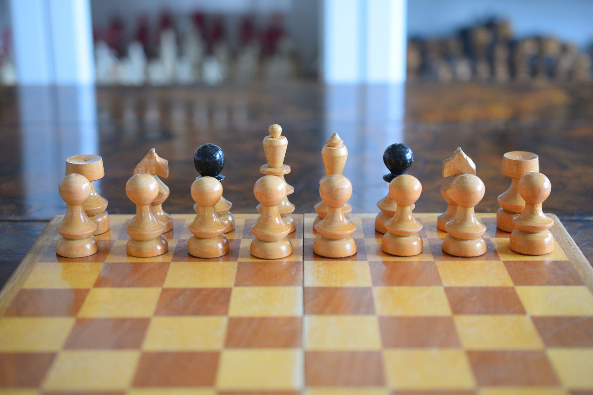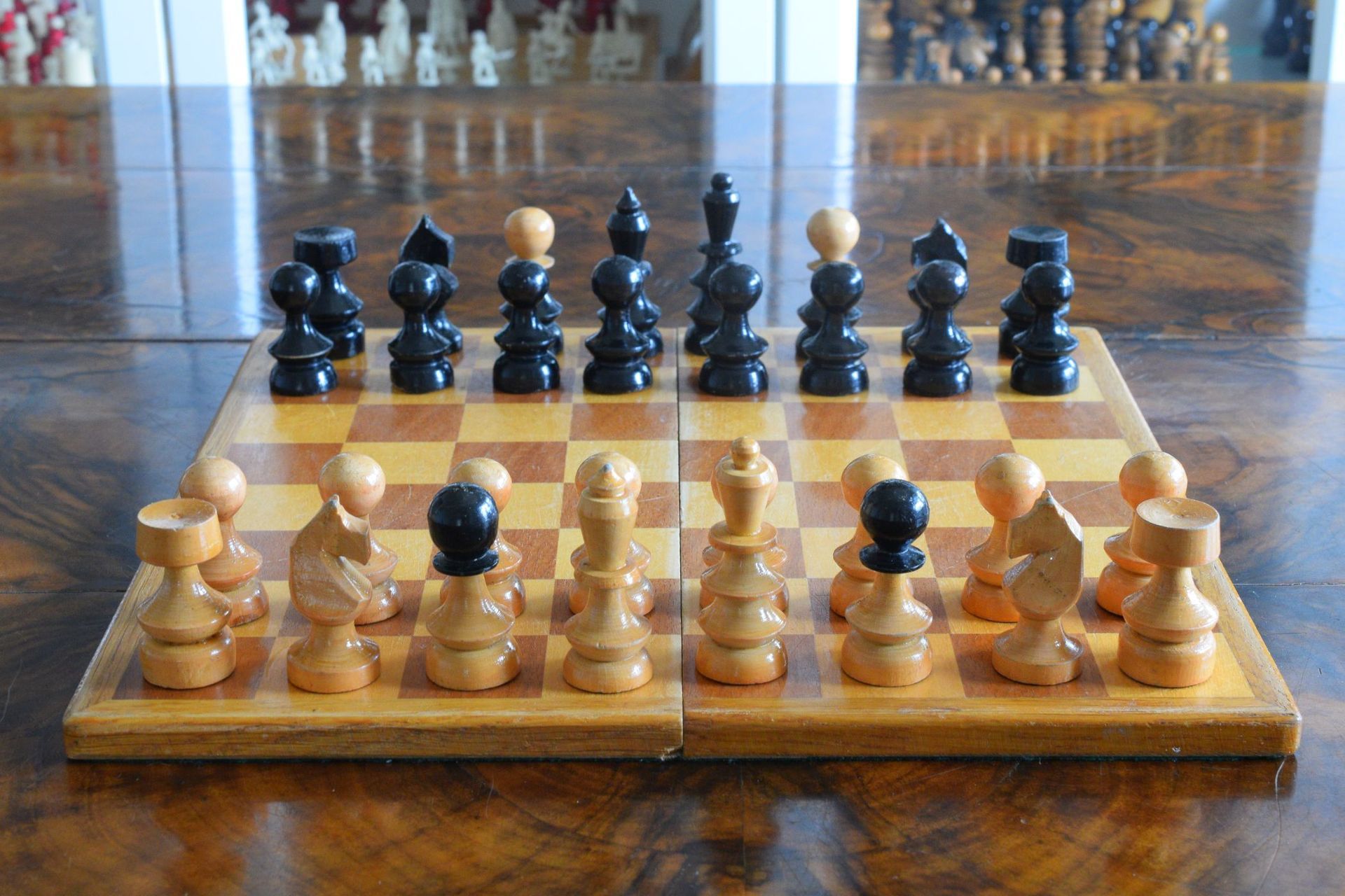 Romanian library sized chess set with a king size of 6.2 cm. The small size makes the set most suitable for analysis. The pieces are made of wood, one side natural, the other side lacquered in black. The carving of the set is rather simple, but very characteristic of Romanian sets.