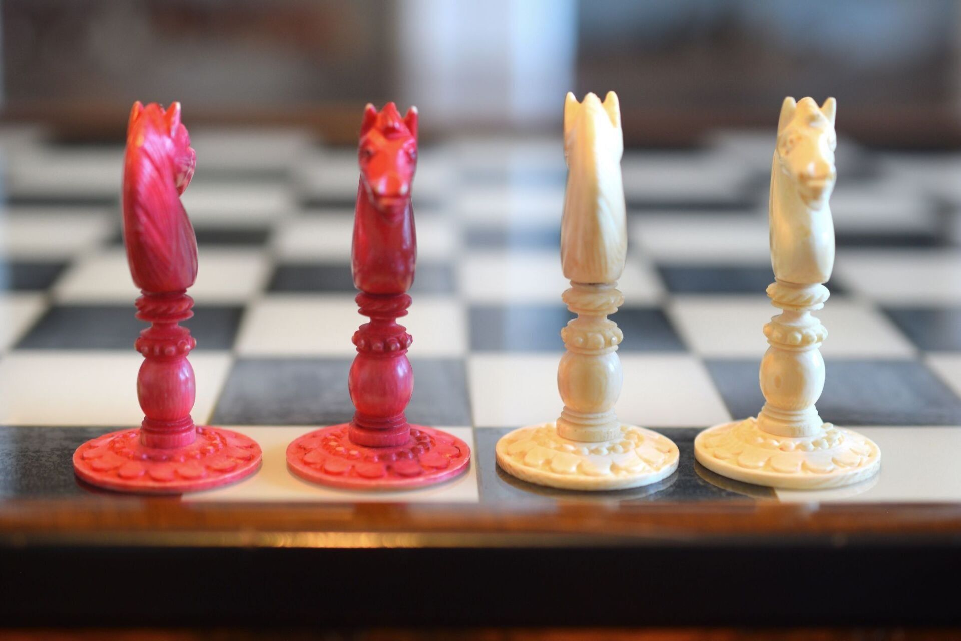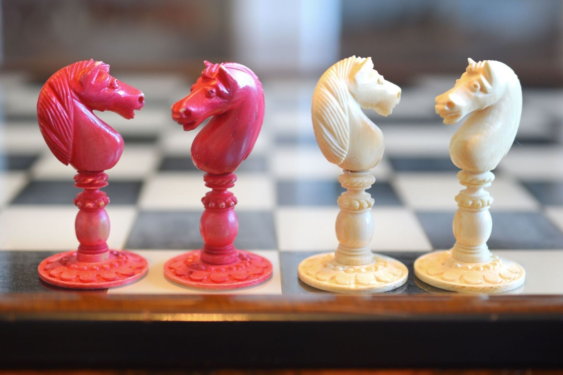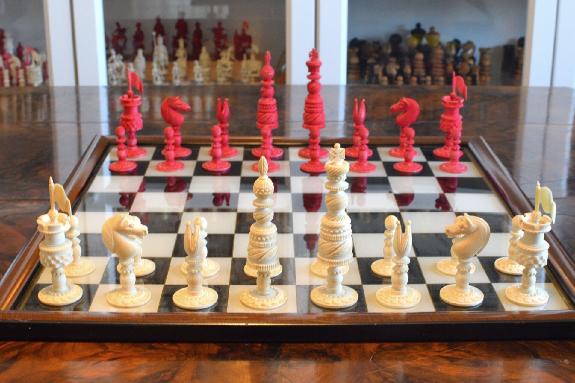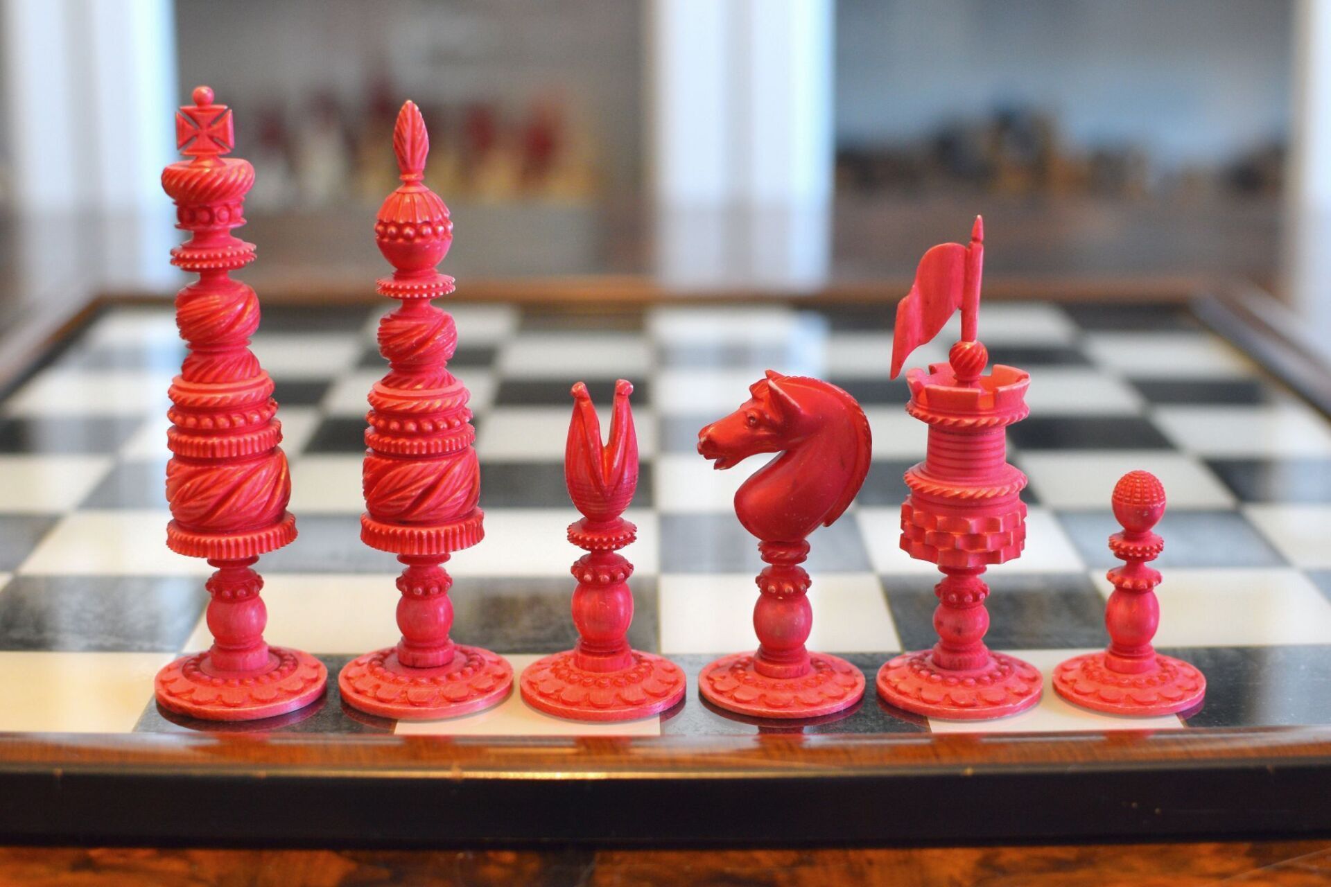 Mid-19th century English ivory chess set with Barleycorn pattern, which apparently was turned with an ornamental lathe. One side natural, the other side stained red. The Kings have beautiful crowns with a cross pattée finial, the Queens with a feather finial. King size is 10.8 cm (4.35"). The rooks as small turrets on a pedestal and with large flags on top. The fine carving of the knights reminds of the style of the workshop of George Merrifield. The bishops with deep mitre cuts. The pawns with ball finials on baluster stems. All pieces on ornamented circular bases.