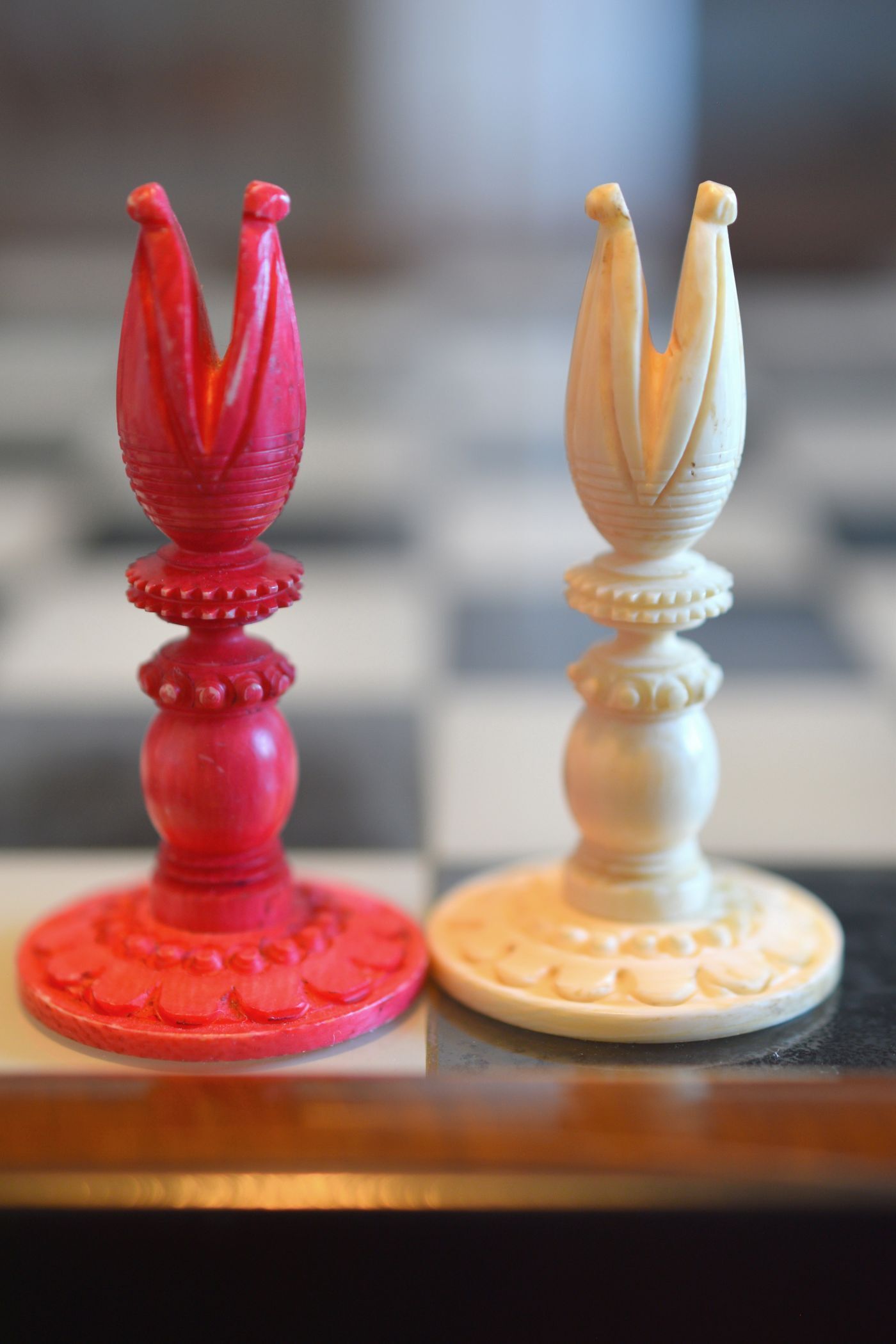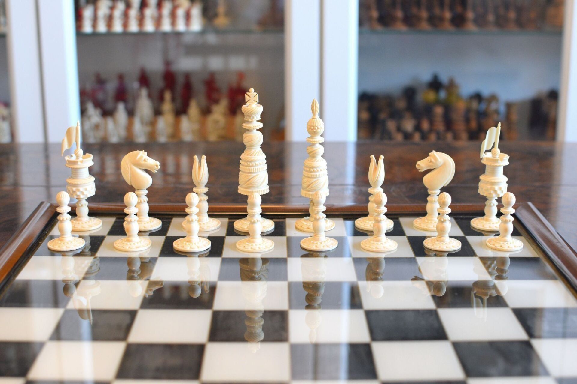 It seems that the maker of these fantastic chessmen tried to demonstrate the potential of his ornamental lathe to the fullest. Ornamental turning goes back to the Renaissance, but mechanical ornamental lathes as the one most likely used for this chess set were developed in the late 18th century. Among the most famous makers of such lathes was John Jacob Holtzapffel (1768-1835), an Alsatian mechanic, who moved from Strasbourg to London in 1784. Ten years later, he set up his lathe-making business, which was first operated from premises in 118 Long Acre (1794-1811) before moving to 10 Cockspur Street (1812 to 1820) and to 64 Charing Cross (1821 to 1901). From 1795 to 1803, he produced and sold 385 lathes, including his first rose engine lathe in 1797. John's son, Charles Holtzapffel (1806–1847), joined the firm in 1827 and continued to run the business after his father's death. He set about writing a treatise published in several volumes entitled "Turning and Mechanical Manipulation", eventually running to some 2,750 pages. Volume 1, "Materials, Their Differences, Choice, and Preparation; Various Modes of Working Them, Generally Without Cutting Tools," was published in 1843. Volume 2, "The Principles of Construction, Action and Application of Cutting Tools Used by Hand; And Also of Machines Derived from the Hand Tools," was published in 1846. Vol. 3, "Abrasives and Miscellaneous Processes, which Cannot be Accomplished with Cutting Tools," remained uncompleted when Charles died at age 41. It was published after his death by his son, John Jacob Holtzapffel (1836–1897), who completed Vol. 4, "The Principles and Practice of Hand or Simple Turning," which was published in 1879 (he also made the 750 woodcut illustrations that it contains) and Vol. 5, "The Principles and Practice of Ornamental or Complex Turning," which was published in 1884, both of which are today also referred to as the "bible" of ornamental turning.