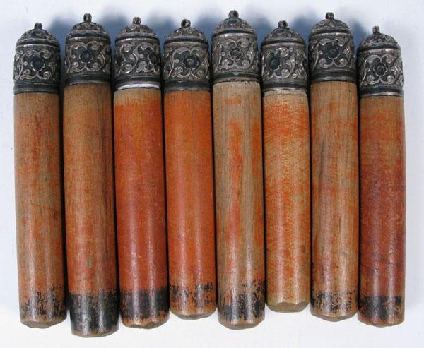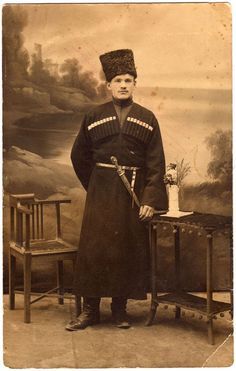 The figural chessmen are shown in traditional Georgian or Caucasian dress. The kings are dressed in a "chokha", a name derived from the Persian language. Before the Persian invasion, these wollen coats were referred to as "talavari". In Russia this type of coat is named "cherkeska". It is a typical and very traditional type of garment and a Georgian symbol of pride, worn until today on many formal occasions. The chokha comes in four different types and forms part of the typical cossack uniform. A typical feature of the chokha are the cartridge holders on both sides of the chest called "masri". In former times these were used to hold paper cartridges for muskets, but with the advent of modern weapons these were replaced with ornamental bullets or cartridges calles "masrebi" or "gaziri". The uniform of the king is completed with a richly embroidered overcoat called "burka", a hood-like headdress wrapped around the neck called "bashlyk", a traditional hat called "papakha", usually made of wool or fur, and the traditional cossack dagger called "khanjali" worn on a belt. The queen is likewise dressed in the traditional dress of a rich Georgian woman. She is wearing a long dress called "kartuli", with a beautifully decorated belt. The traditional headdress consists, inter alia, of a white veil called "lechaki", a thin bolster, usually made of silk and cottong called "kopi" and a cardboard rim sewed with velvet called "chikhta". The rooks are shown as towers with onion shaped domes, the knights as rearing horses, which may be seen as a reference to the dzhigit horsemen among the cossacks, the bishops dressed as cossacks dressed with a closed burka wearing a bashlyk and a papakha and the pawns as sitting cossacks.