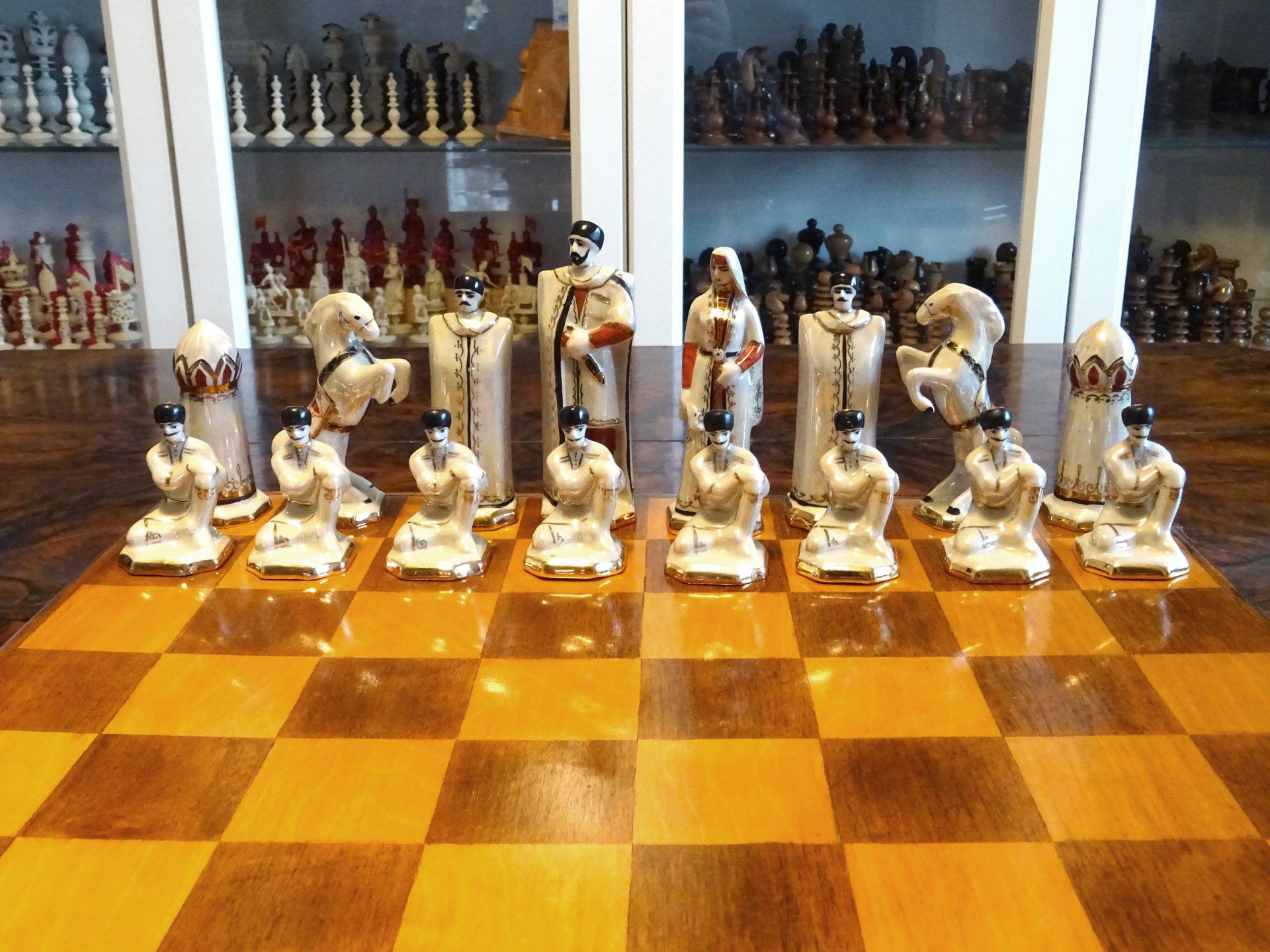 According to Isaak Linder, the design goes back to Georgian porcelain artists from the Zugdidi Porcelain factory in Zugdidi/Georgia (Linder, Schach - Schachfiguren im Wandel der Zeit, p. 83, 122-125). However, the set shown by Linder differs slightly from this set insofar as the bishops are wearing capes over their heads rather than hats and also in the colours, which seem to be much darker in the set attributed by Linder to the Zugdidi porcelain factory. Similar sets were also sold under the brand of the Kislovodsk porcelain factory, located some 200 miles away on the Russian side of the border.