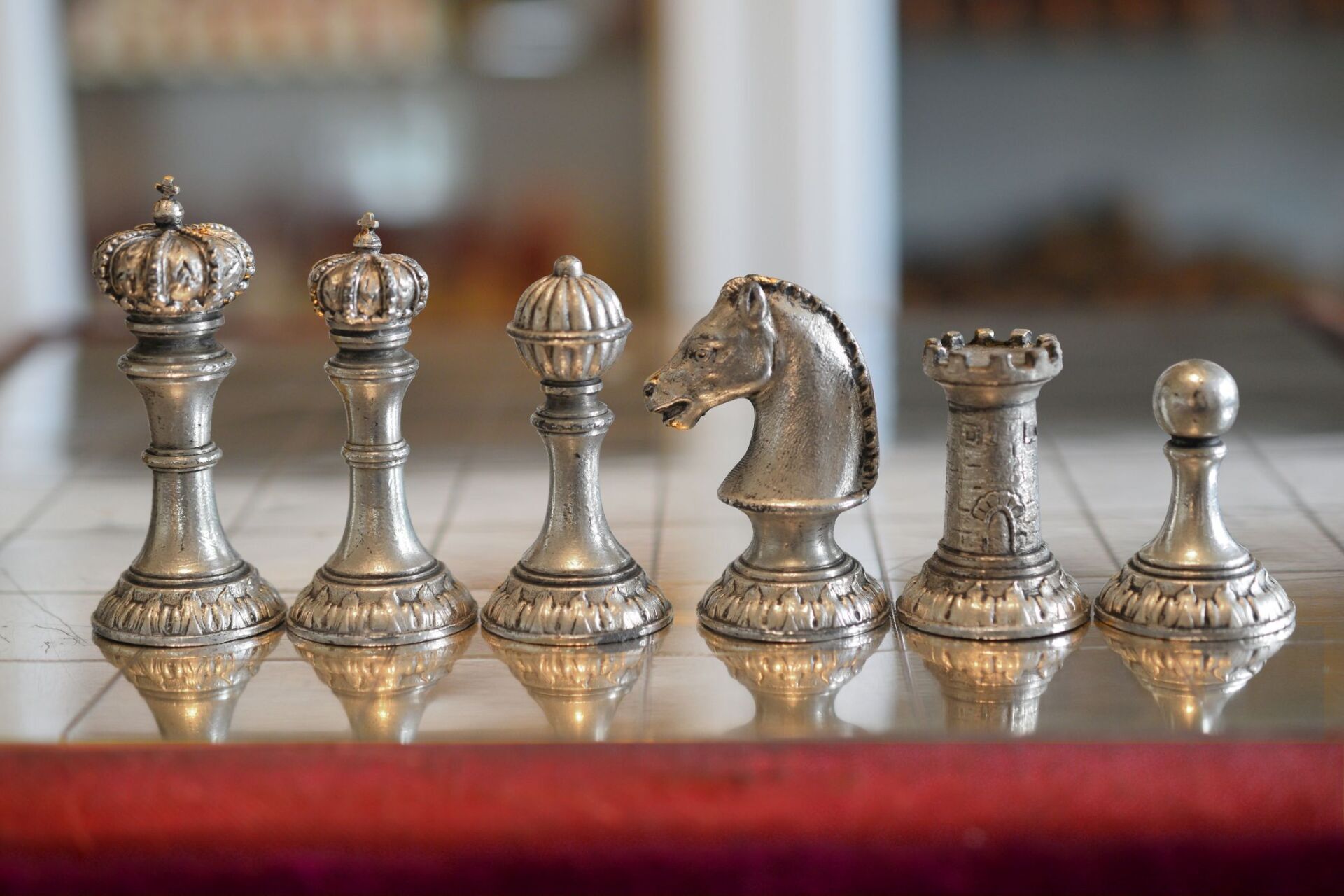 A very special and rare chess set made of brass, one side gilded, the other side silvered. The pieces of this extremely elegant set are very delicately crafted with a lot of attention to detail. Sets like this have been sold numerous times in international auctions in the past decades and have been subject to discussion in some of the well known publications. Nonetheless, some of the information given in this context are wrong.