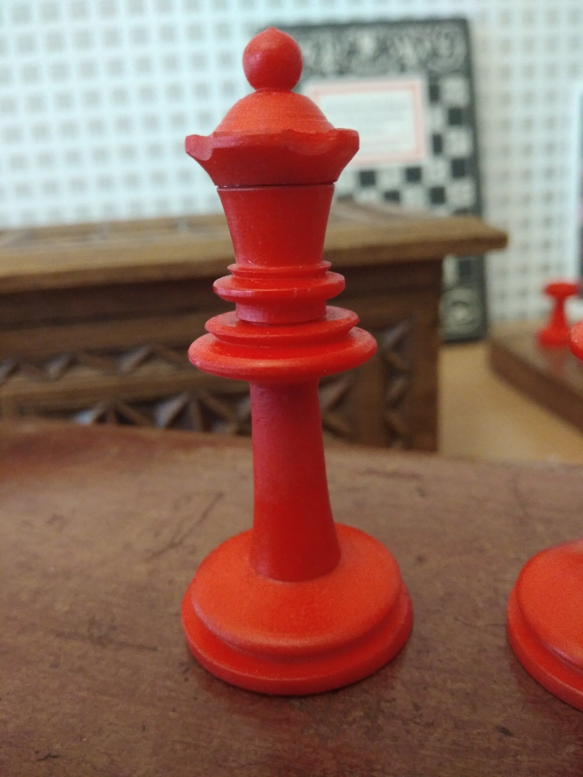 A wonderful Staunton chess set made by K.P.Uhlig in the early 20th century. According to my original Uhlig catalogue of 1913, this set is a no. 133 in size 1, which is a king size of 68 mm. The pieces are made from bone, one side stained in red. The condition of the pieces is almost pristine, especially the white side with almost no stains, as you often see them in bovine bone pieces due to the structure of the bone material.