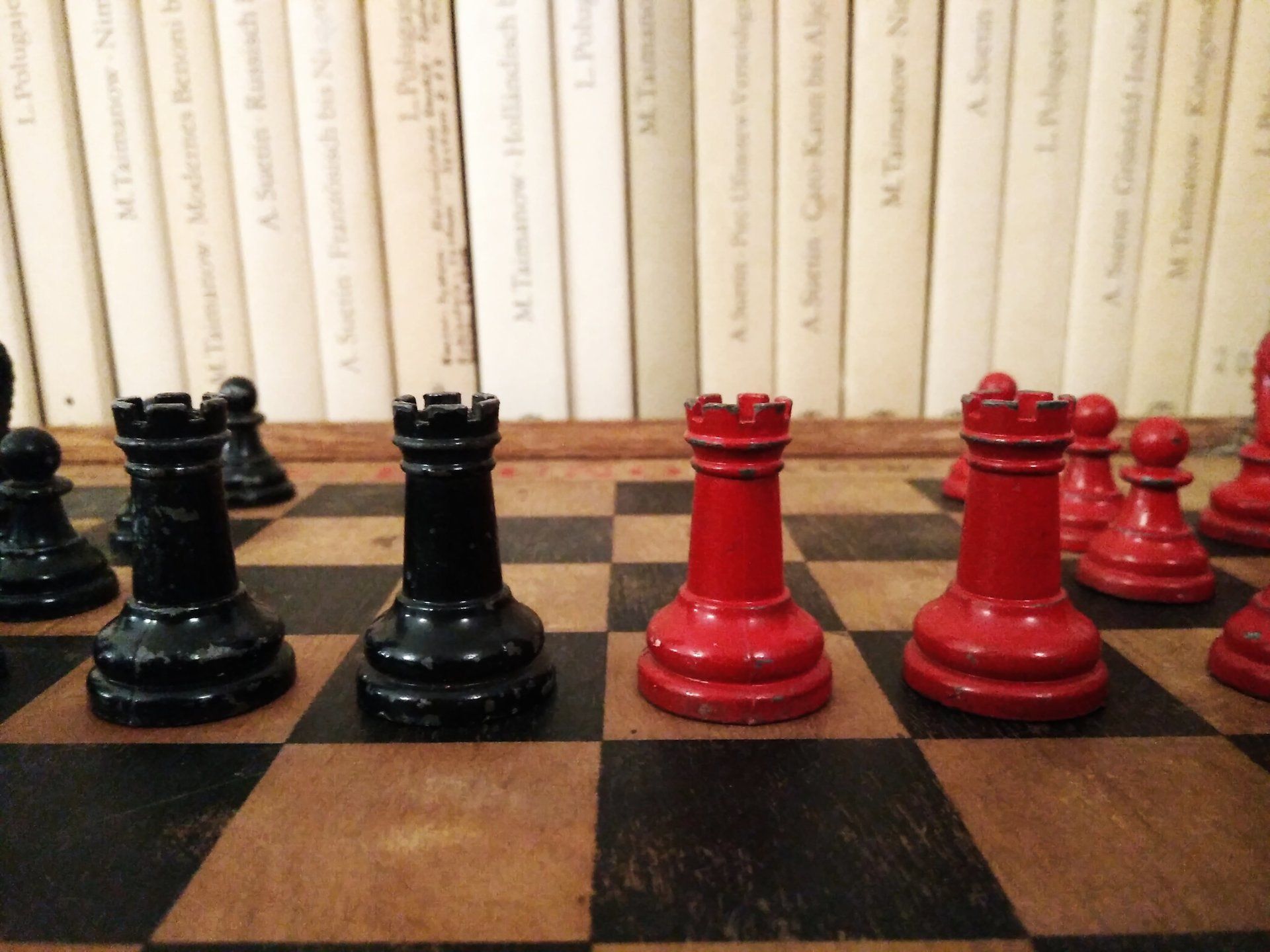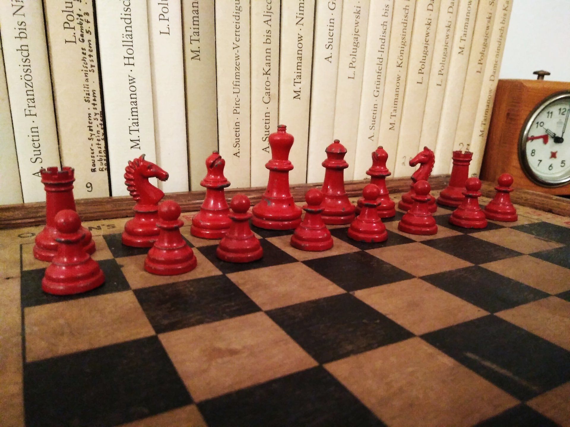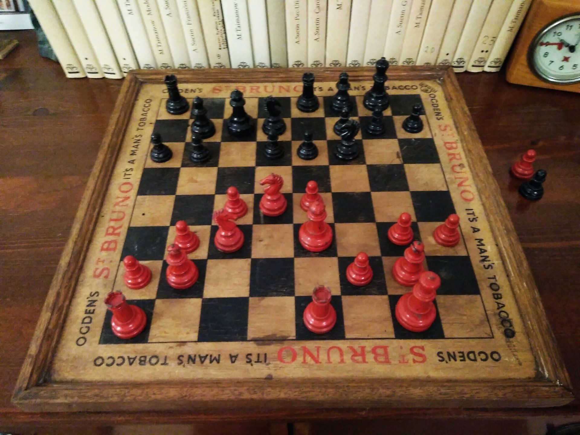 William Britain Lead Chess Set, ca. 1940, on a vintage playing board of the same period with Ogden / St. Bruno advertising imprinted on the rim together with a slightly younger guy setting up the pieces for nice pictures in order to post such pictures on this website for everyone to admire. All three still in a rather good condition, but with signs of wear and tear.