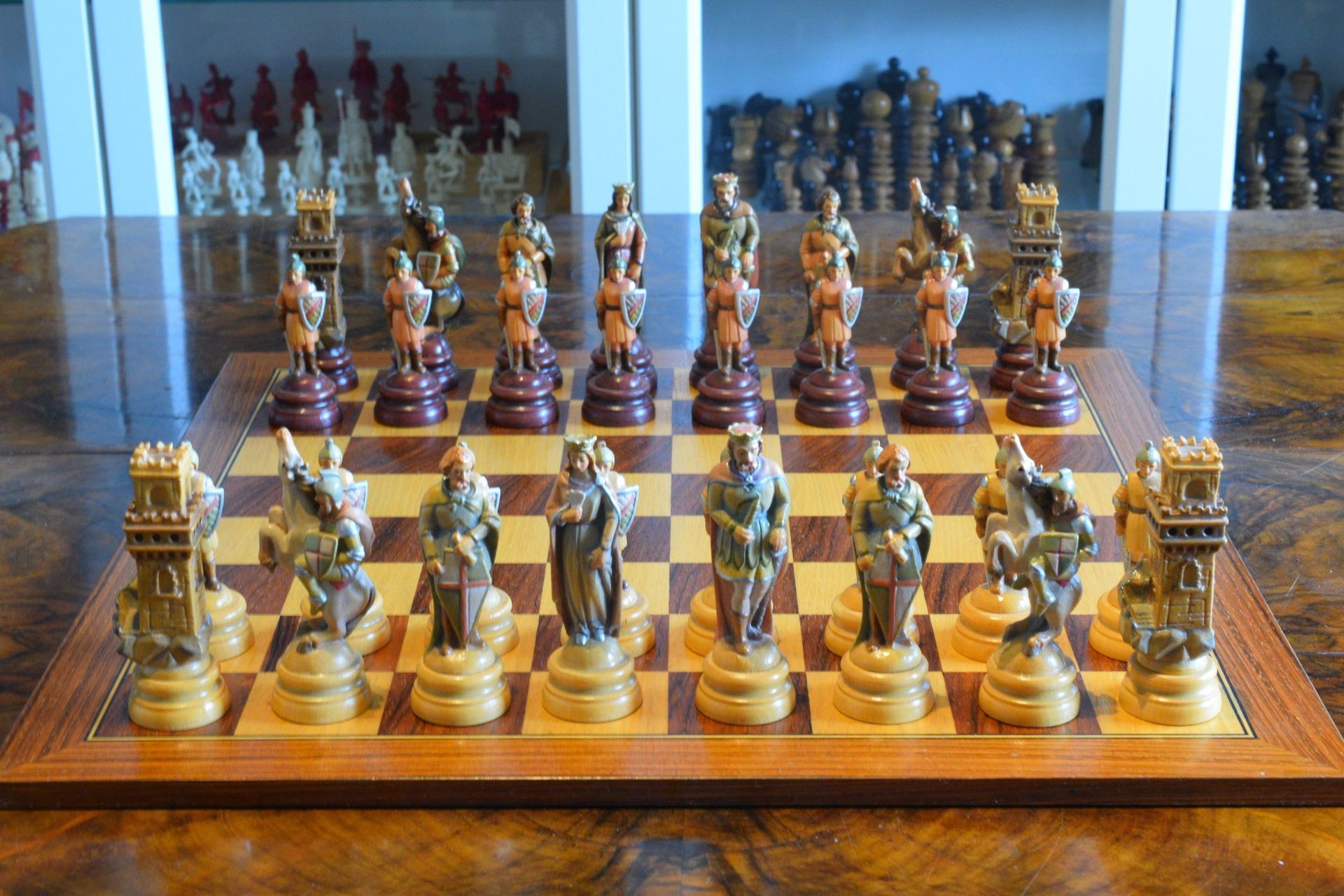 This type is very popular among the carvers of Val Gardena and usually sold under the name "Knight's Chess" (Ritterschach) or "Royal Chess" (Königliches Schach). The set resembles the Montsalvat type made in large numbers by Anton Rifesser (ANRI) from the 1950s onwards. But it differs in many details from the Montsalvat set, so I am convinced it is not an ANRI set. It was very likely made by one of the other families in Val Gardena with a long carving tradition, such as Moroder, Comploj or Demetz. While ANRI and Dolfi sets are fairly common, sets made by other carvers are rather rare. I assume, however, that these sets, like ANRI sets, were also not fully handcarved, but machine carved with a pantograph on the basis of a hand made bronze model. Nevertheless, the carving detail - emphasized by the polychrome painting - is great, which makes this a true gem of a set for any collector.