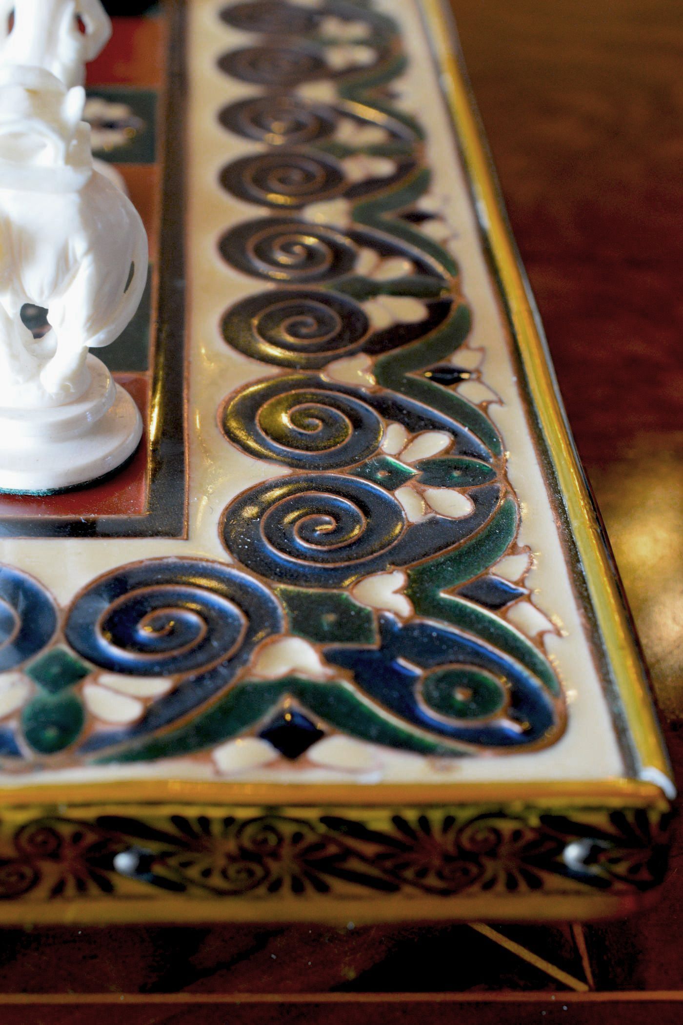 The style of the ornaments on the board is reminding of Art Nouveau or Art Déco decorations, which may indicate that the board was created around the turn of the century. For the photoshoot I paired the board with a figural ivory chess set from approximately the same period, which was made in Erbach. More pictures of the chess set can be found
