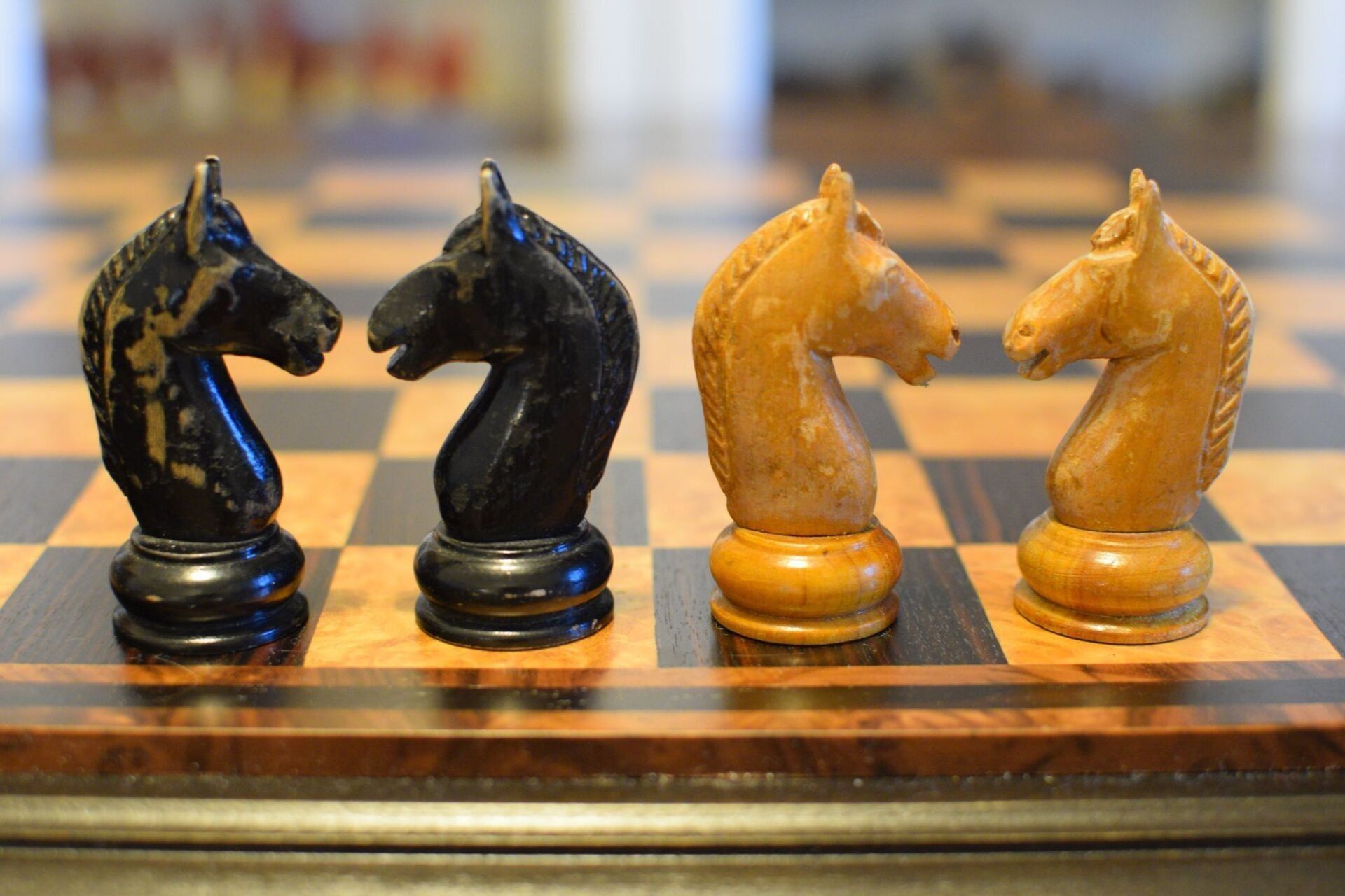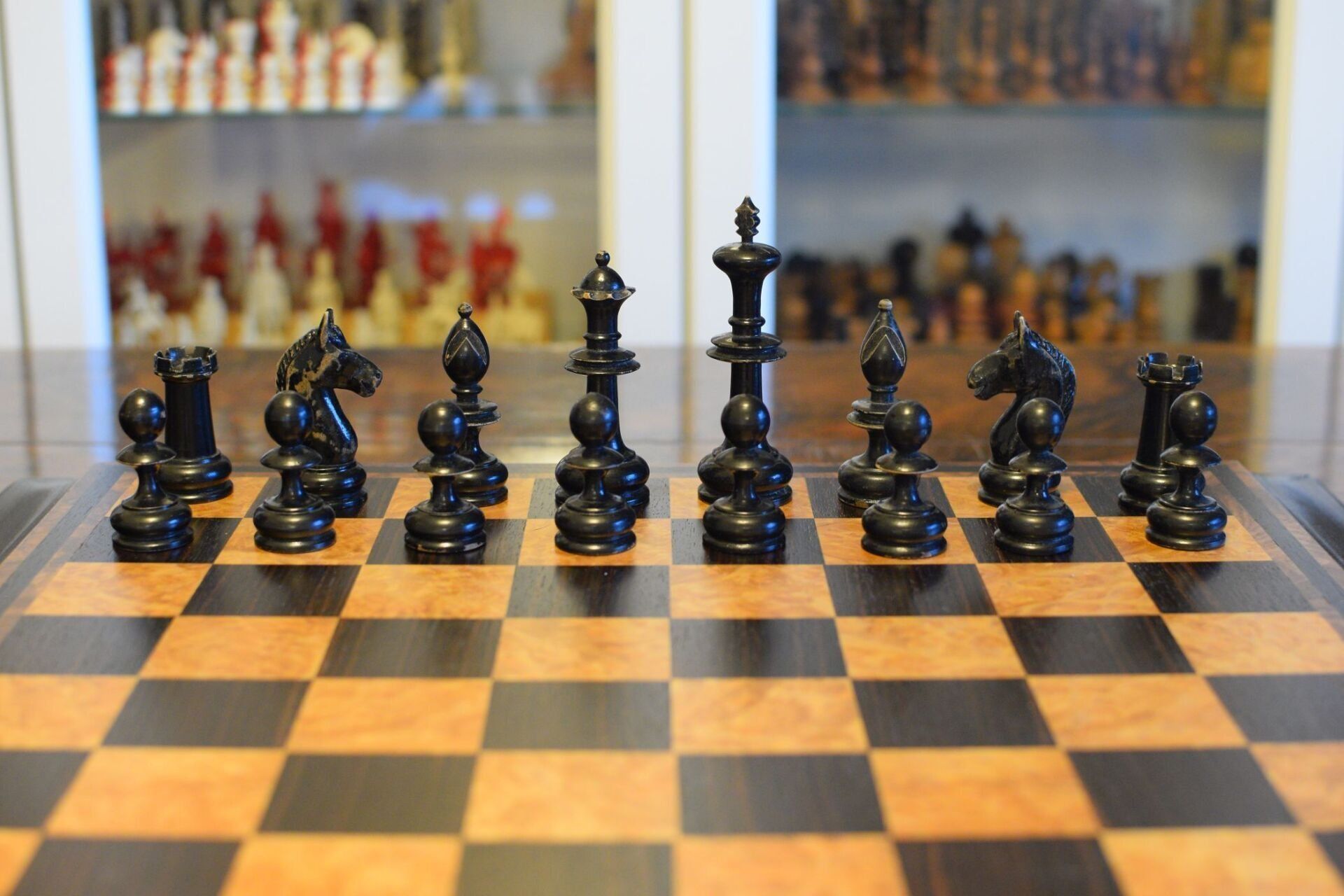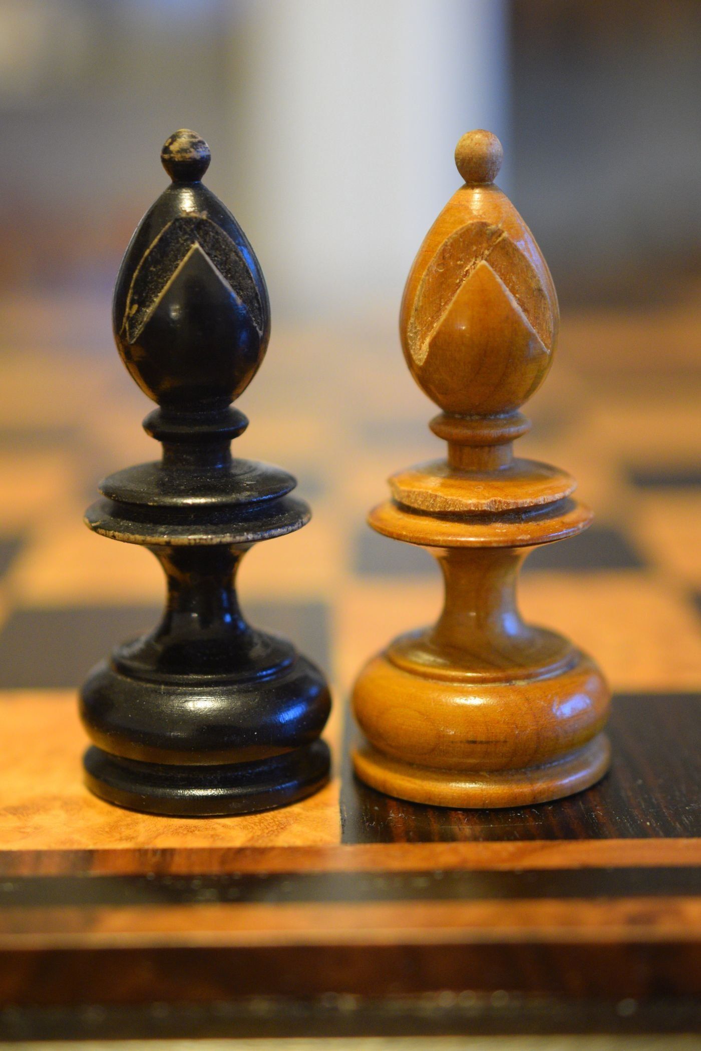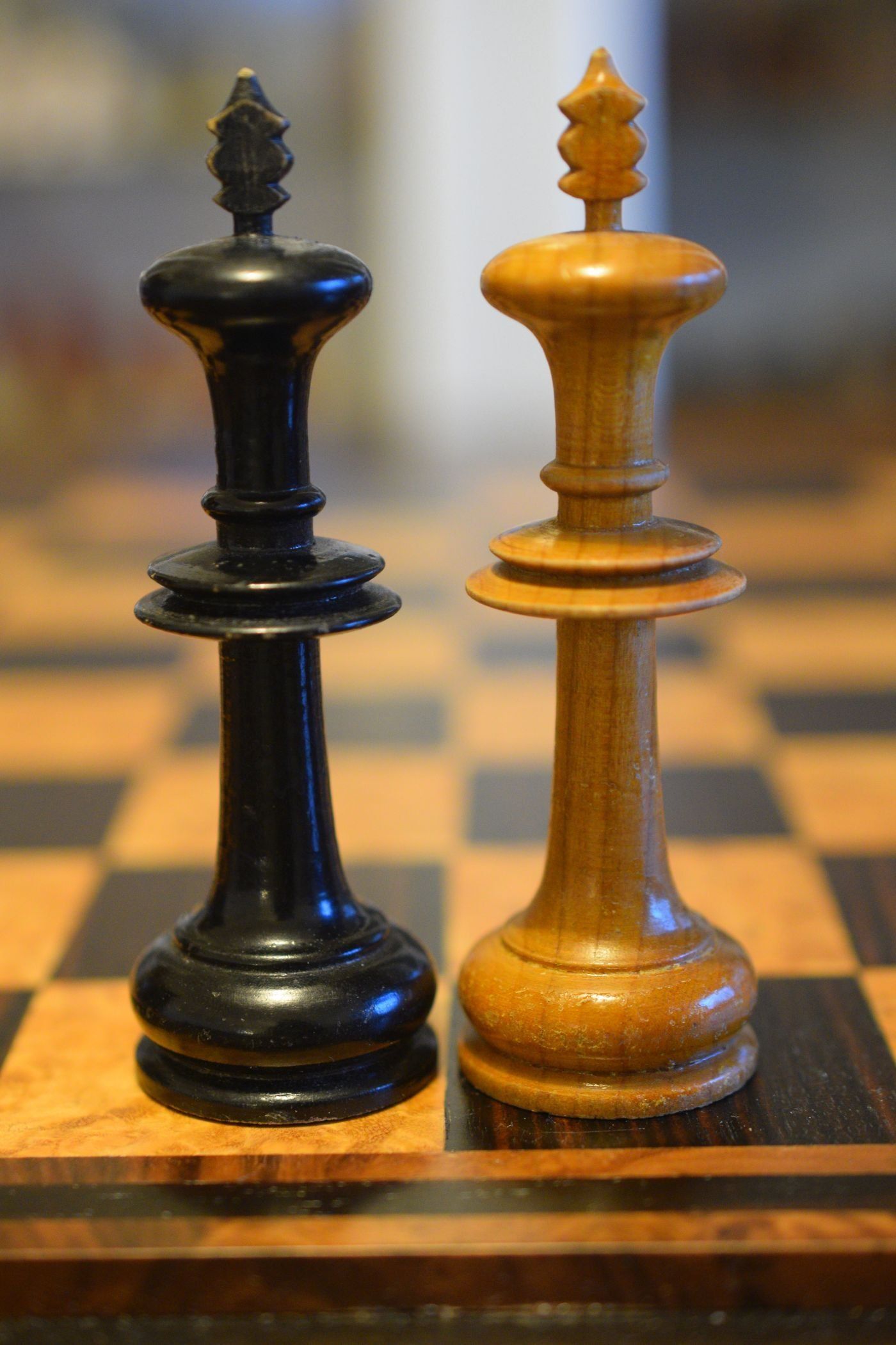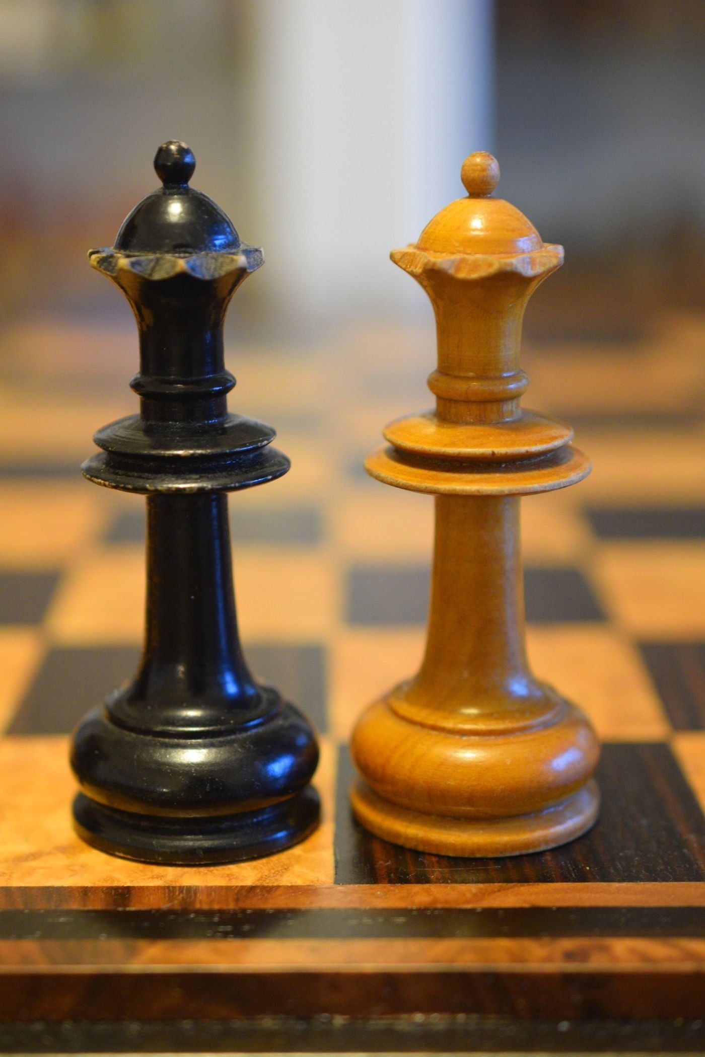 Here is another "Onion Top" chess set, this one with wooden knights. It deviates slightly from other sets of this style in that it has slimmer crowns on the kings and six crenellations on the rooks instead of four or five. The pieces are made of wood, one side ebonized, and unweighted. King size is 10 cm (3.9"). Onion top sets are, inter alia, famous for their appearance in a famous photograph showing José Raúl Capablanca with German publisher and chess promoter Bernhard Kagan (the latter often mistaken as Lasker).