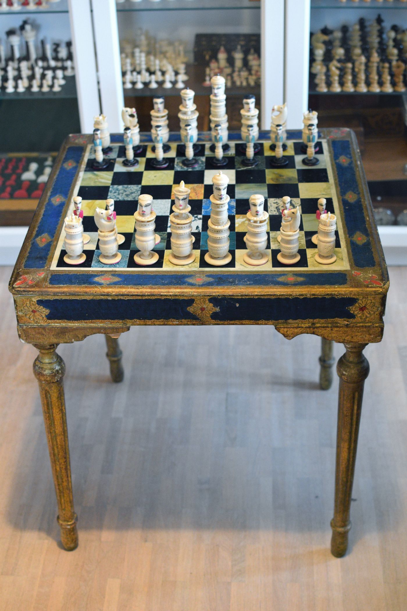 The chess set is shown on a small chess table, painted predominantly in blue and gold colour, which in my view adds to the already colourful chess pieces and gives them a slightly "Fin de siècle" style.
