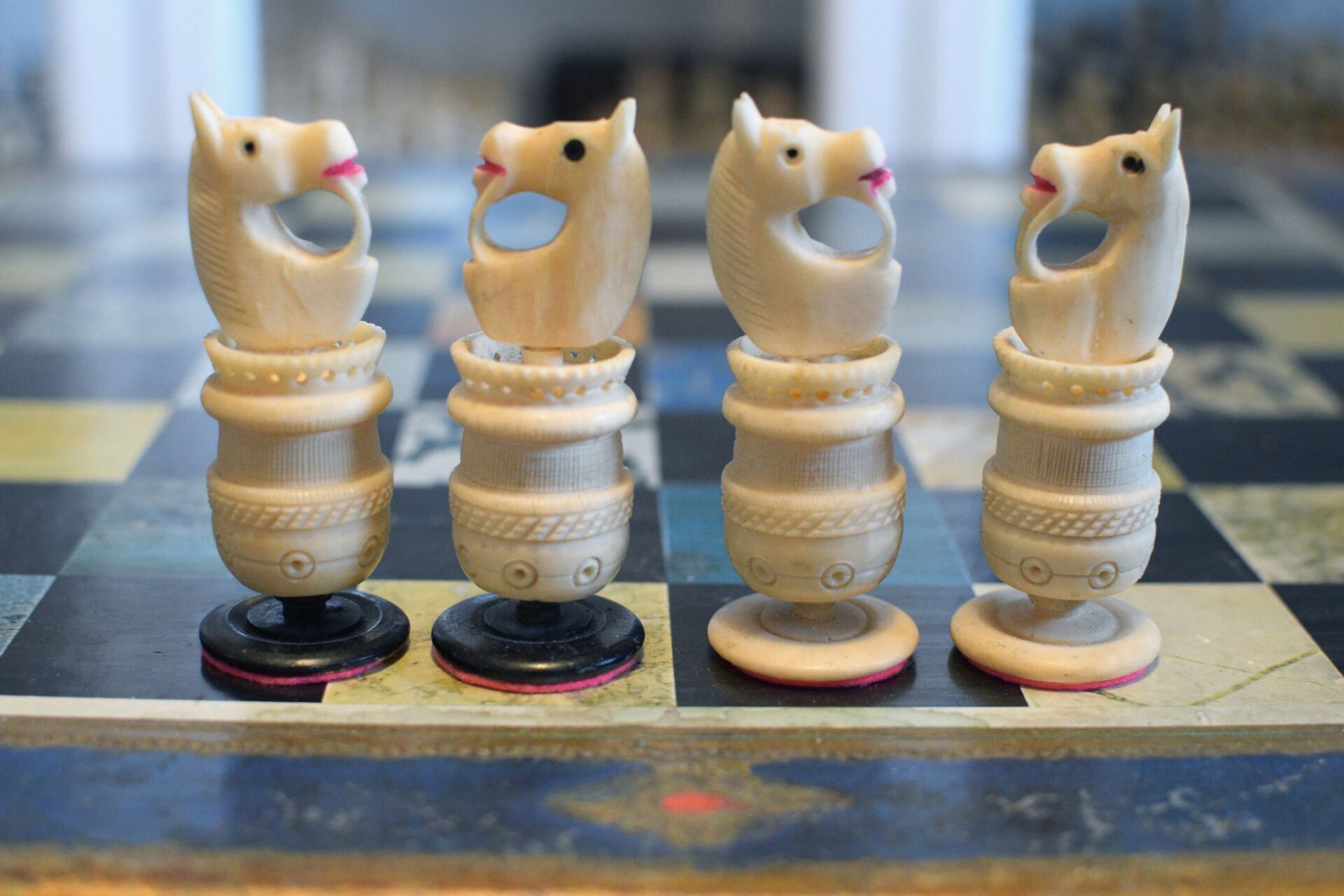 A rather unusual Mexican chess set made of bone. The set is figural in style and sometimes referred to as "Pulpit" style, due to the elongated shaped bodies consisting of pierced and serrated barrels on which the signifiers are based. They remind of the so called "Spanish Pulpit" chess pieces, hence the name, even though there is no evidence of any direct connection between the two.