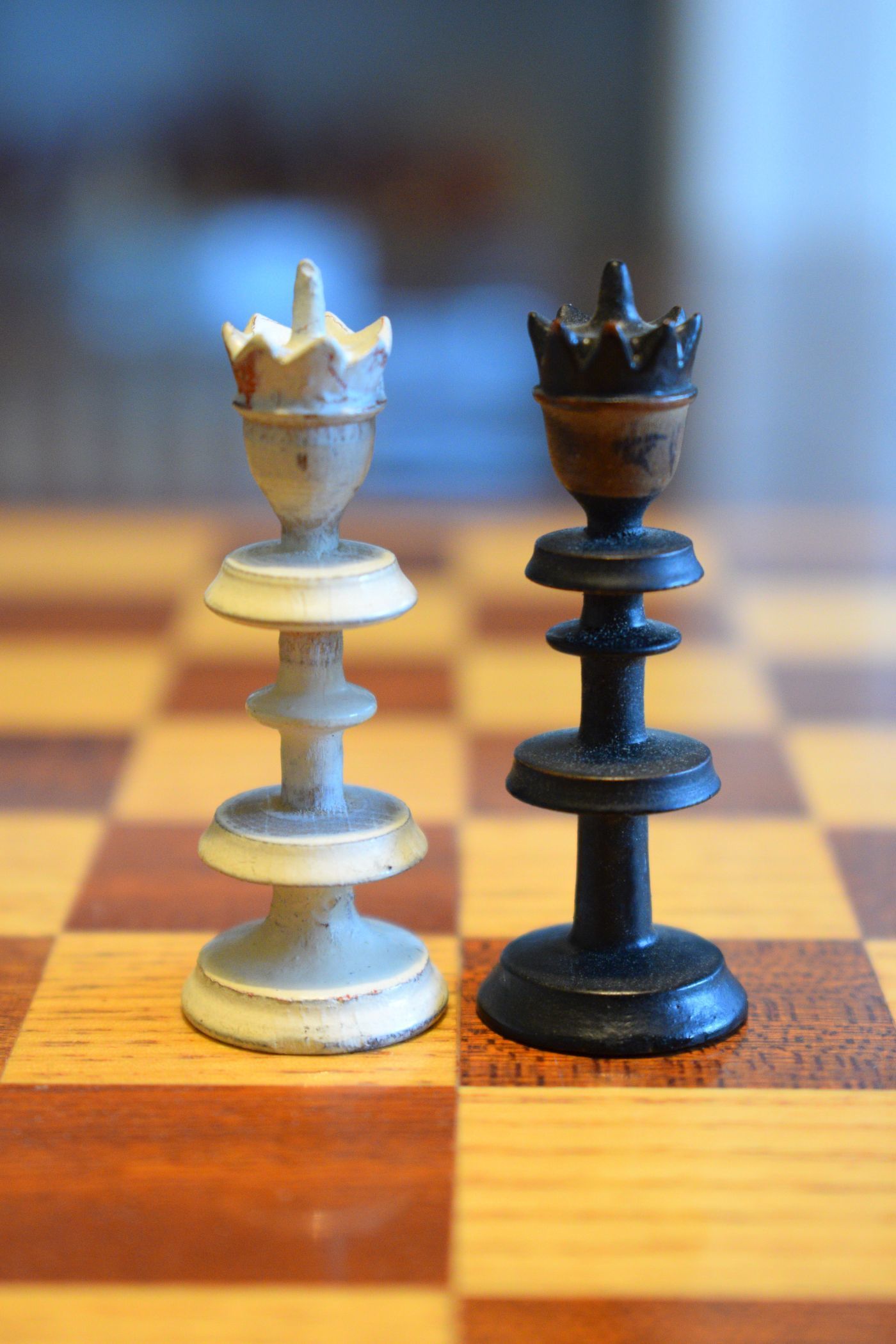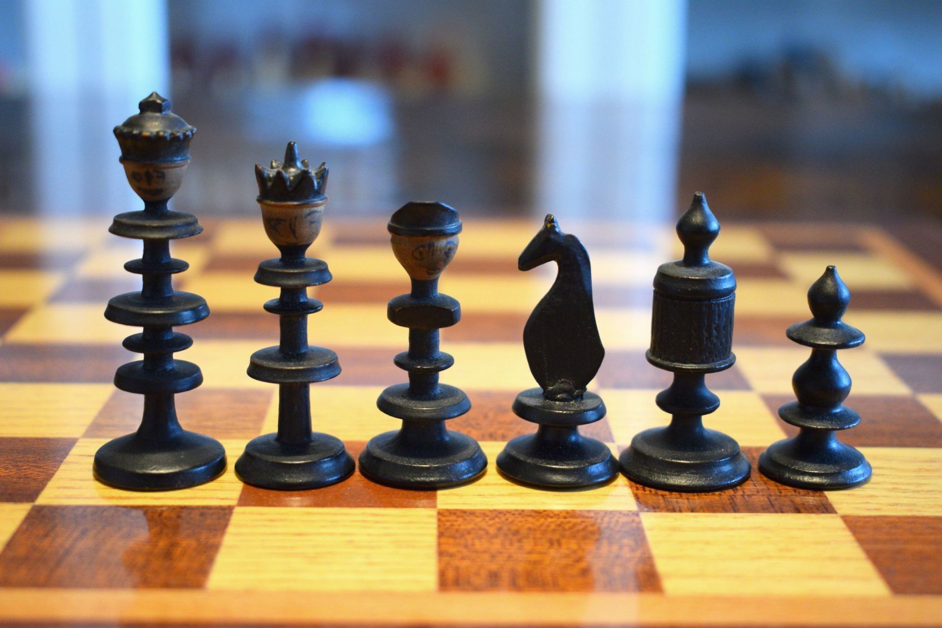 Small German "Toy" Chess Set in the tradition of the Nuremberg and Ore Mountain toy makers, probably dating to mid 19th century. Pieces made from limewood or fruitwood, the two sides distinguished by white and black colouring. Kings and Queens with painted details to the faces and tiered galleries, Rooks as simple turrets, Knights as carved horses' heads on raised galleries, Bishops with painted details to the faces and caps, one white bishop bearing a feather finial, while the other feathers are lost. Pawns of baluster outline. King 6,2 cm.