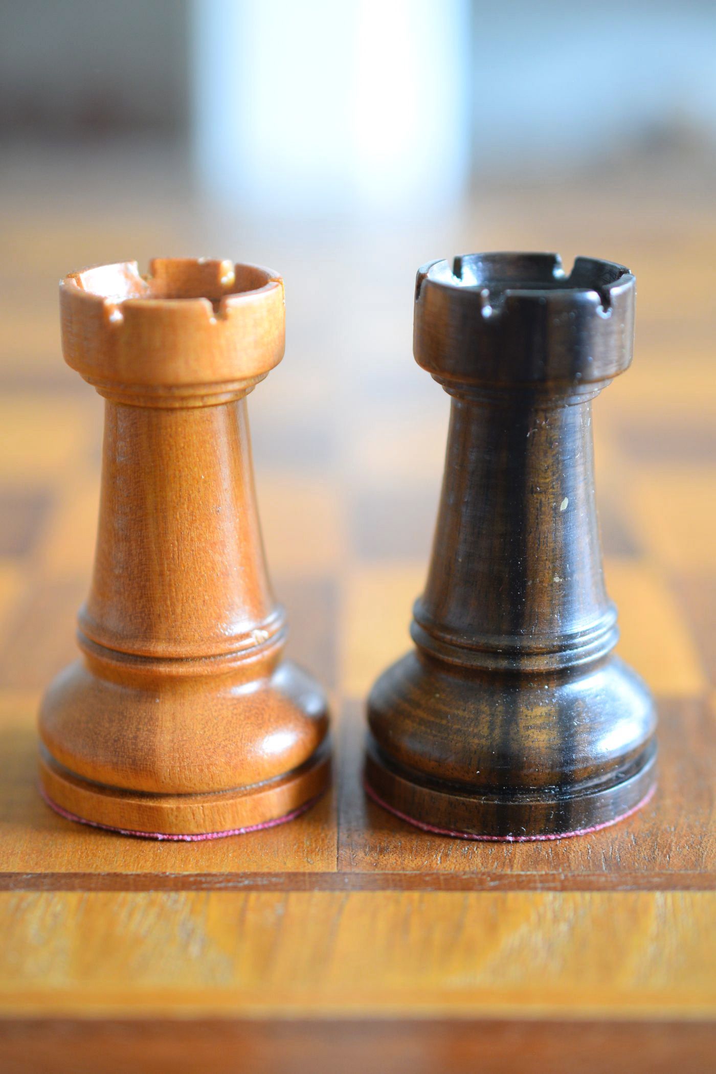 Here is probably my most elegant Philippine Staunton chess set in pristine condition with a king size of approximately 10 cm. In contrast to the usual Philippine Staunton sets, the pieces in this one are very slender with rather slim stems and triple collars on the kings, queens and bishops. Also, the crosses on the kings differ from the so called "rosary cross" usually seen on Filipino sets. The most outstanding pieces are the bishops, which have extremely unusual heads. Despite being quite modern, sets of this type are somewhat rare. I have only seen this type about 4-5 times so far and only know very few collectors who have a set like this in their collection. The last picture shows the beautiful kamagong grain on the black side pieces.
