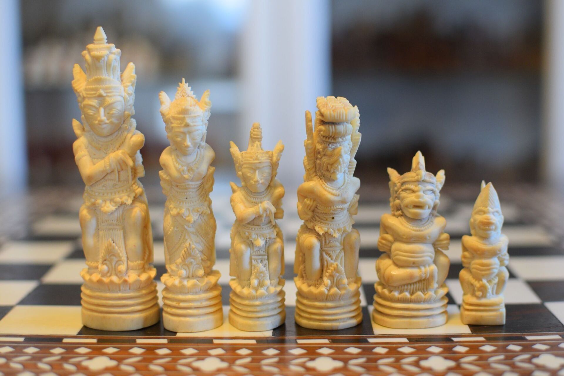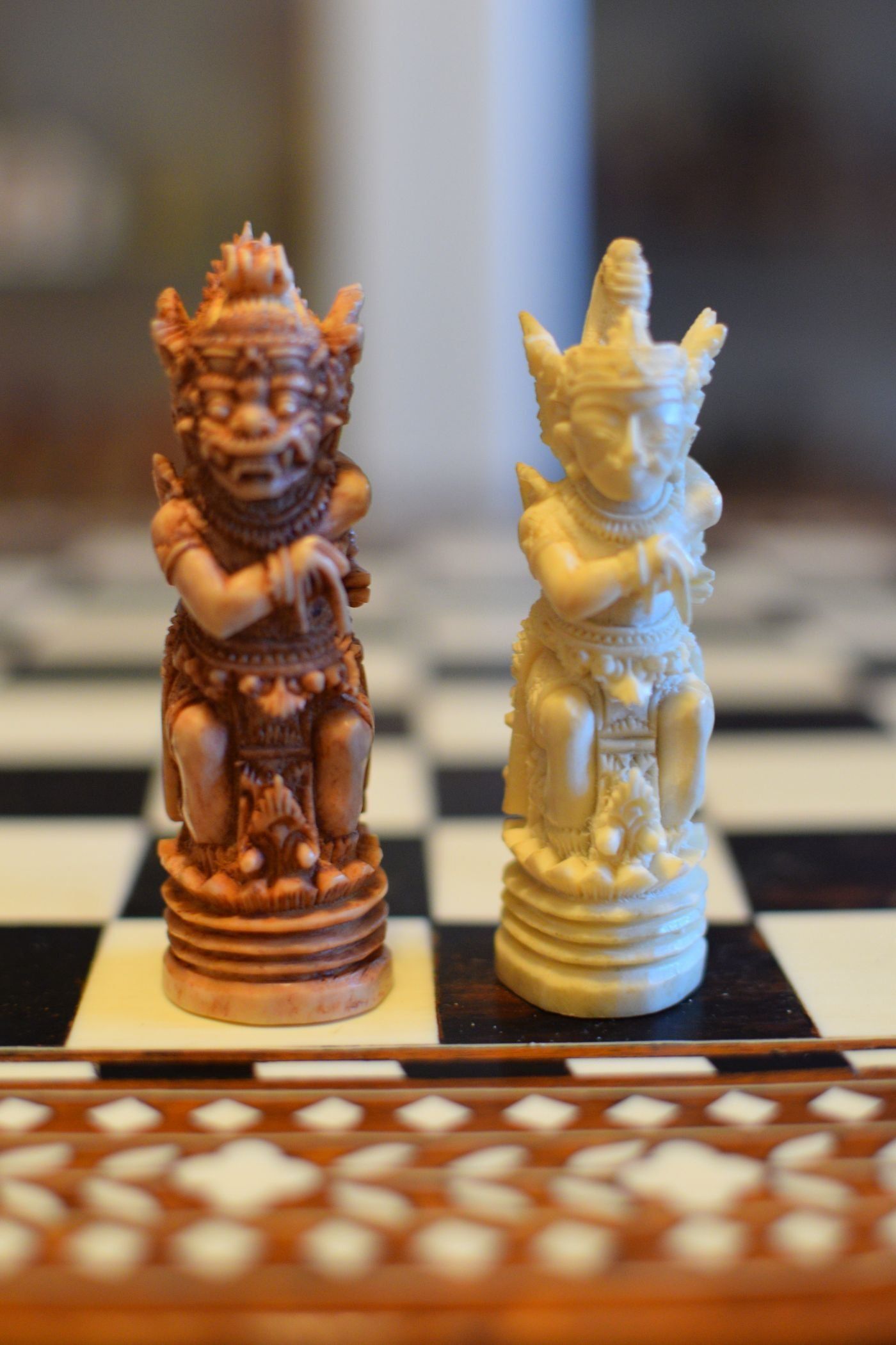 An ornamental chess set made in Bali inspired by the Mahabharata and the Ramayana, the two ancient Hindu epics. According to the former owner the set was made in Bali / Indonesia in the 1920's or 1930's, but it could in my view also date to the mid-20th century. Ned Munger shows a similar set in "Cultures, Chess & Art", Vol. 3 (Pacific Islands & Asia), figure 68, which he describes as "Regal Rama" chess set. The set has a king size of 4.3" (11 cm) and is made of Sambar deer antler, one side natural, one side tea stained. The white king and queen as Rama and Sita. the white rooks as Hanuman, the monkey king, and the white knight as the epic eagle Garuda. The white pawns as Hanuman's army of monkeys eagerly waiting to fight the black king Rwana's demon army.