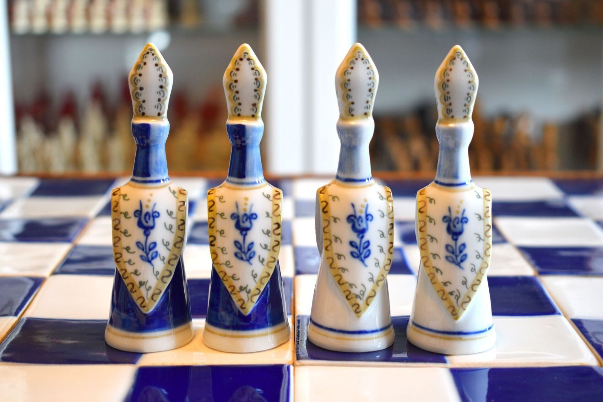 The set came in the original wooden box in which the chessmen are stored on separate trays covered in blue velvet. It also came with a 50 cm square blue and white ceramic tile chess board with a solid wooden frame.