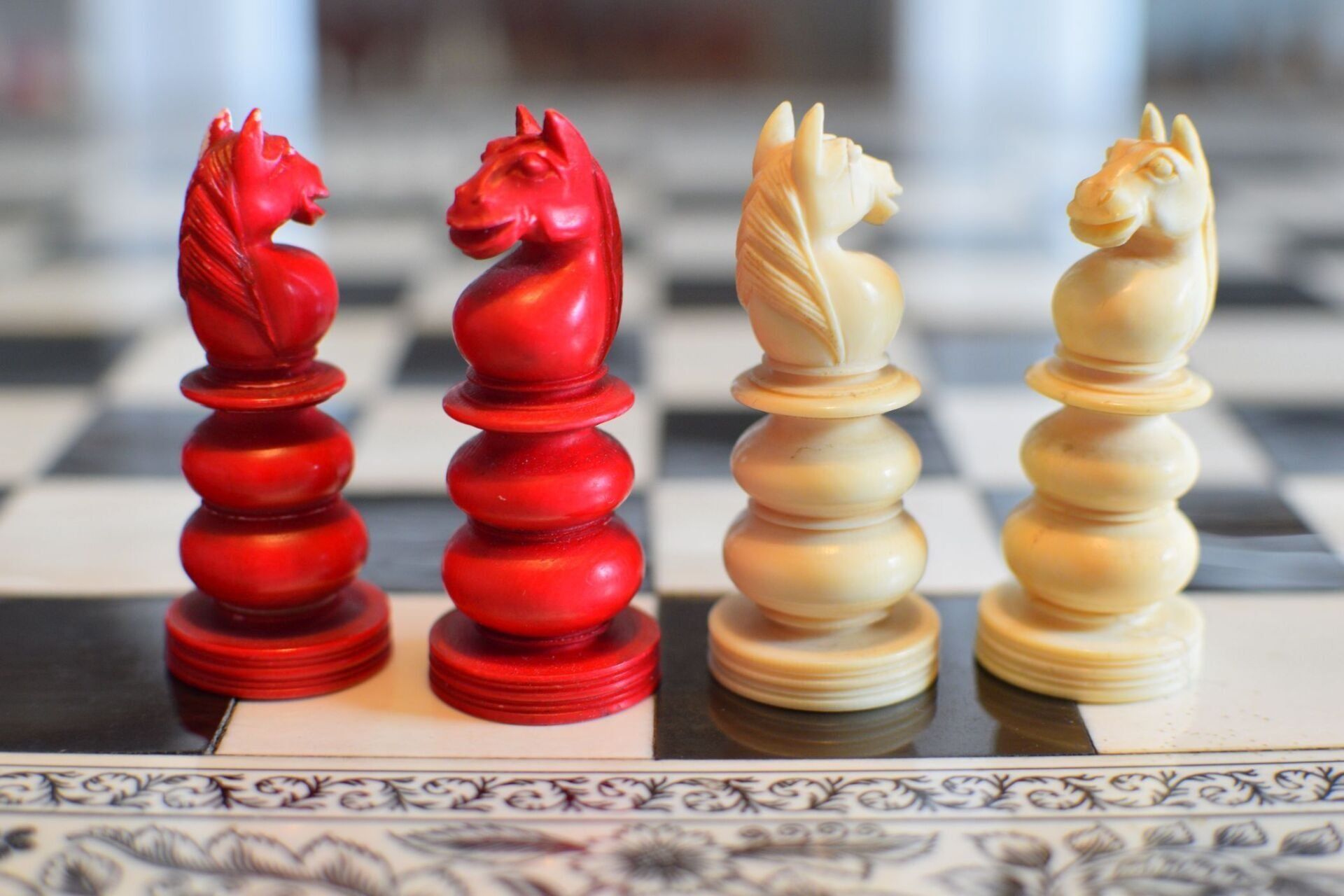 A bit of a break in style, the set is shown on a late 19th century Indian chess board. It is a very beautiful example of Indian marquetry and sgraffito work typical for just a handful of workshops in the Vizagatapam area. The board is based on a solid sandalwood base plate on which ivory veneers for the white squares and horn veneers for the black squares were applied. The broad rim is decorated with flower and foliage ornaments applied as sgraffito work. The pattern is drawn on the ivory and worked into the ivory with small incisions. Then molten lac is poured into the cuts, and when it is dry, scraped off and polished so that only the lac in the pattern incisions remains.