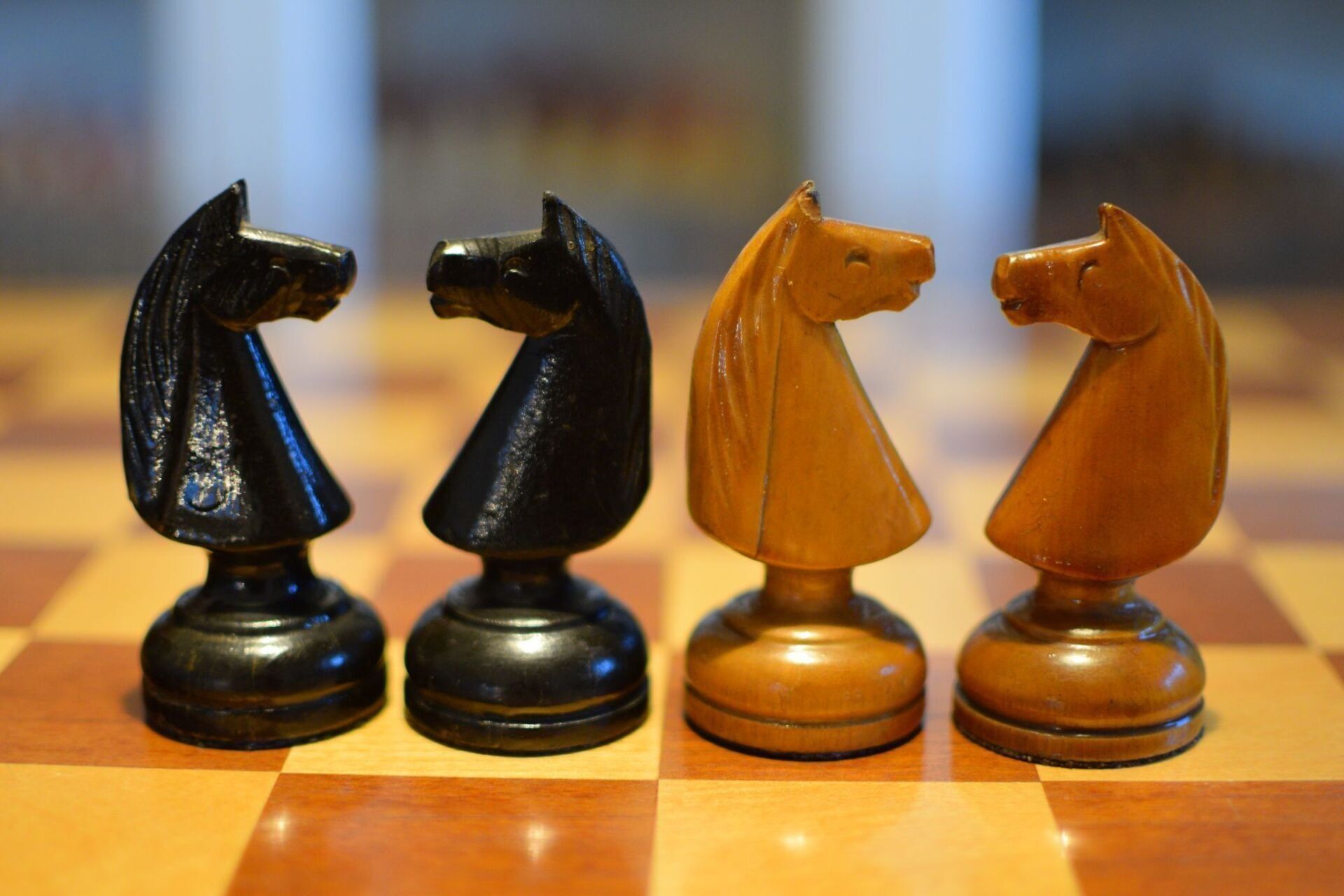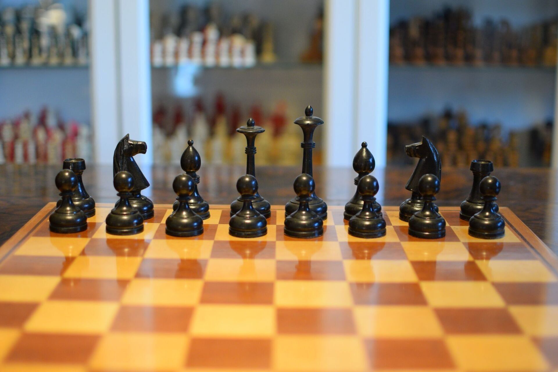 The true origin of this chess set's design seems to be a mystery. Nicholas Lanier called them "Svelte Pieces" and assumed these sets have Baltic-German roots, but it seems there is no conclusive evidence for that. Sometimes these sets are referred to as Soviet mushroom sets. What is certain is that these sets were well known in the Soviet Union. There is a famous picture by Robert Capa showing two boys playing with this type of set in a park in Moscow. The picture dates back to 1947, which makes me believe that the design is older and probably goes back to the 1930's. The set is weighted and has a king size of 10 cm.
