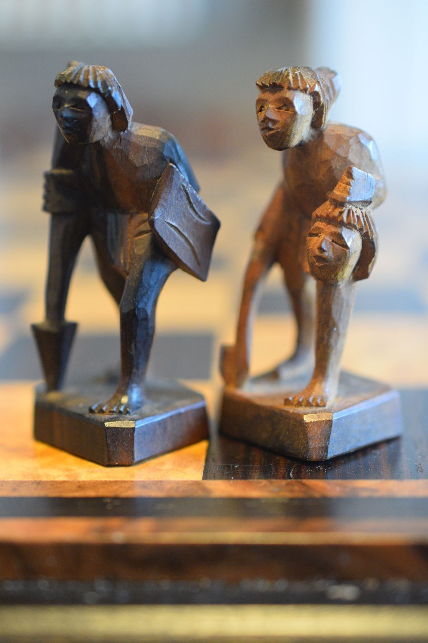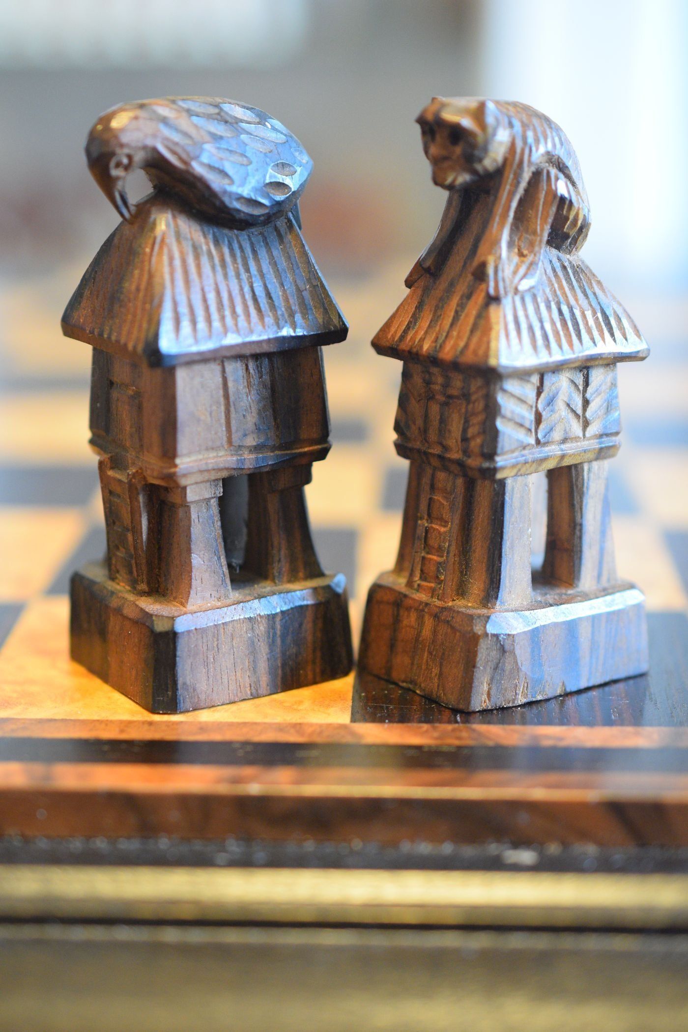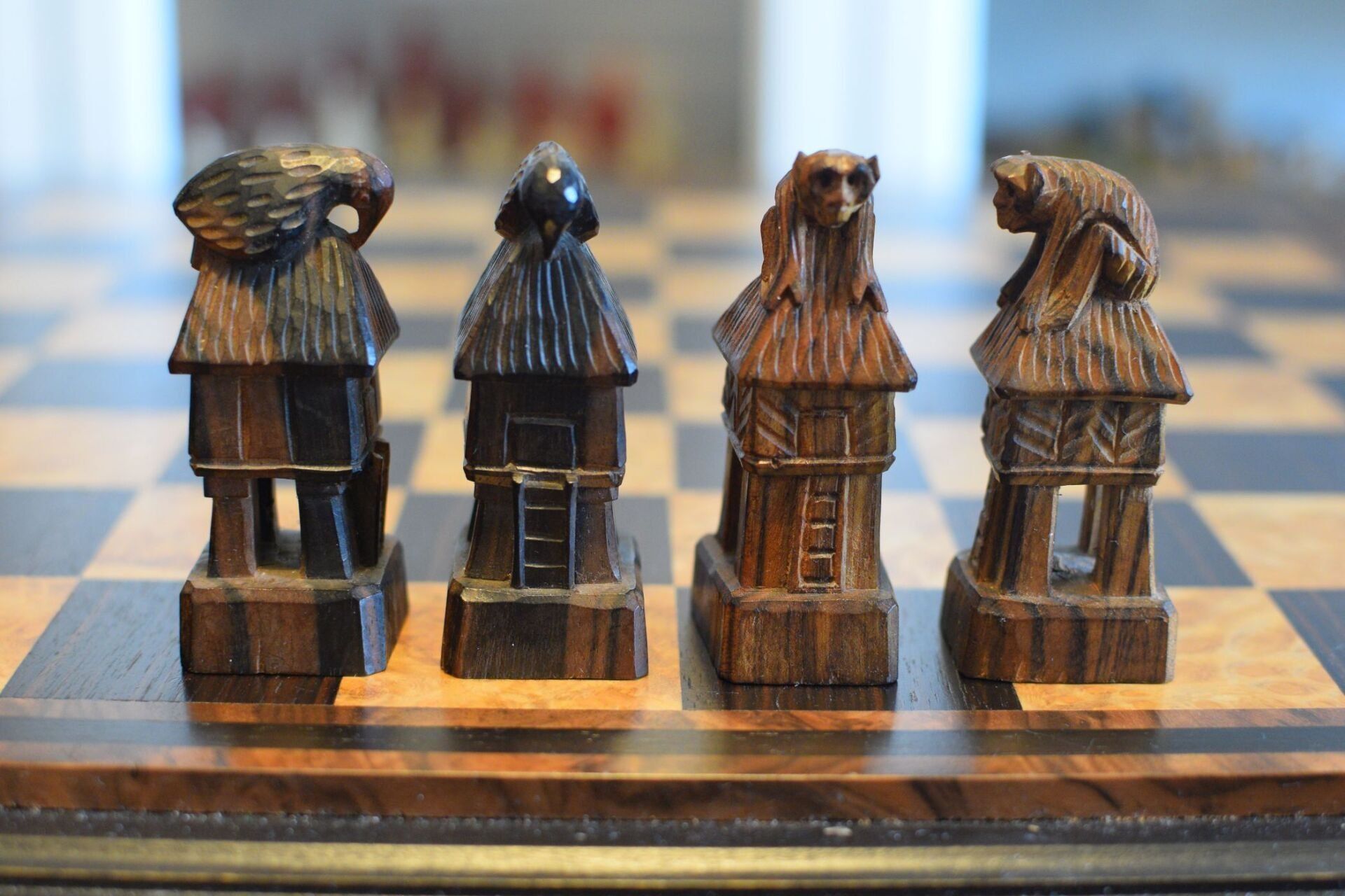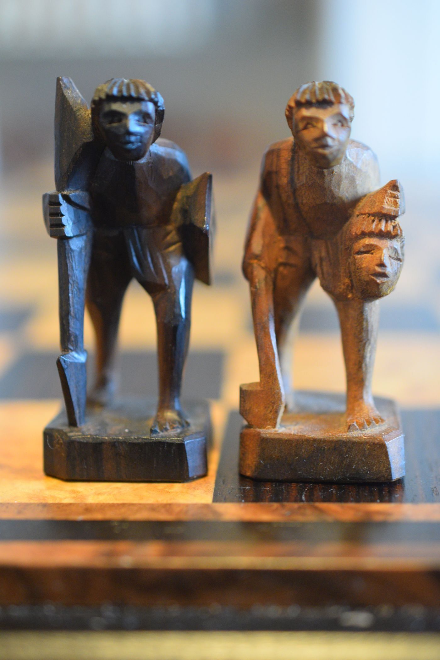 The chess set is showing two ethnic groups from the region, the Bontoc on the white side and the Ifugao on the black side. Both belong to the Igorot people. Both kings are shown as chieftains carrying a hunting spear. The white queen is carrying a baby on her back, while the black queen is carrying some kind of rattan backpack used to transport rice or other goods. The rooks are nipa huts typical of the region with a monkey on top of the white hut and a bird on top of the black hut. The white knights are carabao, the local water buffalo, the black knights are Philippine deer. The bishops are tribesmen. The white bishop is carrying a jar, probably containing rice wine used in religious ceremonies. The black bishop is carrying a bird holding it by its wings in front of his chest. The pawns as tribal warriors, the white pawn carrying an axe in his right hand and an enemy's head in his left, thus symbolizing the reputation of the Bontoc people as infamous headhunters. The black pawn is carrying a spear and a shield.