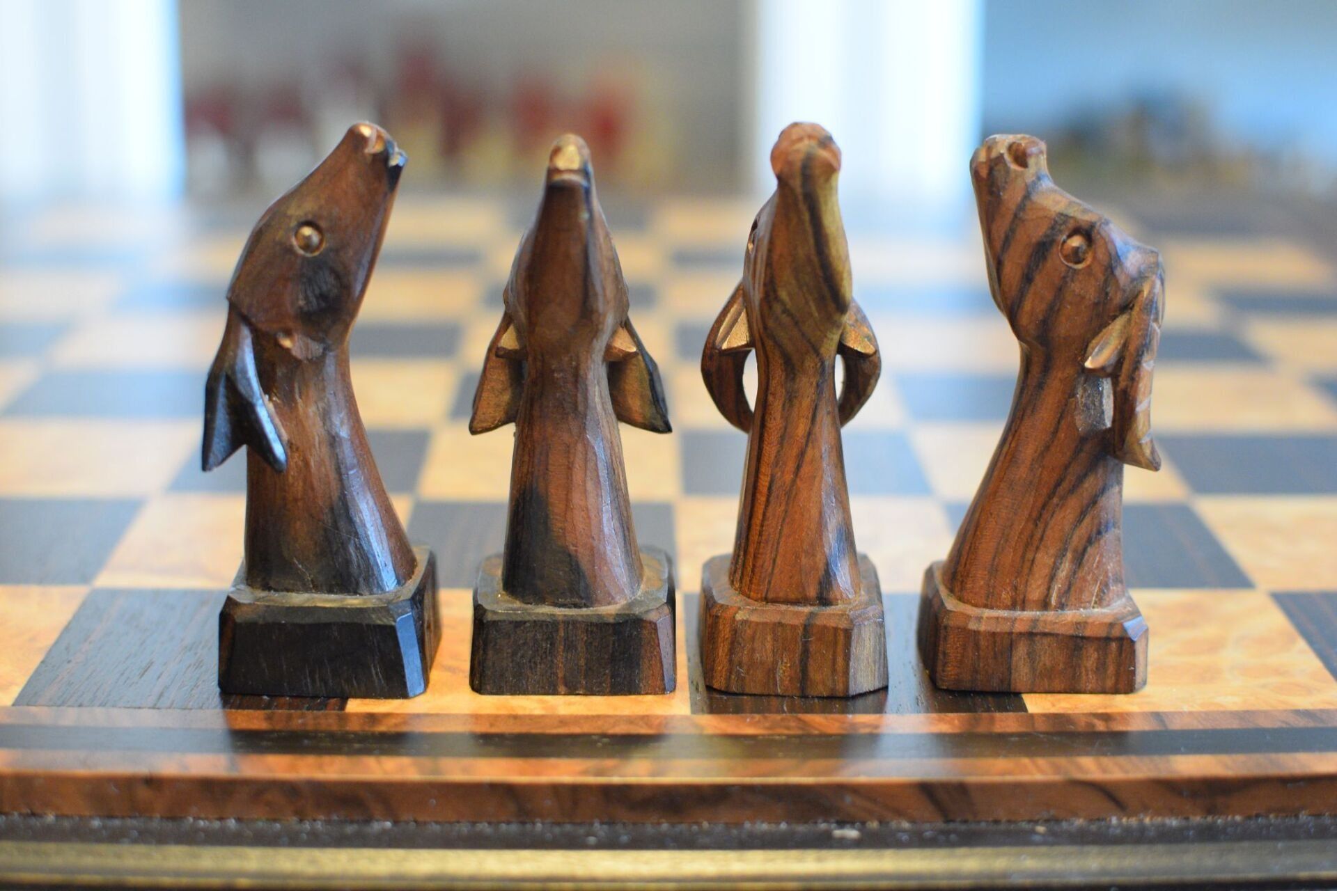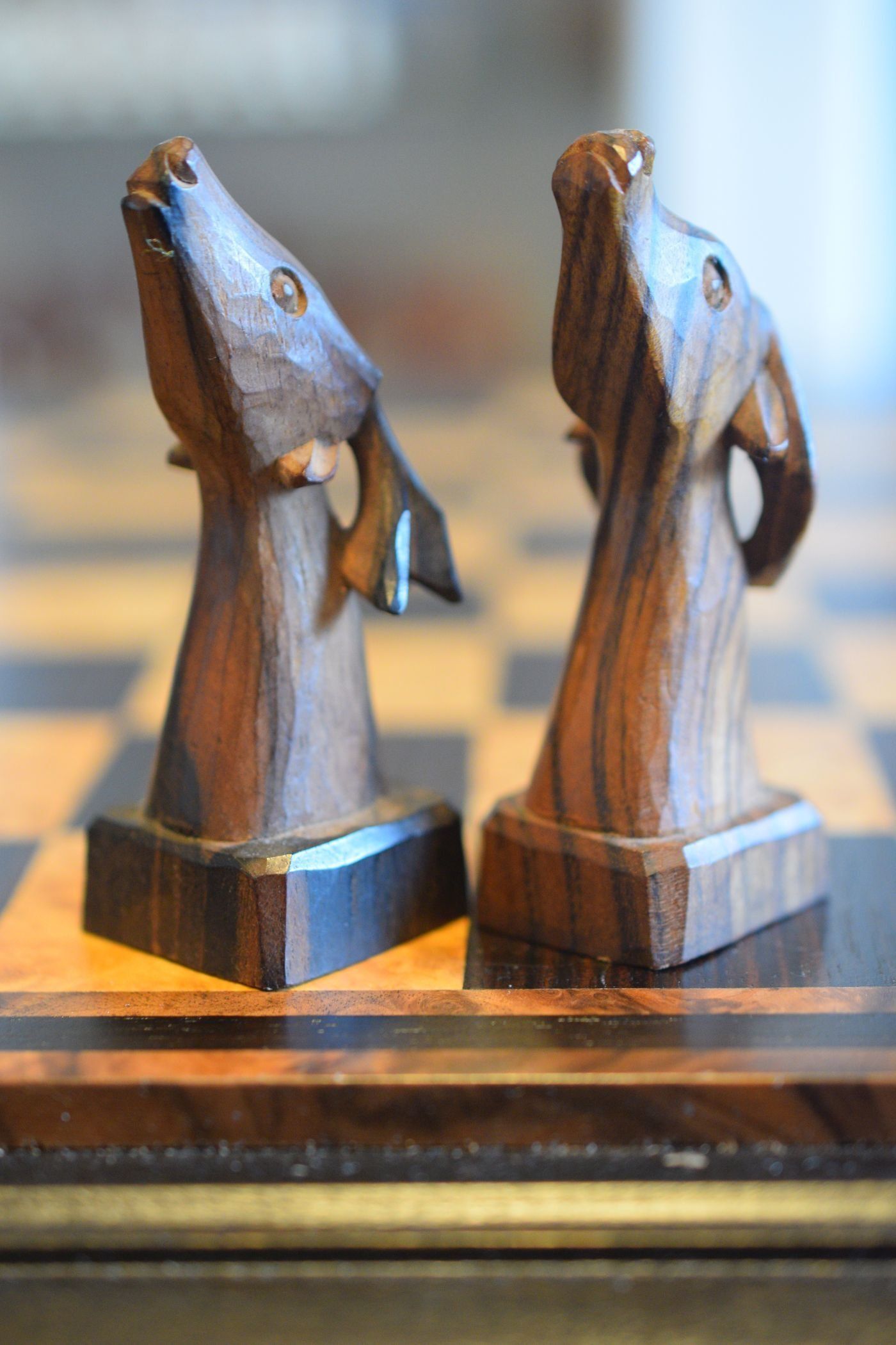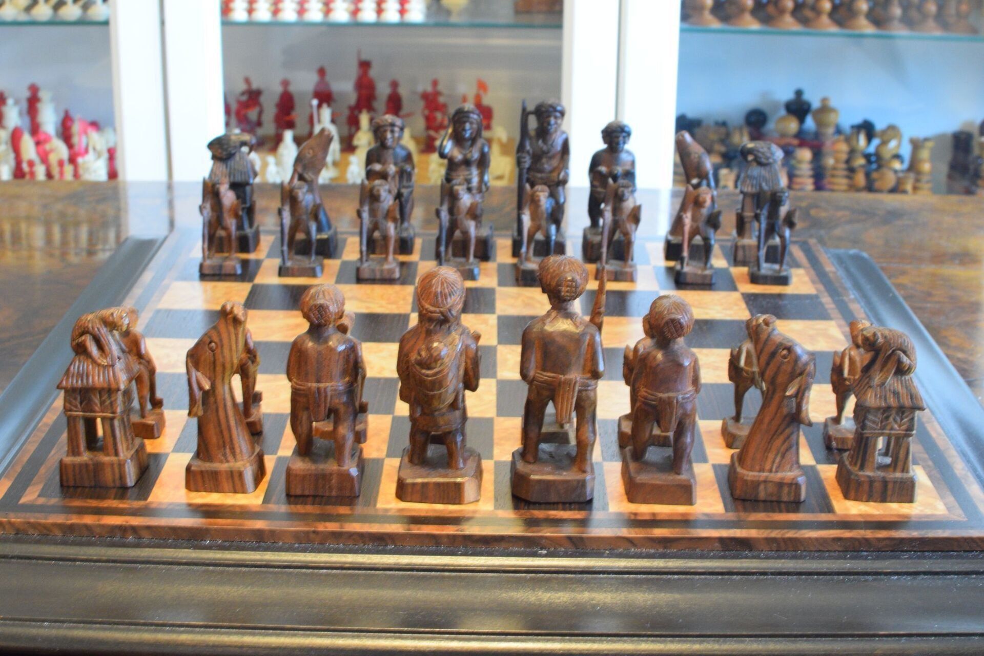 Philippine tribal chess set which was made by a local artist in the Banaue region in Northern Luzon. When the set was purchased in the 1970's its maker had recently deceased, as he was a guerilla fighter engaged in combat against the Marcos regime. It was one of the last sets he made and was sold to the last owner by the carver's widow. The pieces are hand carved from local ebony timbers, in particular kamagong for the black pieces and a lighter ebony with a dark grain for the white pieces. Distinguishing the pieces by the colour of the wood is difficult, which is of secondary importance, however, as the set is mainly a decorative one.