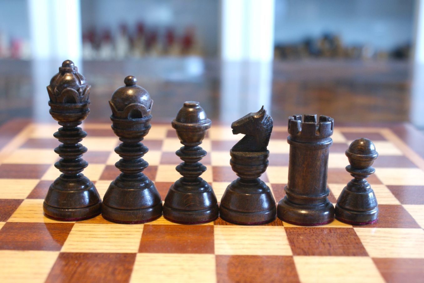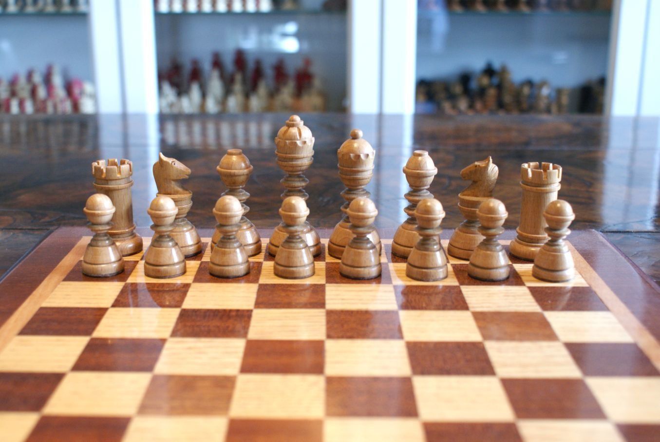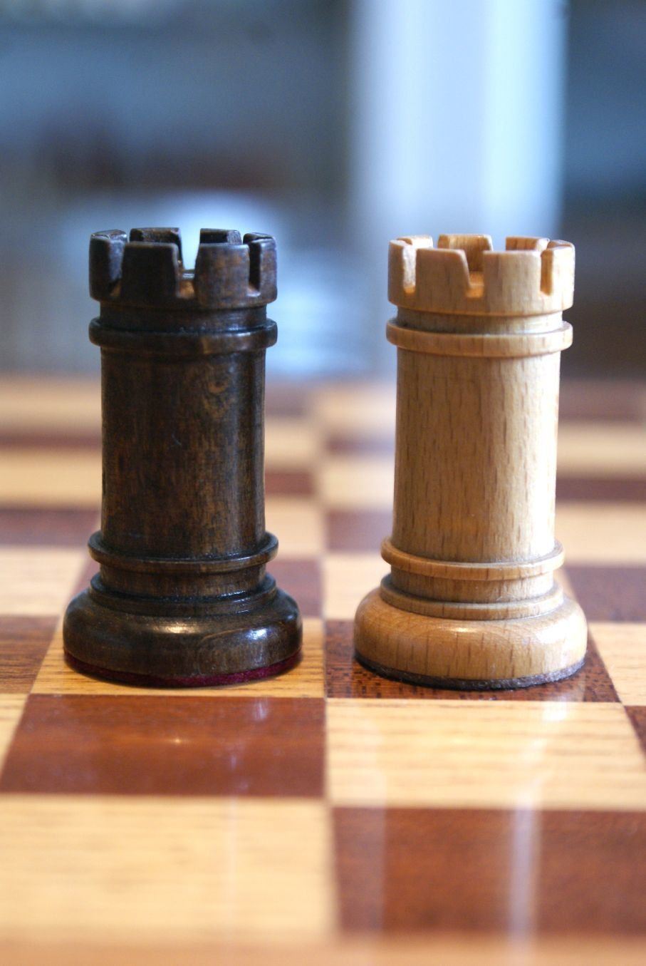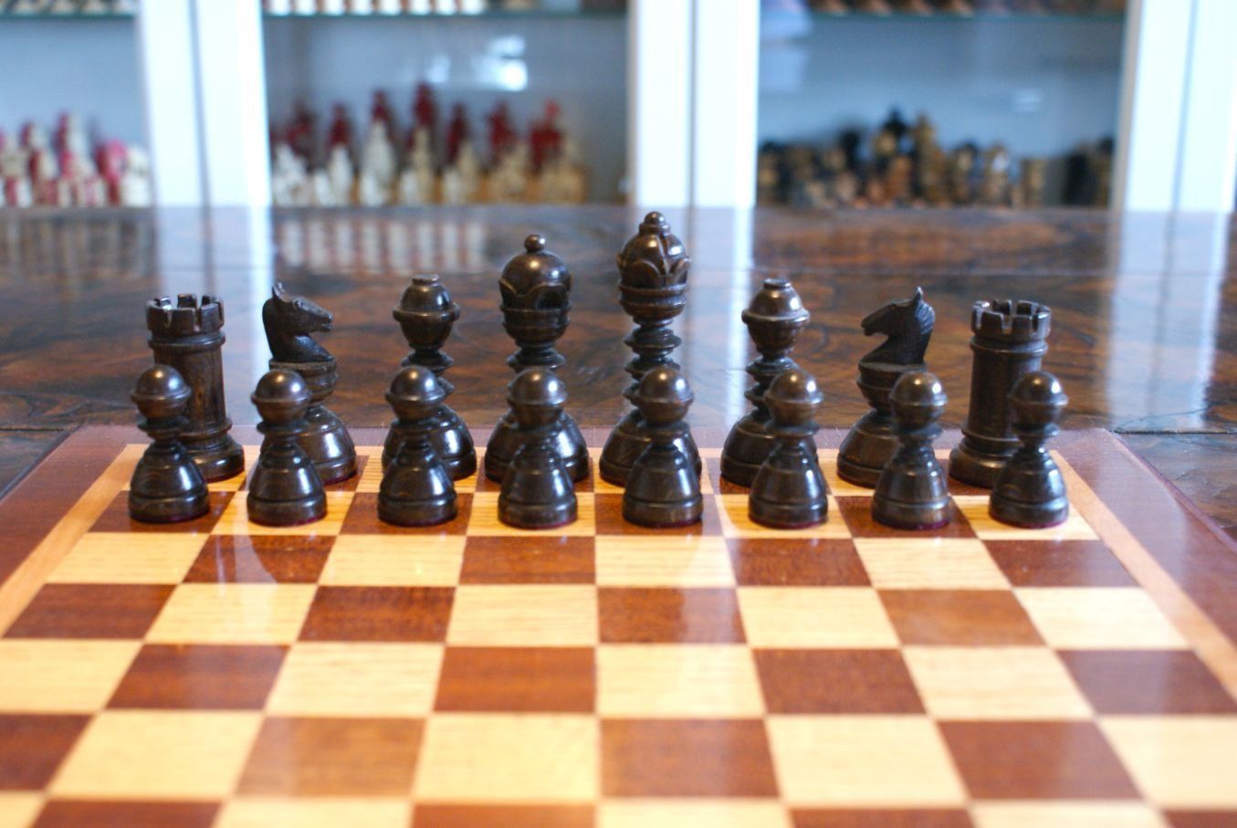 A small chess set made of wood with a king size of 69 mm (2.7"). The pieces are felted with burgundy and beige felts, but not weighted. The set was probably made in Germany in the second half of the 20th century. Apart from the unusual heads of the bishops and pawns and the rooks as tall turrets with eight crenellations, the set shows another peculiarity which is noticeable only on second sight: the kings and queens have different crowns and coronets.