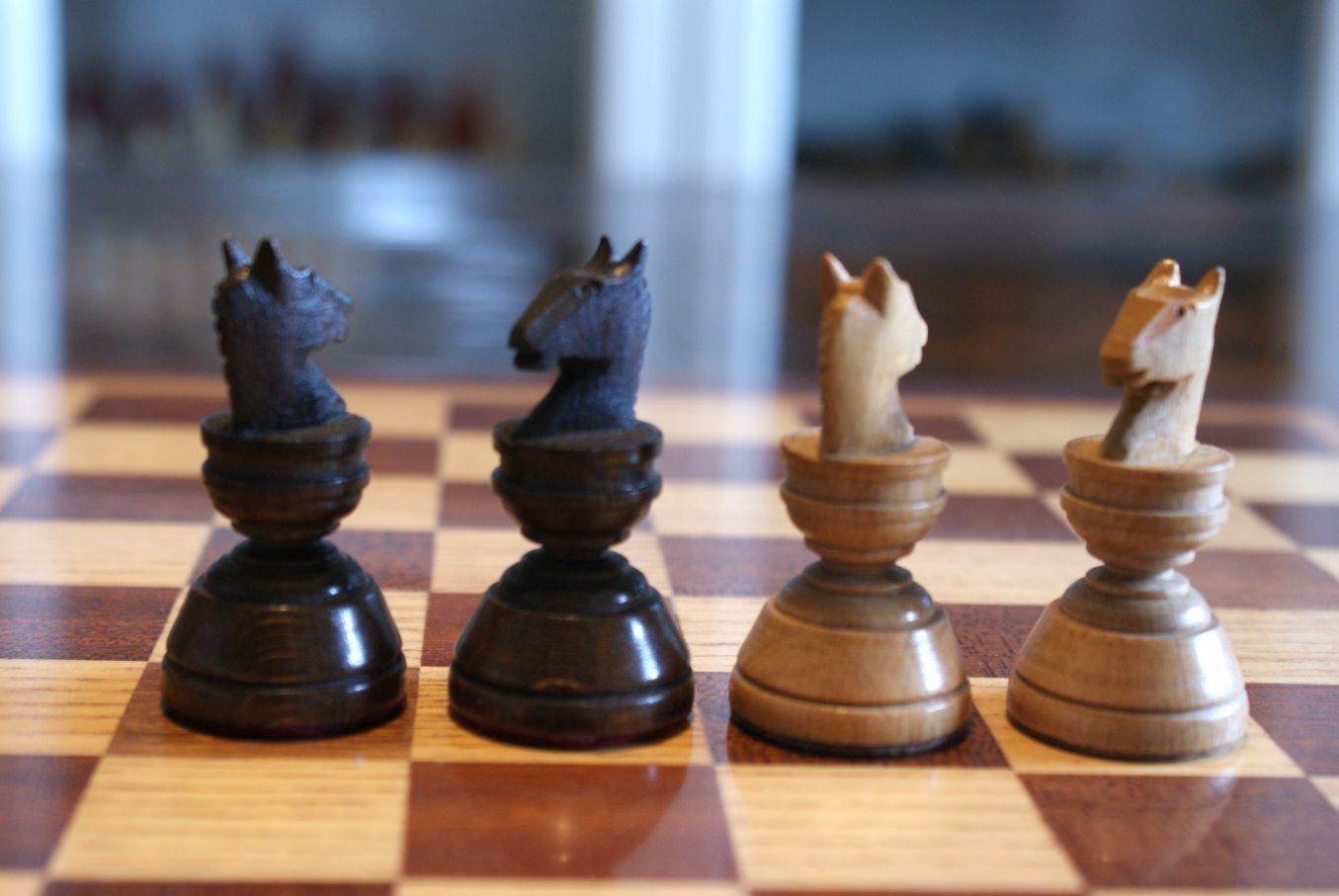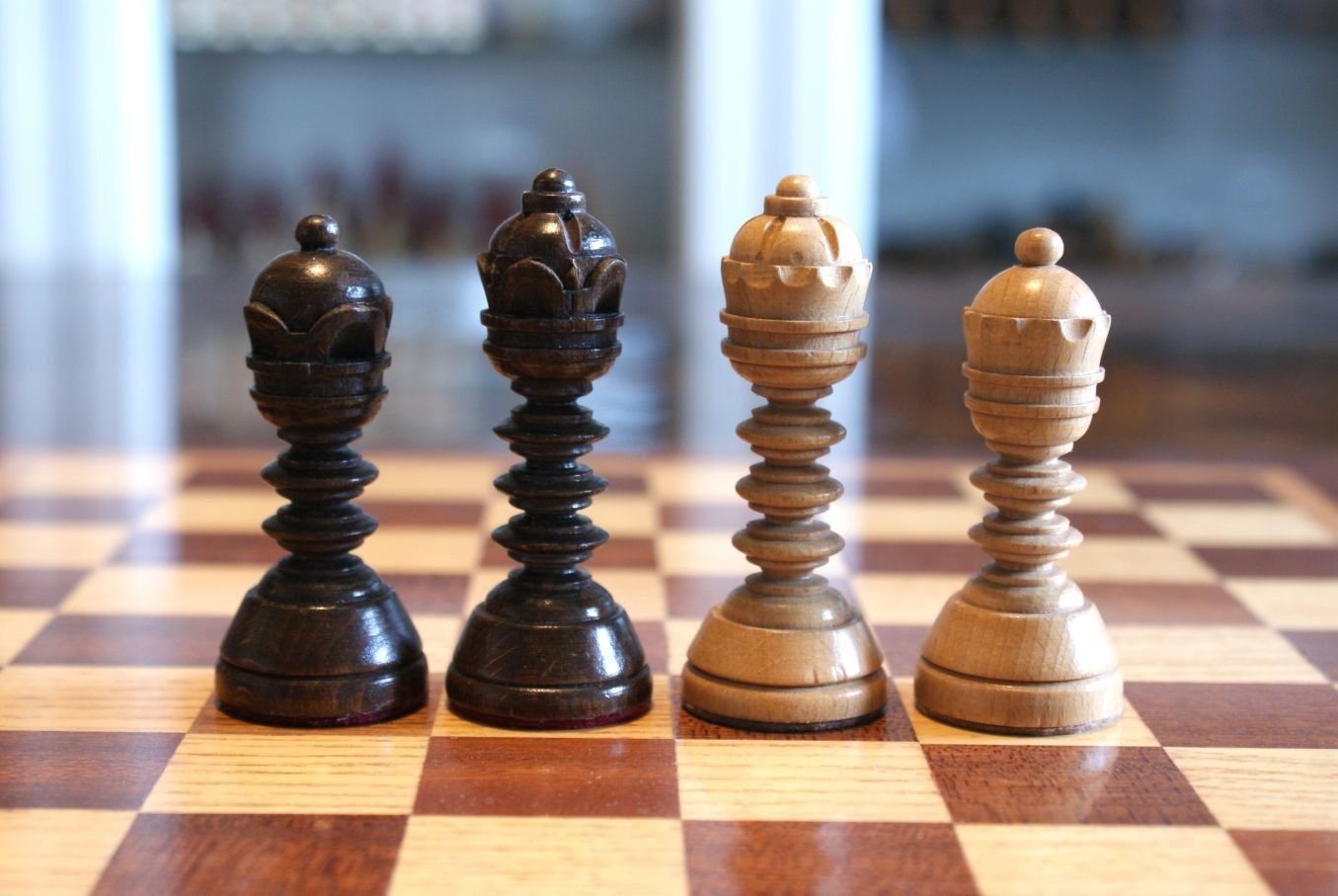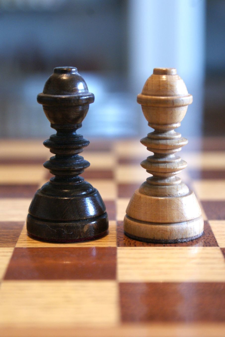 A small chess set made of wood with a king size of 69 mm (2.7"). The pieces are felted with burgundy and beige felts, but not weighted. The set was probably made in Germany in the second half of the 20th century. Apart from the unusual heads of the bishops and pawns and the rooks as tall turrets with eight crenellations, the set shows another peculiarity which is noticeable only on second sight: the kings and queens have different crowns and coronets.