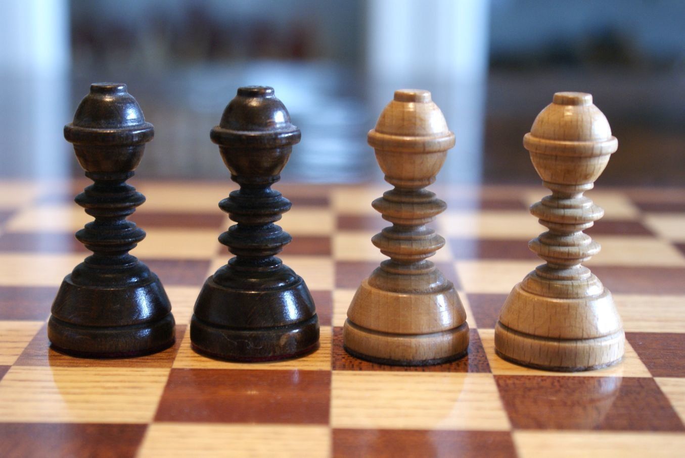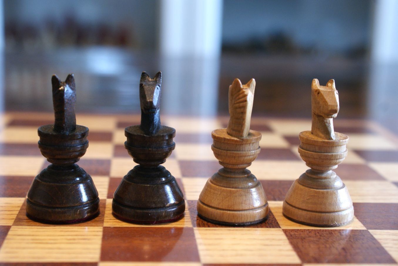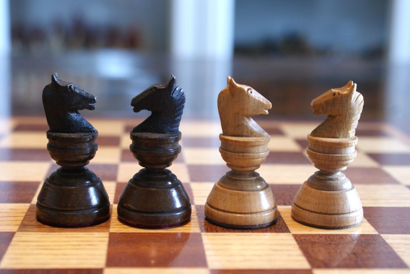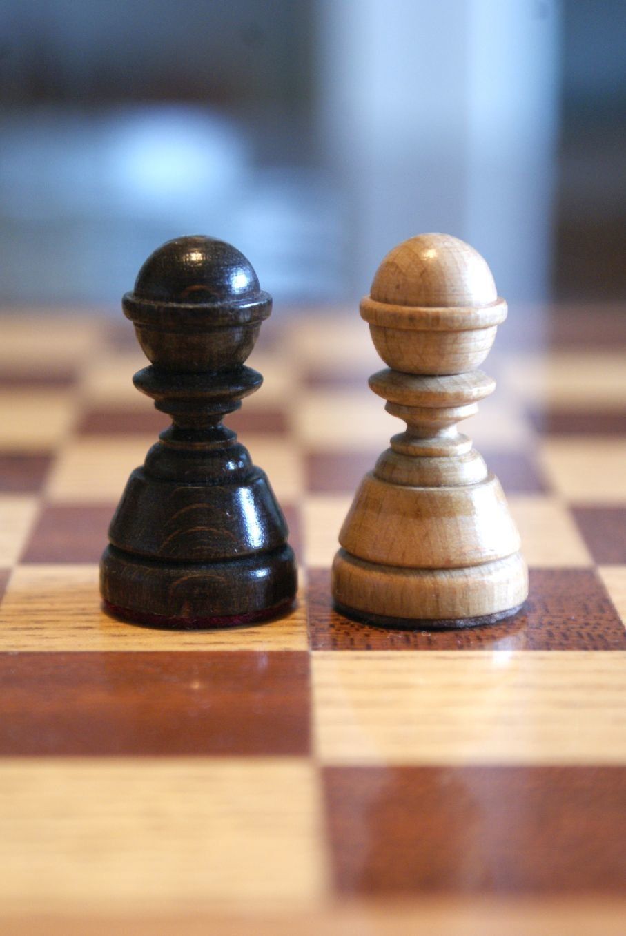 A small chess set made of wood with a king size of 69 mm (2.7"). The pieces are felted with burgundy and beige felts, but not weighted. The set was probably made in Germany in the second half of the 20th century. Apart from the unusual heads of the bishops and pawns and the rooks as tall turrets with eight crenellations, the set shows another peculiarity which is noticeable only on second sight: the kings and queens have different crowns and coronets.
