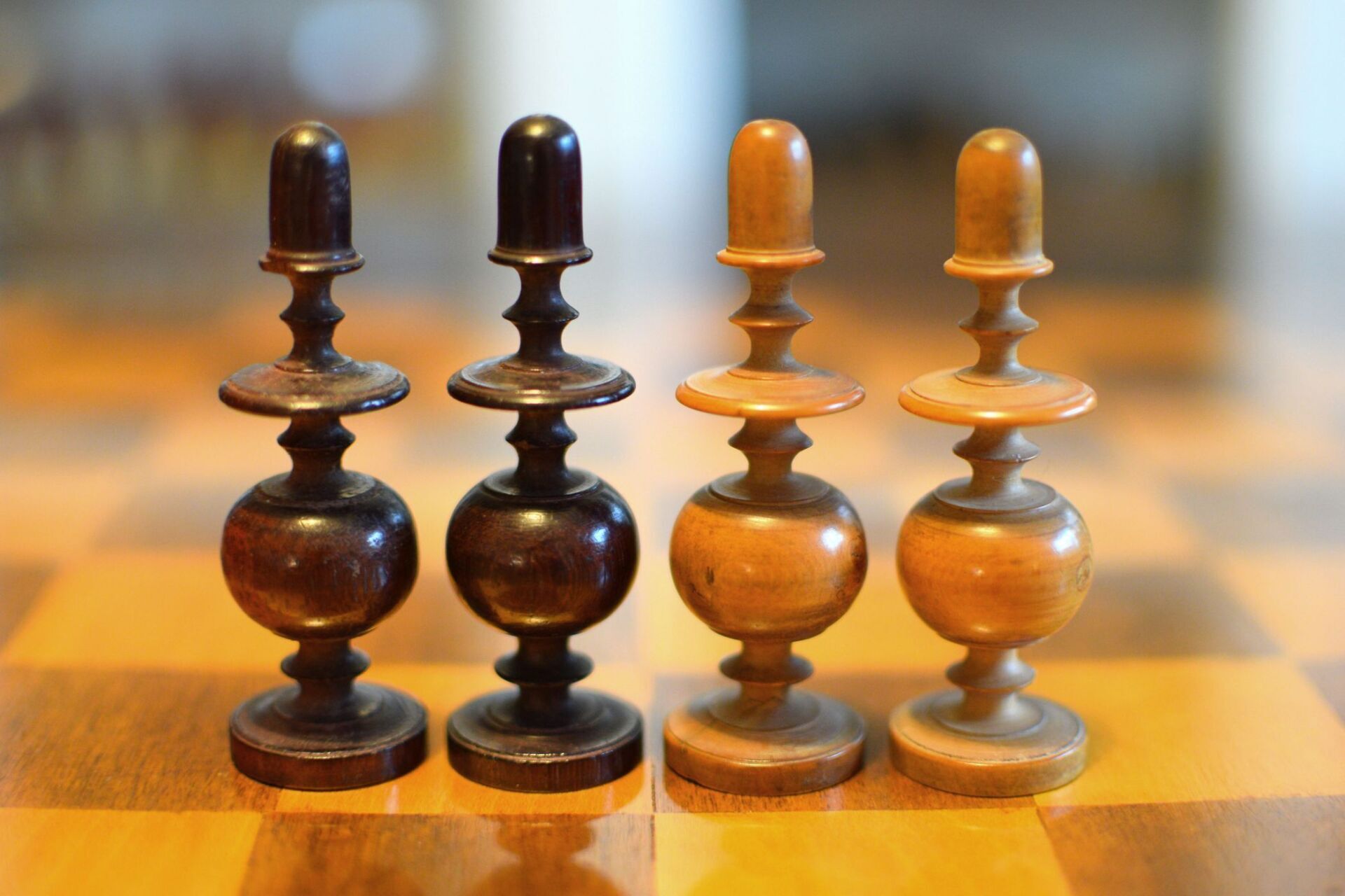 Here is a chess set of a renowned provenance. These chessmen belonged to the Gareth Williams collection. In fact, the exact same set is shown on pages 38/39 of Williams' famous book "Master Pieces". There has been a certain discussion about the distinction between chess sets in the Régence style and those in the Directoire style. In his book, Williams labels this set a Régence set. However, in his excellent article "Régence or Directoire" by Jim Joannou in The Chess Collector Magazine, Vol. XXIX No. 2 2020, p. 9 et seq. Jim gives some good reasons to regard this set as a Directoire set rather than a Régence set. According to Jim Joannou the distinguishing feature of a Régence set is the knight, which must be taller than the bishop and must have a horse's head, while the knight in a Directoire set must be taller than the bishop, but be of abstract design. The latter is the case here, because instead of the horse's head the knight here has some kind of cap shaped head. Apart from that, the overall design is similar to the late 18th / early 19th century Régence sets with tulip crowned kings, bishops with triangular collars and pawns with slim shafts on rounded bases. The pieces are turned from boxwood and rosewood. King size is 90 mm.