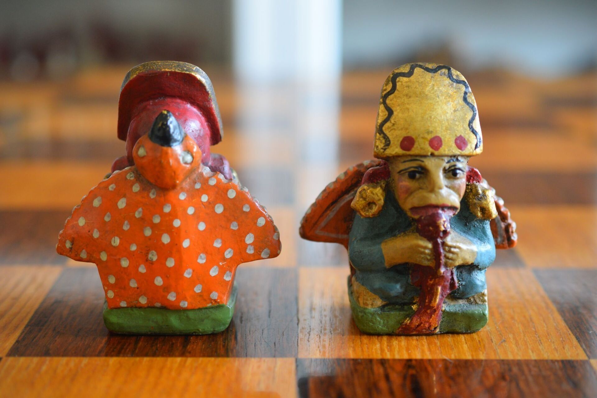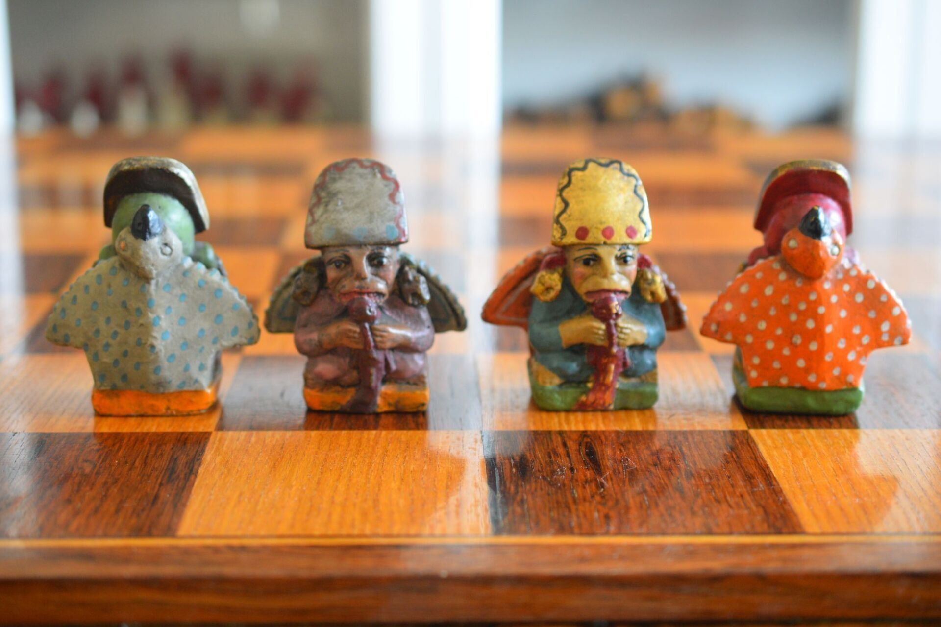 A figural chess set presumably from the second half of the 20th century and made in Middle or South America. The set is very large with a king size of 10 cm and massive and very heavy pieces (shown here on a chess board with squares of 8.5 cm / 3.35"). But apart from that I know little to nothing about it. The motifs seem to relate to the Aztec or Mayan culture. The pieces are - at least partly - made of wood and colourfully lacquered. I am not sure, however, if wood is the only material. It could be a material mix including also parts made of terracotta or clay. Further, I have no idea if my setup is correct, i.e. if all the pieces are associated with the right position.