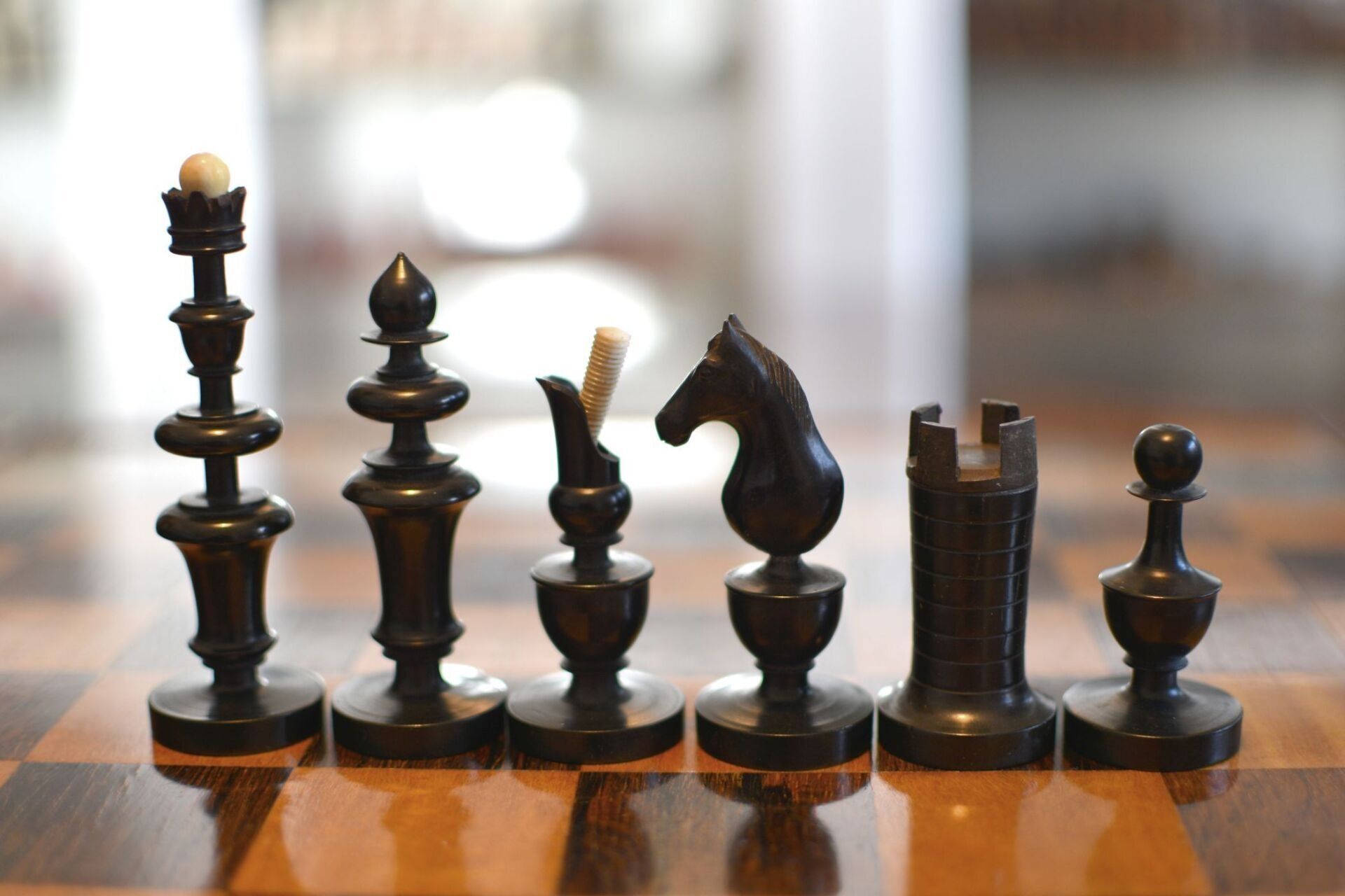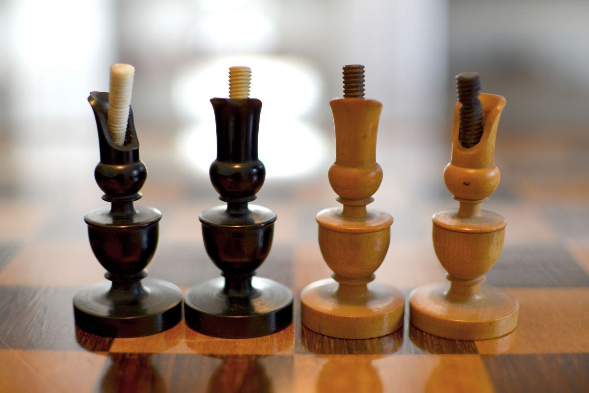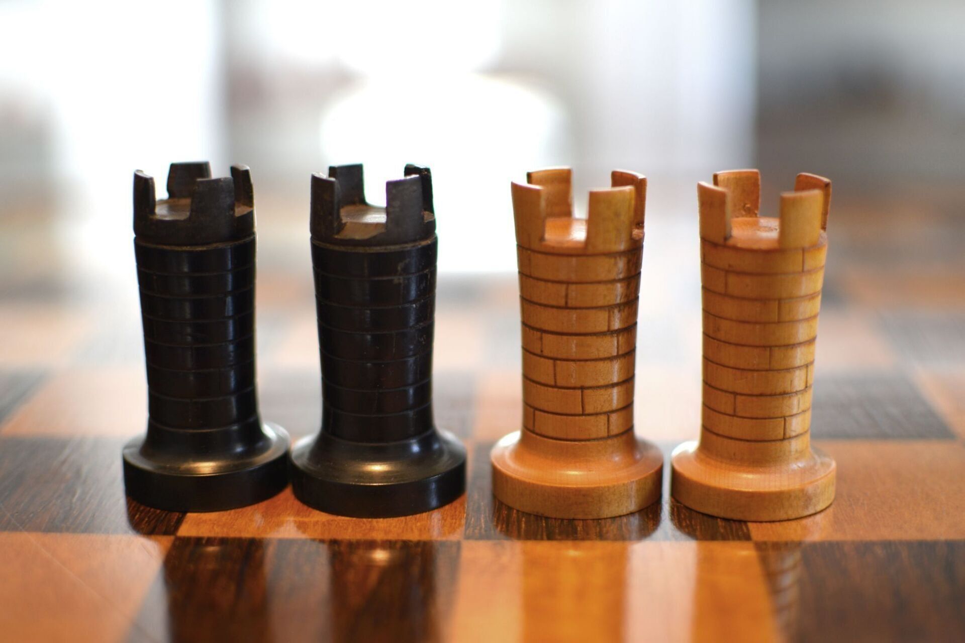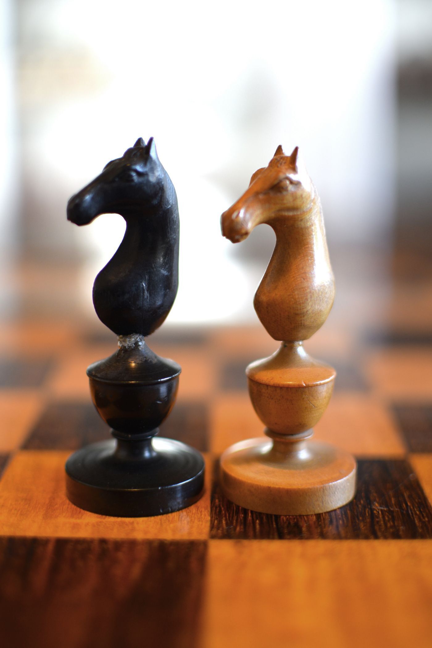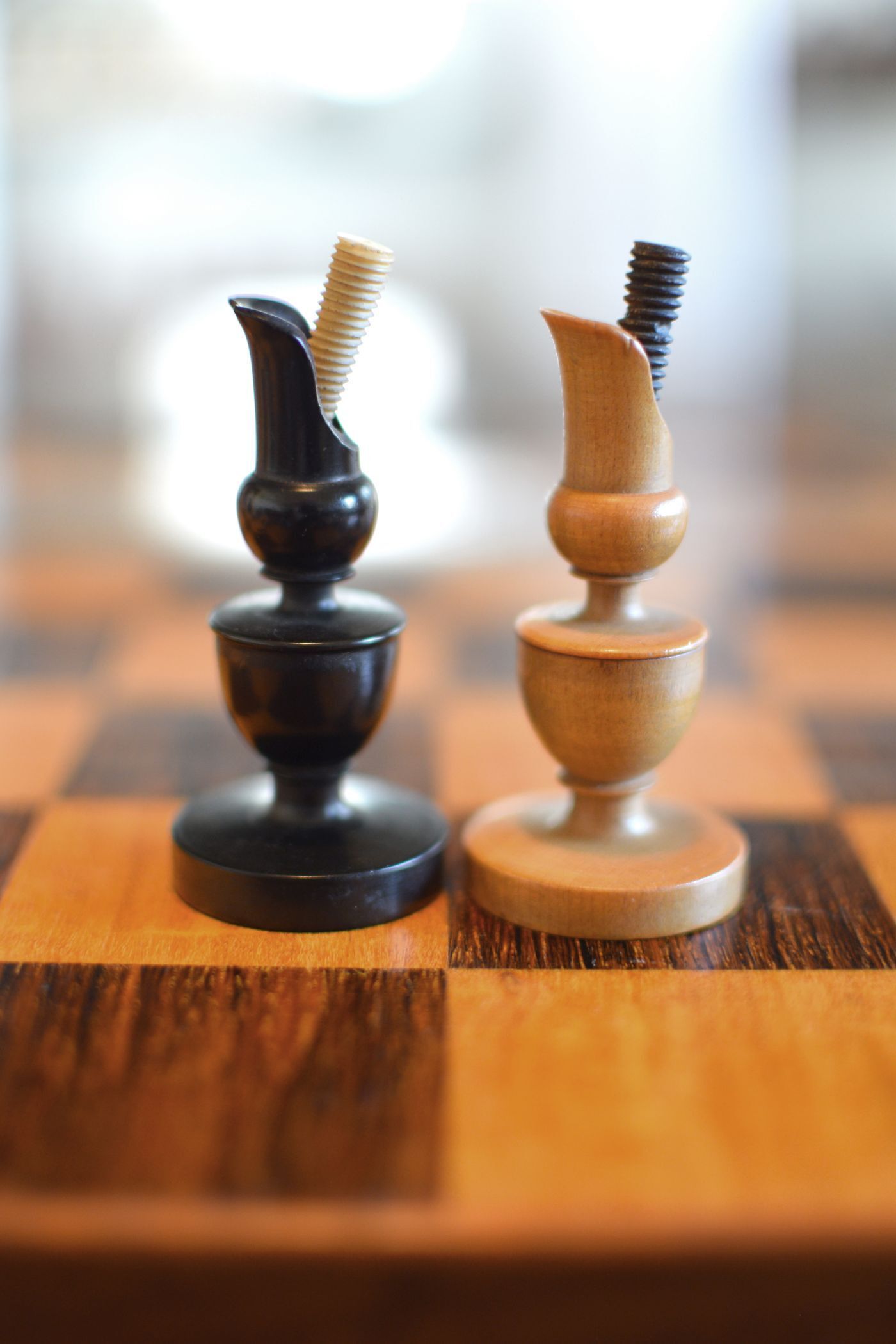 A wooden chess set, presumably from South Germany or Austria. The white pieces are made of boxwood, the black pieces of ebony. The king size is 97 mm (3.8"). The kings of unusual shape with slender shafts on an elongated baluster base topped with a circular crown and a ball finial in the opposite colour, on the white king made of wood dyed in dark brown, on the black king made of bone. The queens of smaller size and with a drop shaped head instead of a crown. The bishops show a very close resemblance with bishops from the early Biedermeier period, i.e. with lyre shaped heads and an elongated feather (in this also resembling feathered high hats common for certain officers in the 19th century military, see here). The knights as elegantly carved horses. The rooks as turrets with carved brickwork and four elongated crenellations. The pawns with baluster bases and a ball finial. All pieces on circular bases.